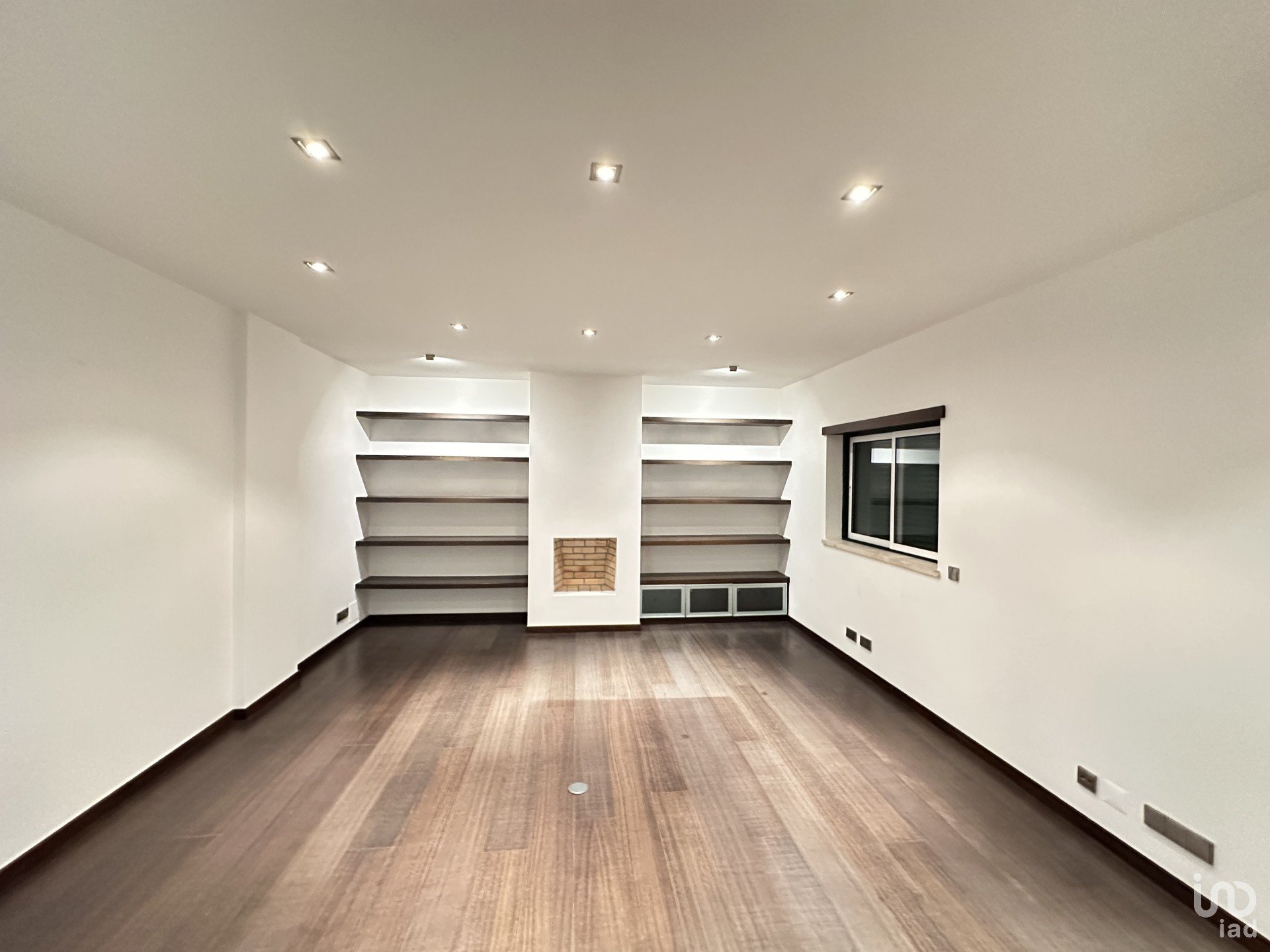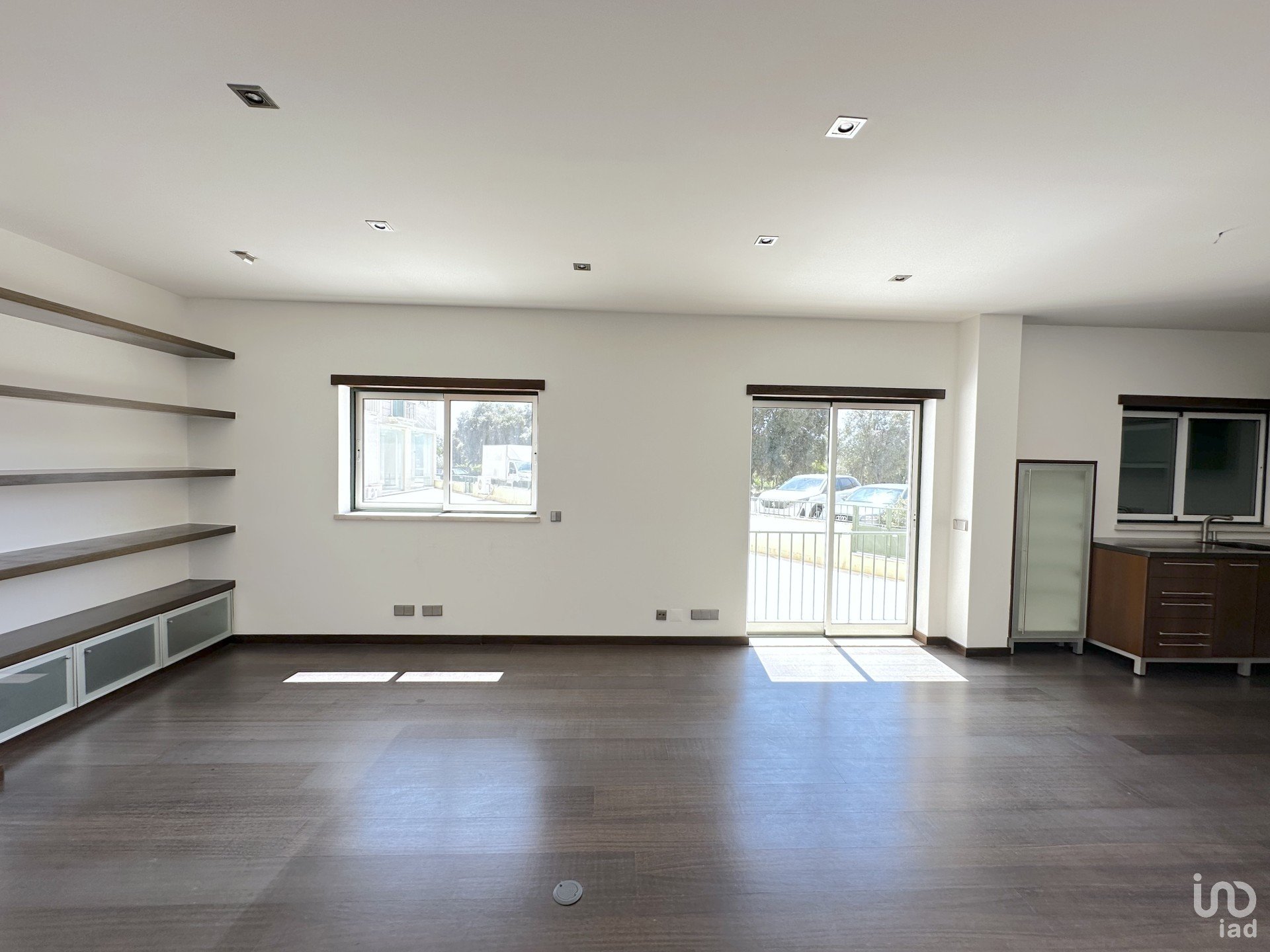 Sala e cozinha em open space (equipada, tampo Corian, exaustor Míele, esquentador Vulcano, espaço para eletrodomésticos encastrados, lareira decorativa, estantes flutuantes).