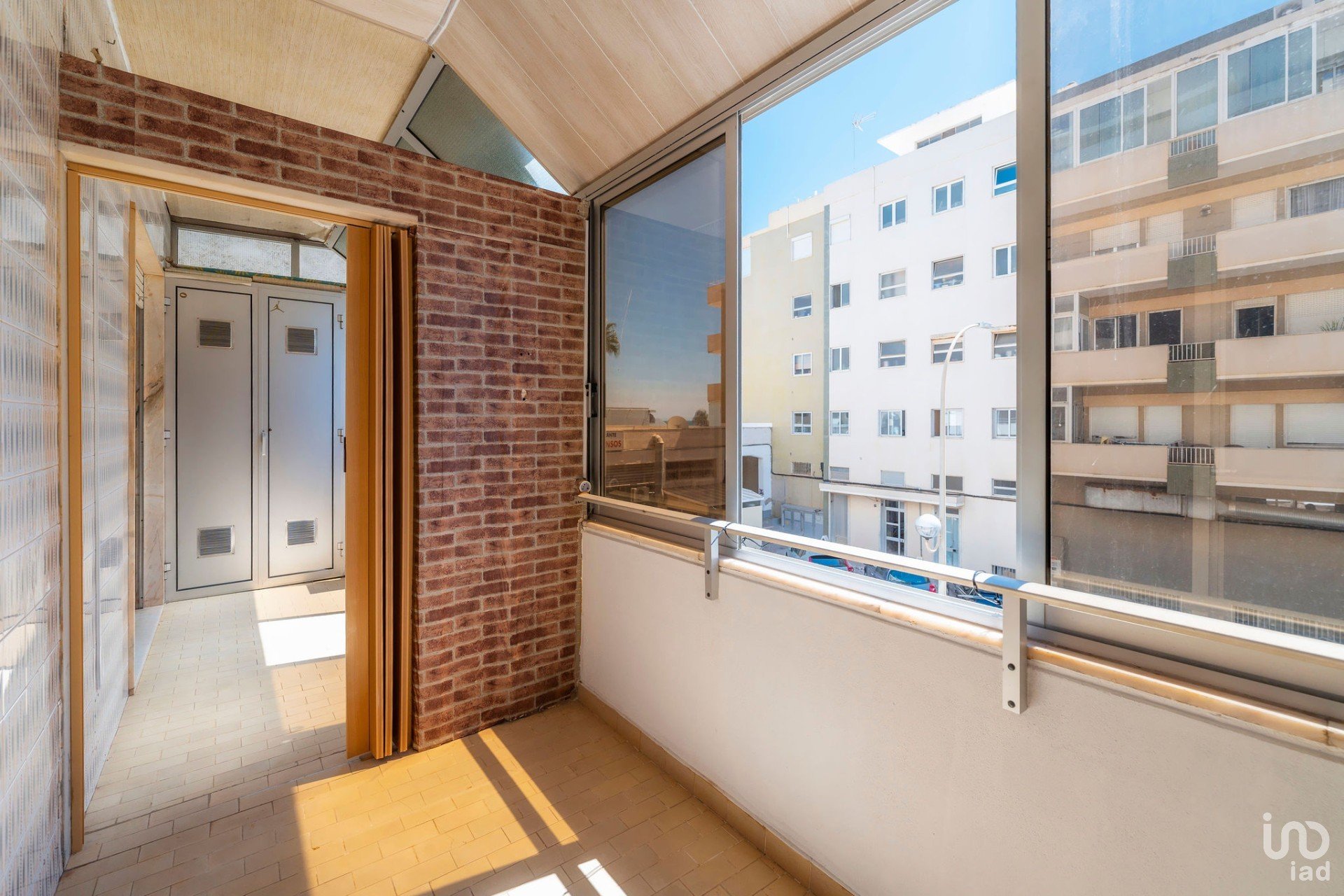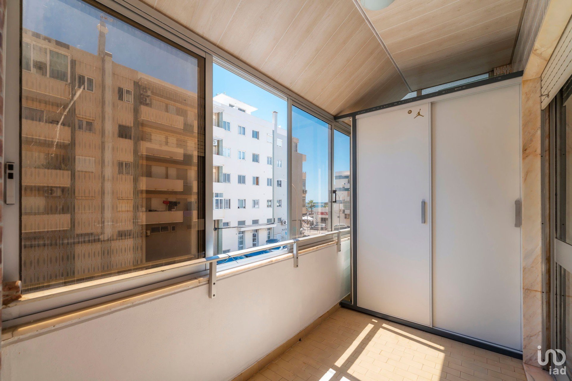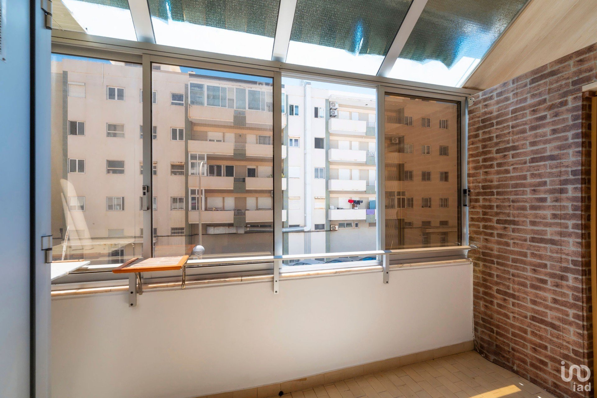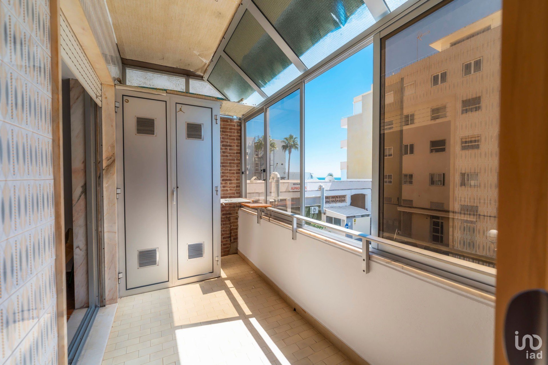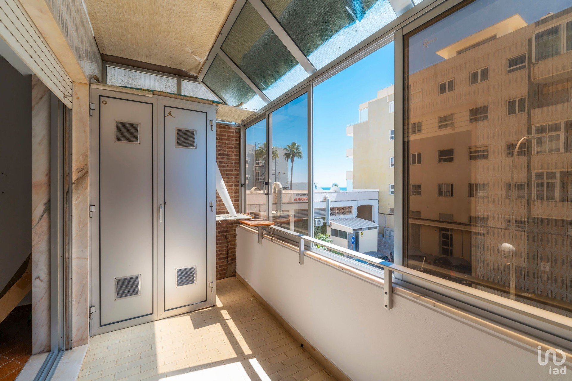 Varanda envidraçada virada a sul, com vista aberta para o mar e para a avenida