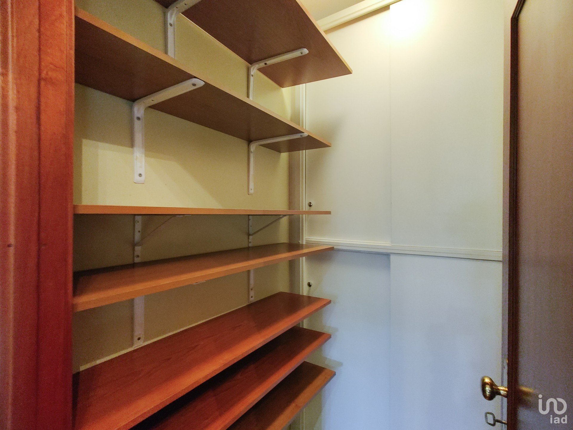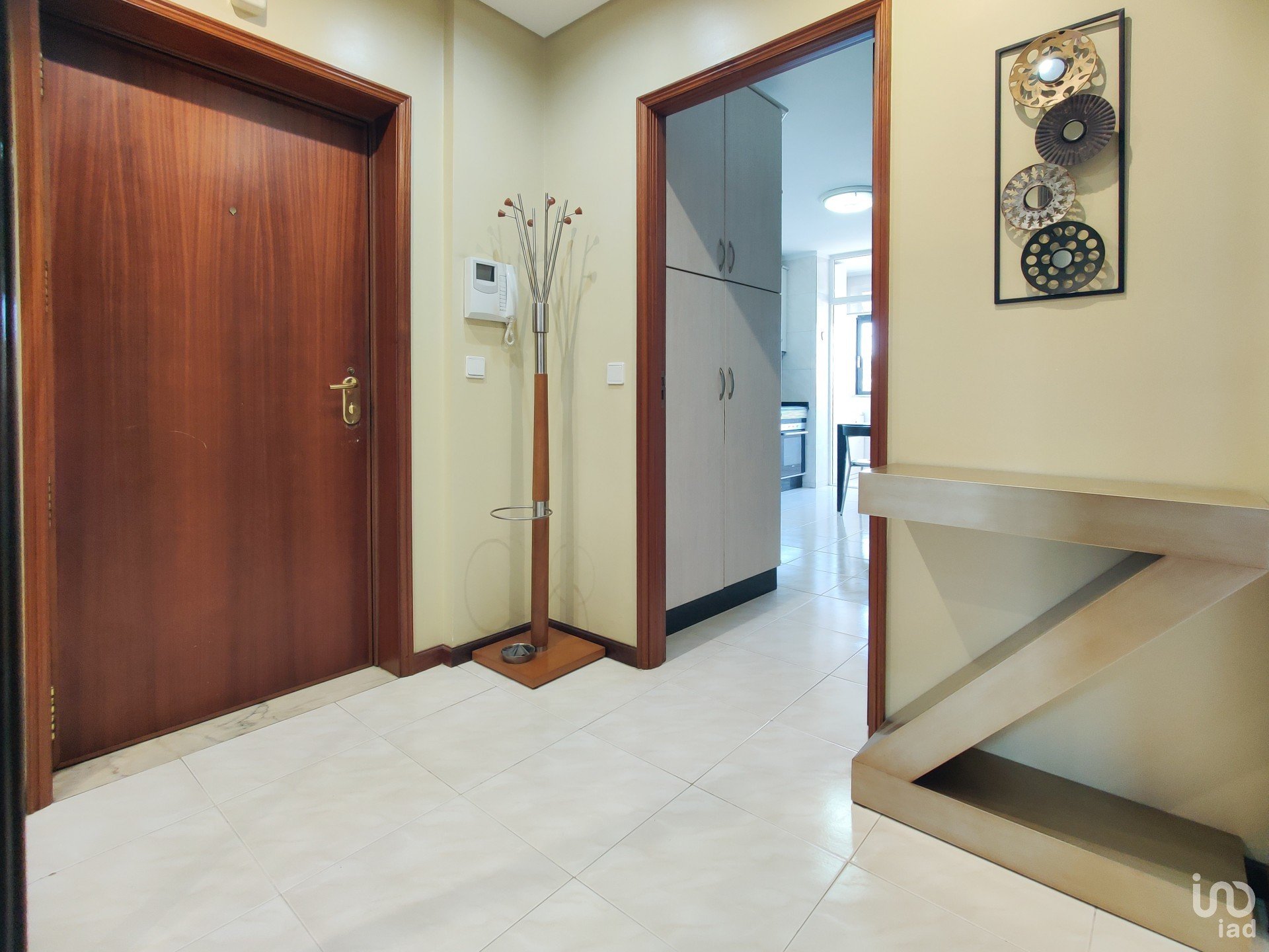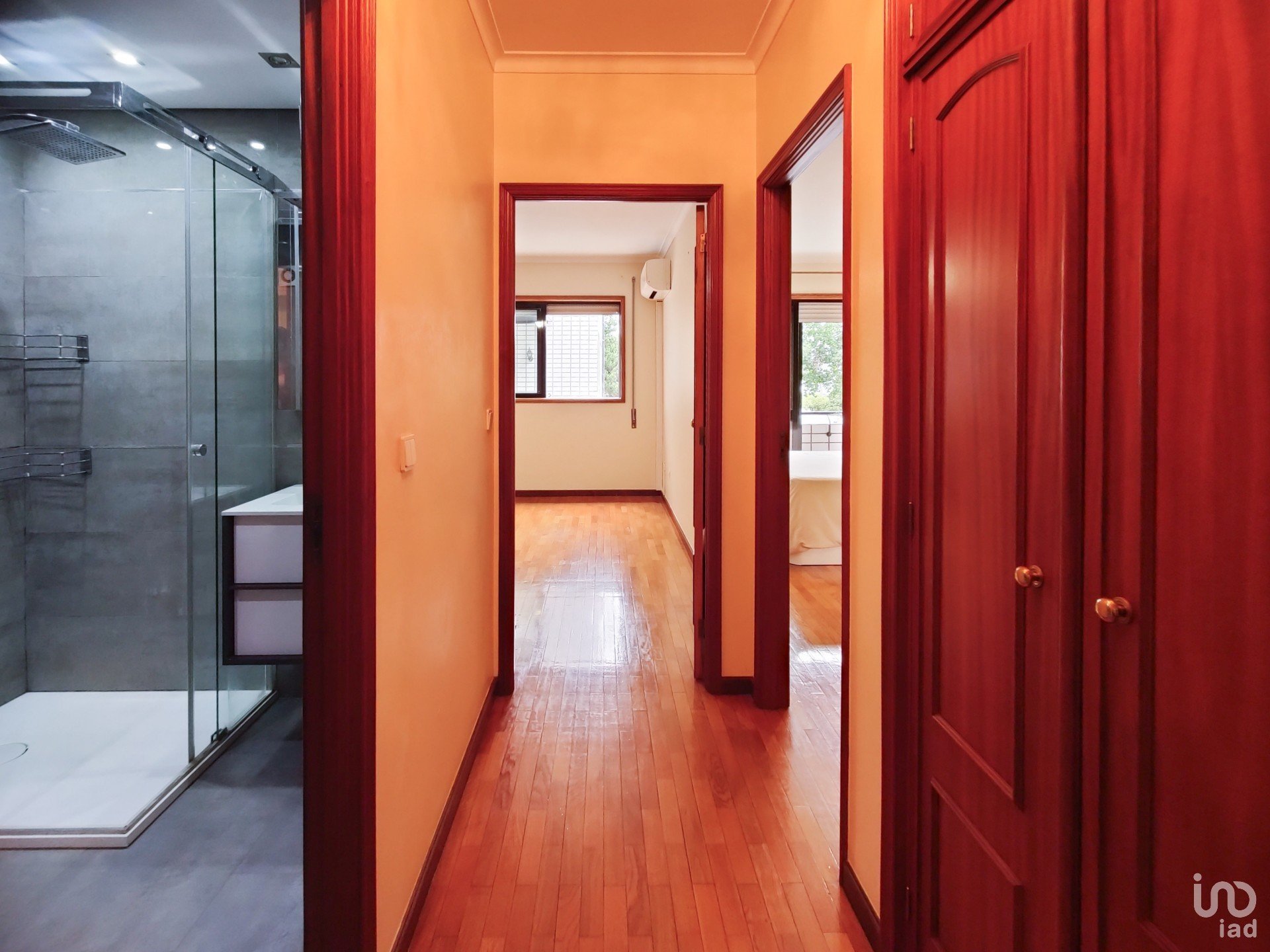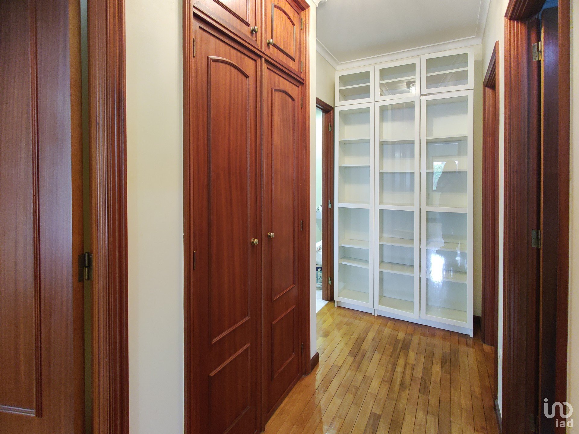 O corredor reserva ainda mais soluções inteligentes de arrumação: um roupeiro extra e uma despensa com prateleiras e armários, porque o detalhe faz toda a diferença. A casa de banho de apoio, recentemente remodelada, acrescenta um toque moderno ao conjunto.