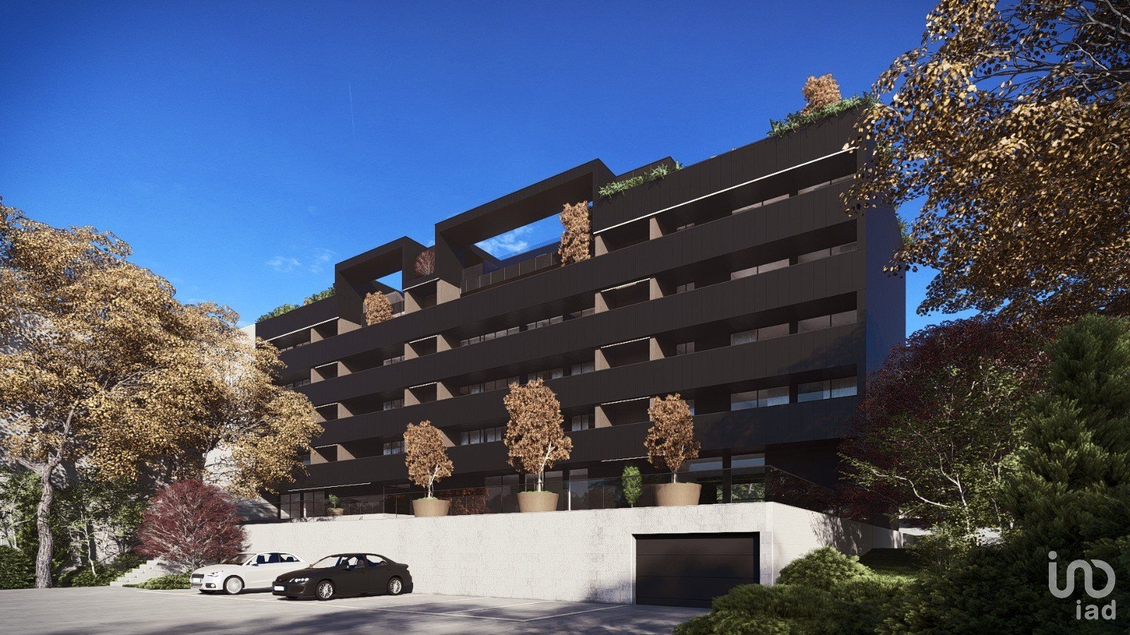 Estacionamento interior em betão aparente, com portão seccionado automático
