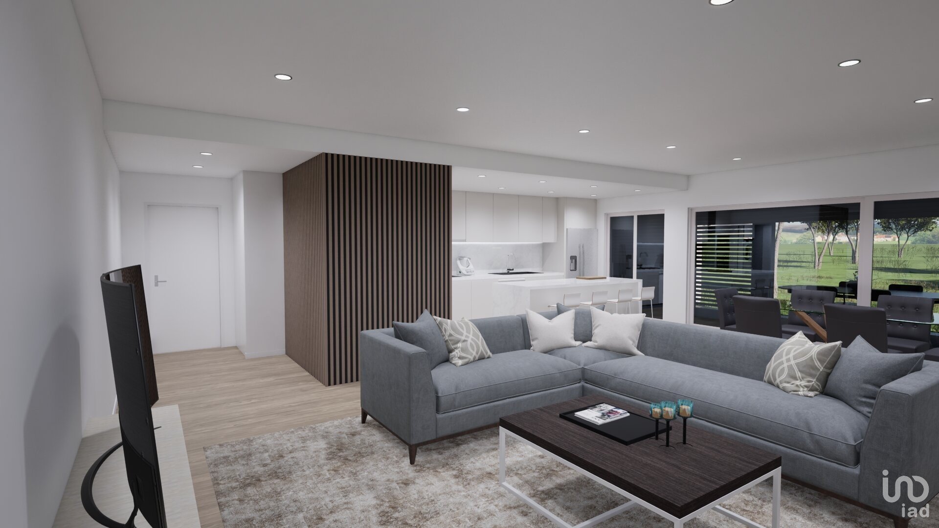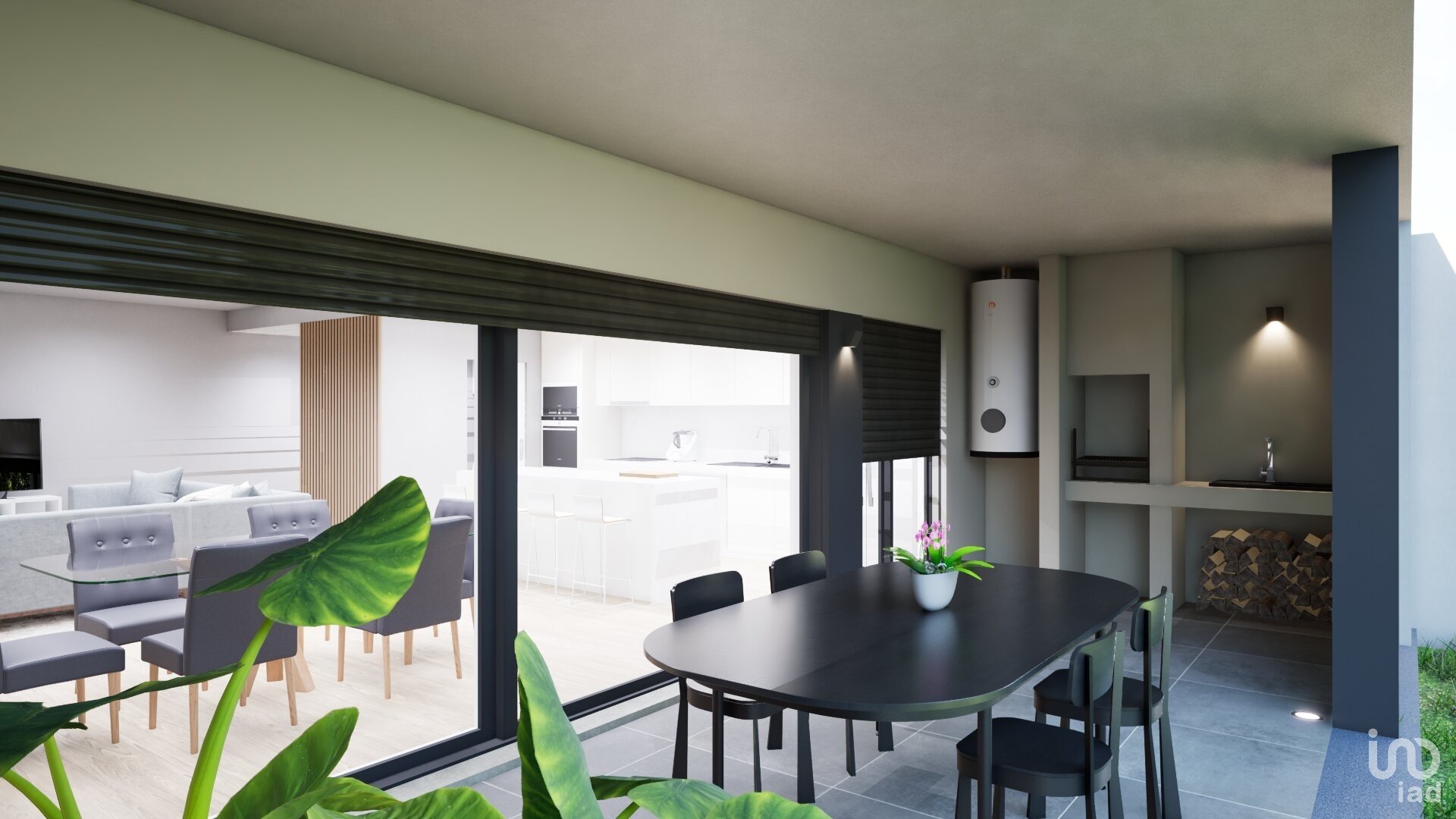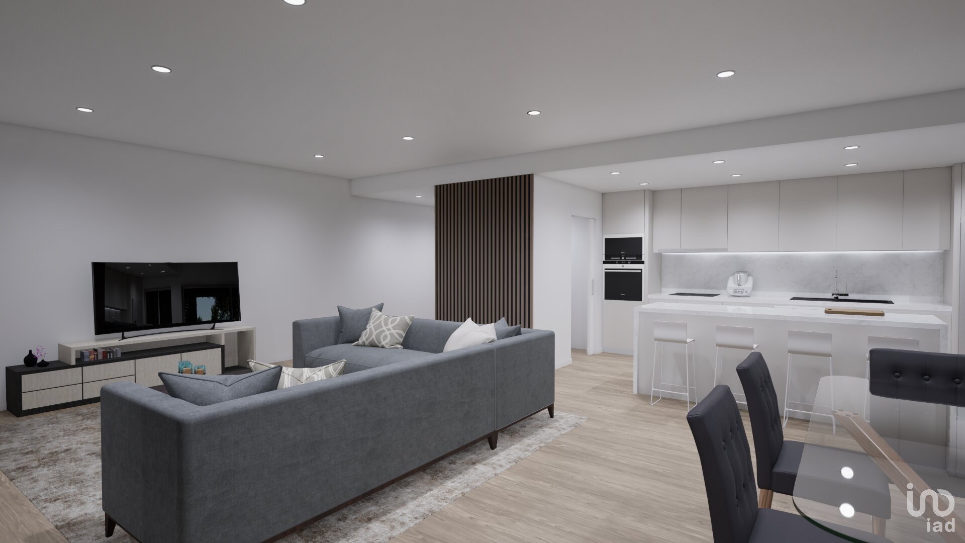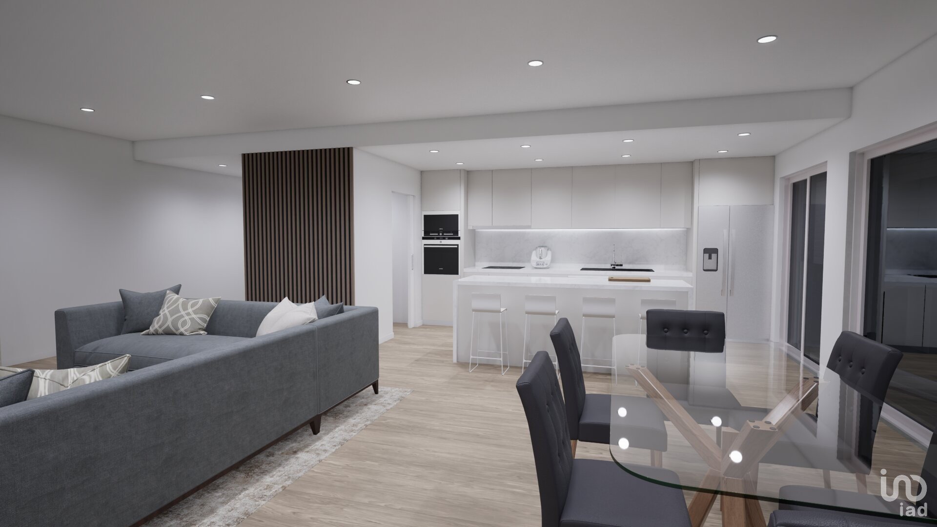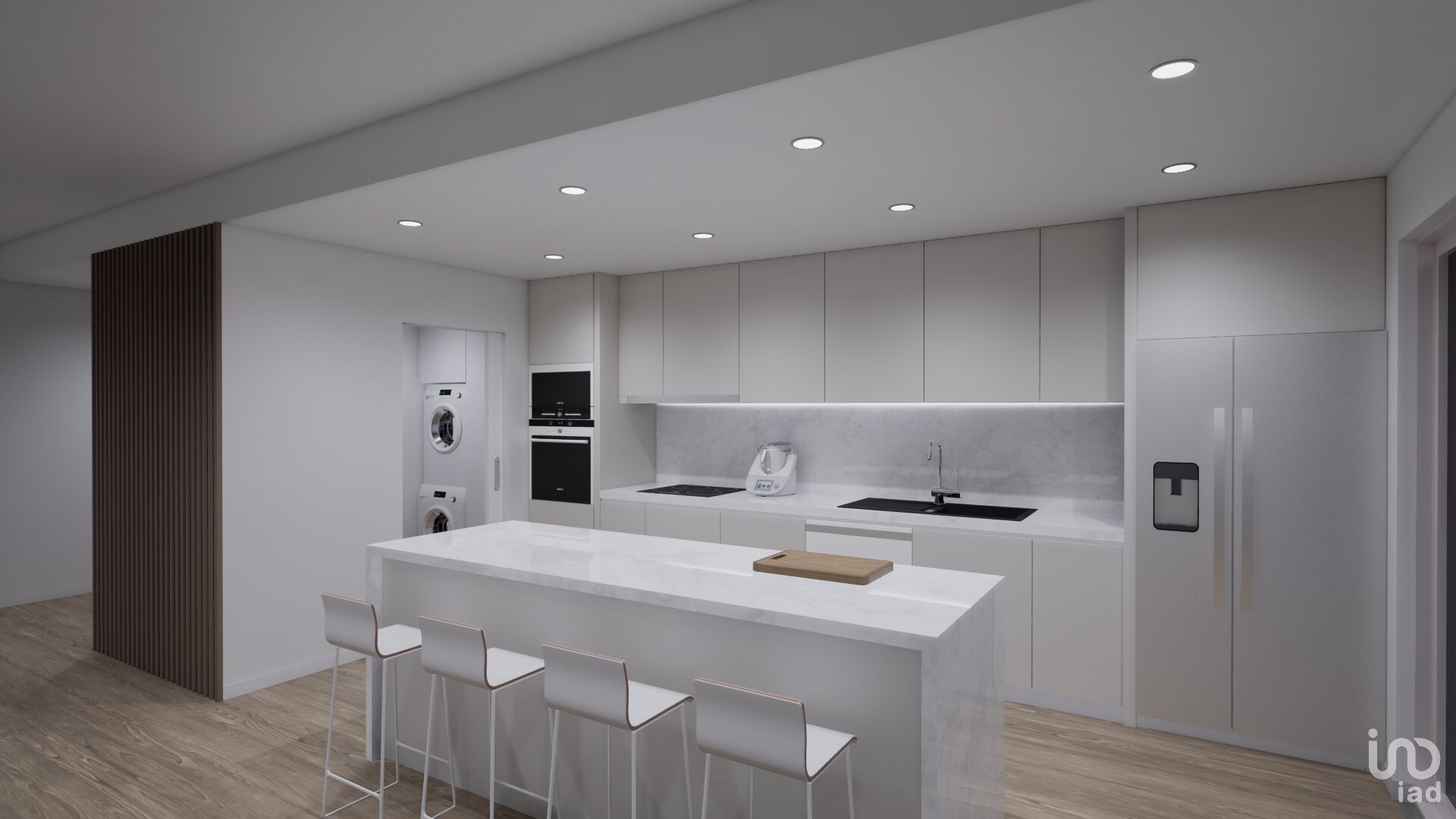 A cozinha open space com ilha, redefine sofisticação e praticidade, totalmente equipada (Exaustor, Placa elétrica de indução, Microondas, Forno, Máquina de lavar loiça e Frigorífico americano), garante uma experiência culinária intuitiva e confortável.