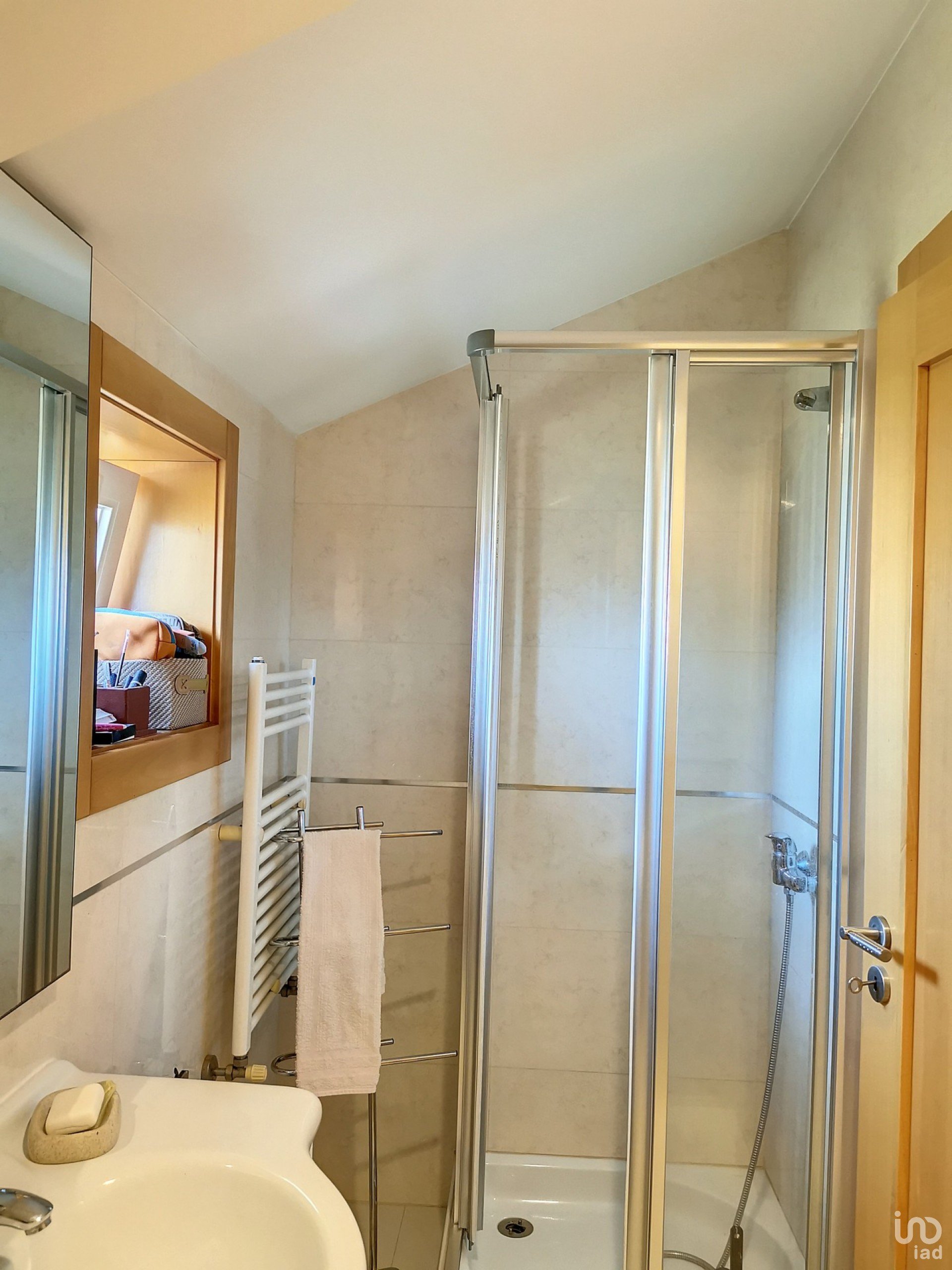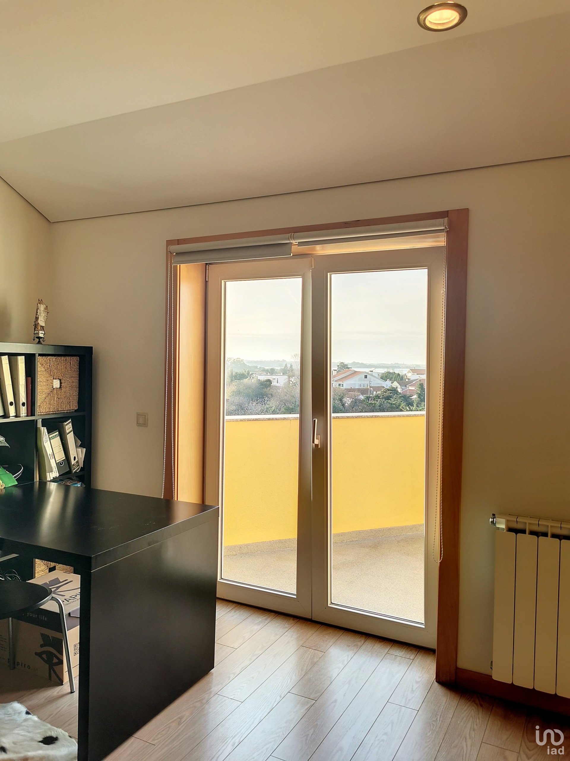 Subindo ao primeiro andar teremos uma sala com acesso ao terraço (42m2) que lhe possibilita uma bonita vista para a Ria de Aveiro, mais dois quartos (com armários embutidos e ambos com excelentes varandas), casa de banho completa e uma lavandaria.