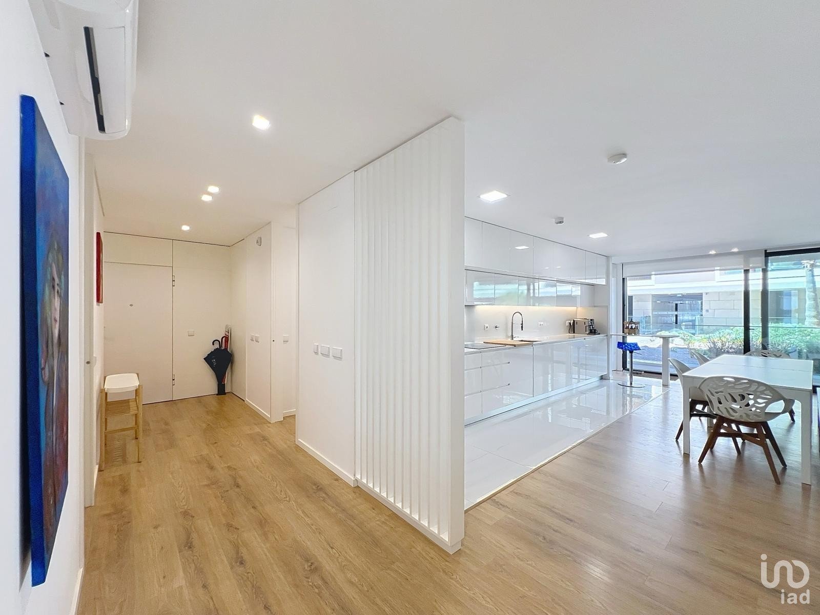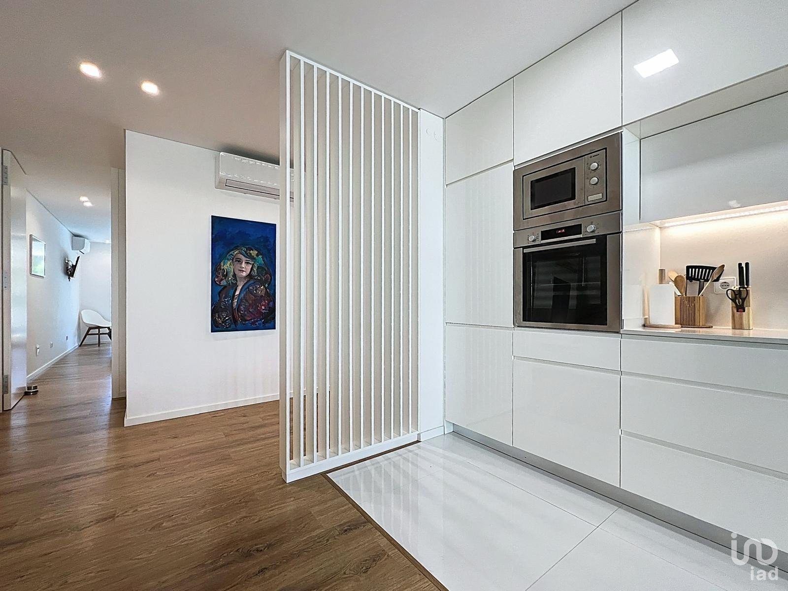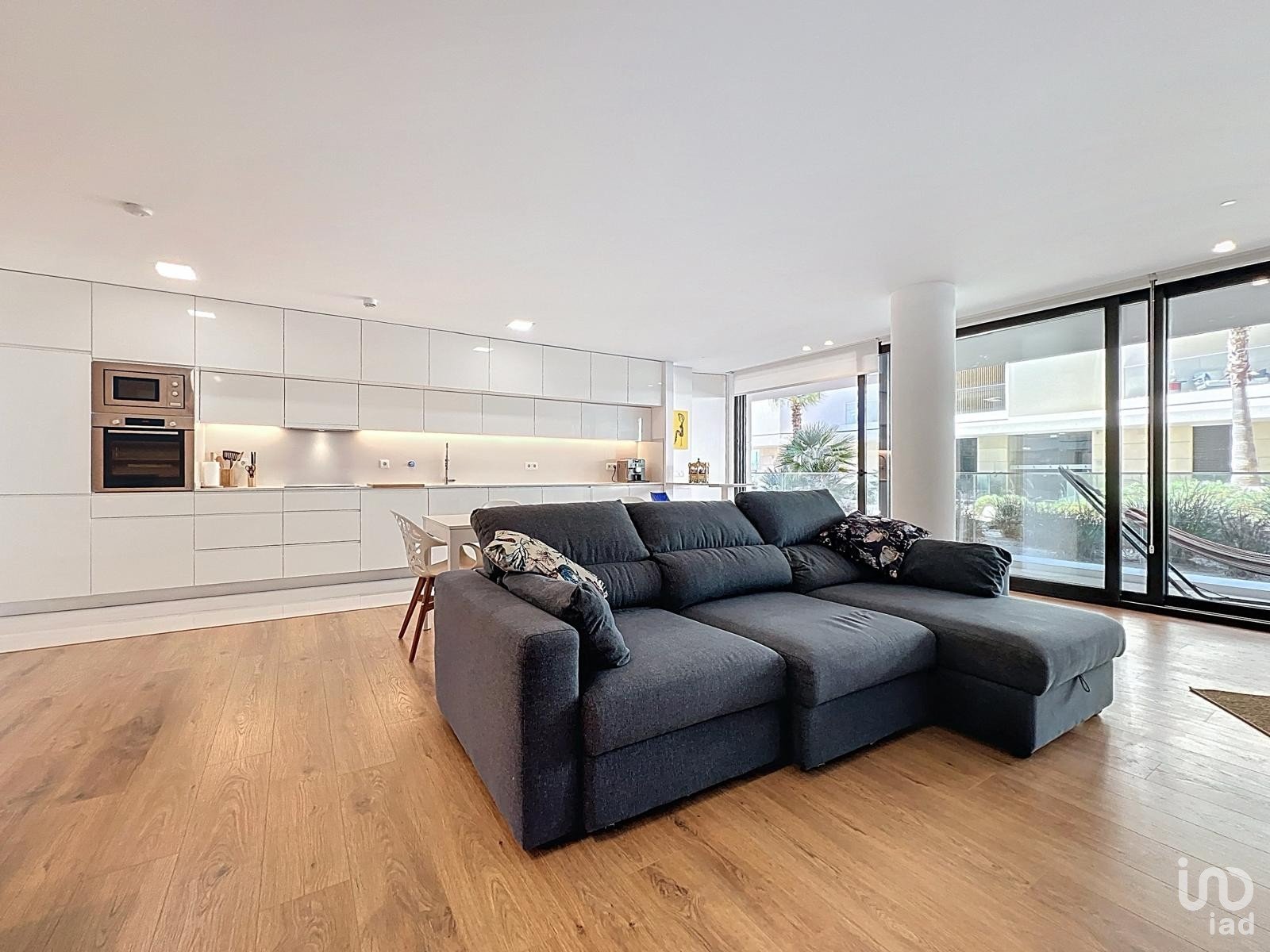 Cozinha em open space totalmente equipada com eletrodomésticos topo de gama, integrada numa sala luminosa de aproximadamente 50 m², perfeita para momentos de convívio.