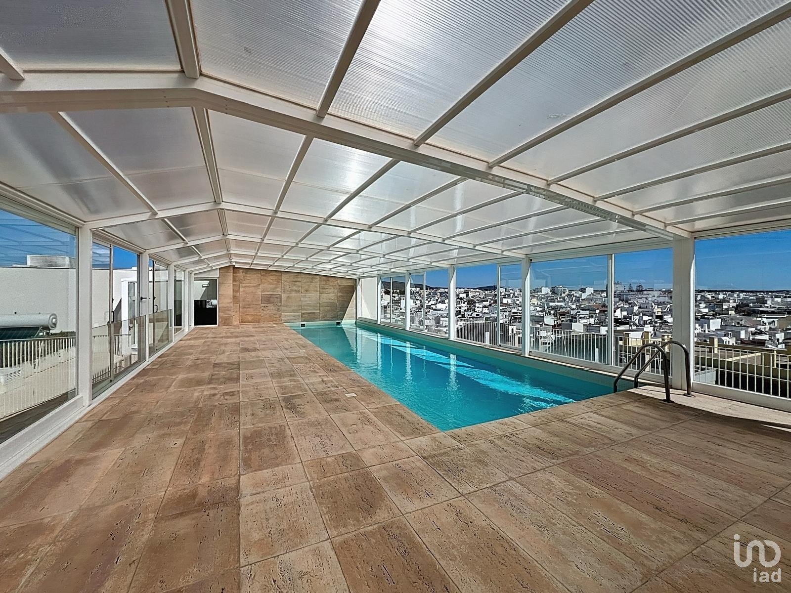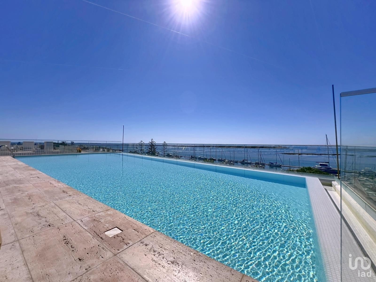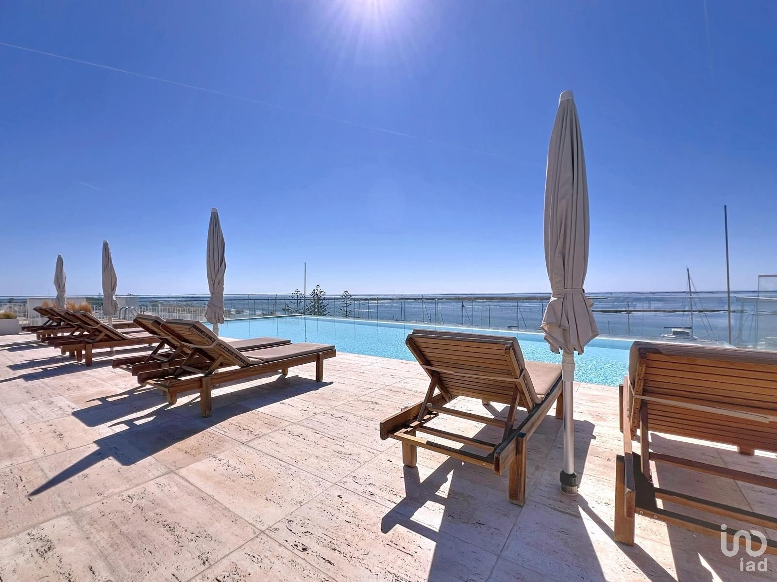 Duas piscinas panorâmicas no topo do edifício, com acesso por elevador e com vista única sobre a Ria Formosa.