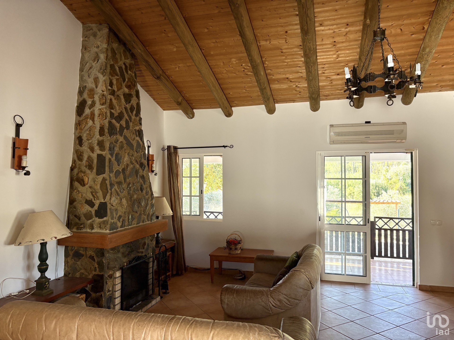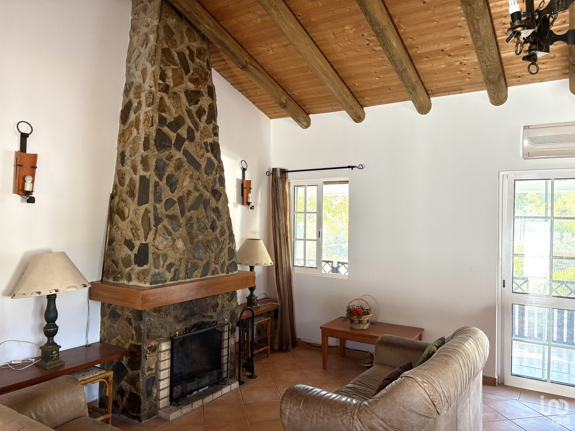 A sala de estar, com uma lareira tradicional em pedra, é ideal para os dias frios.