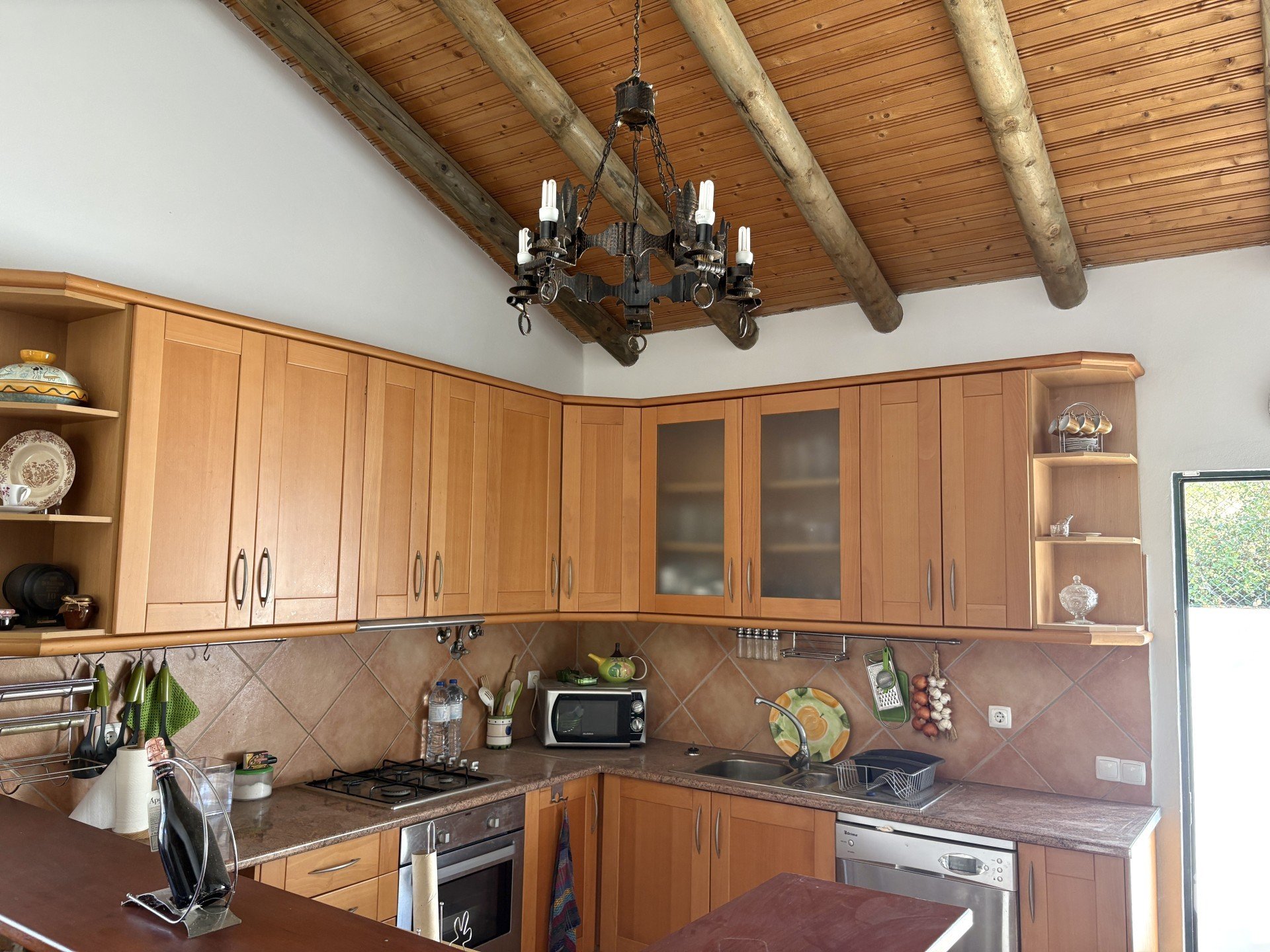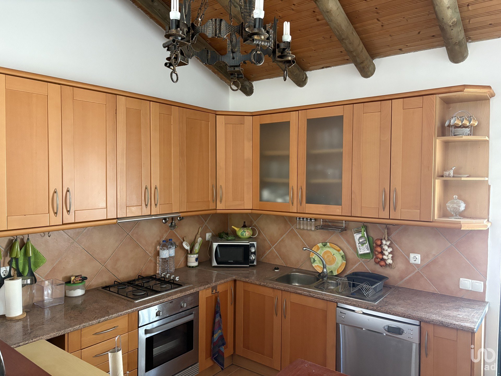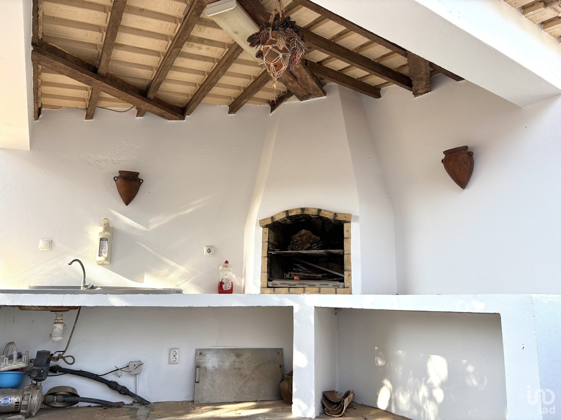 No exterior, irá encontrar uma zona de churrasco, coberta e funcional, equipada com churrasqueira e lava louça. O telheiro é perfeito para refeições ou para relaxar.
