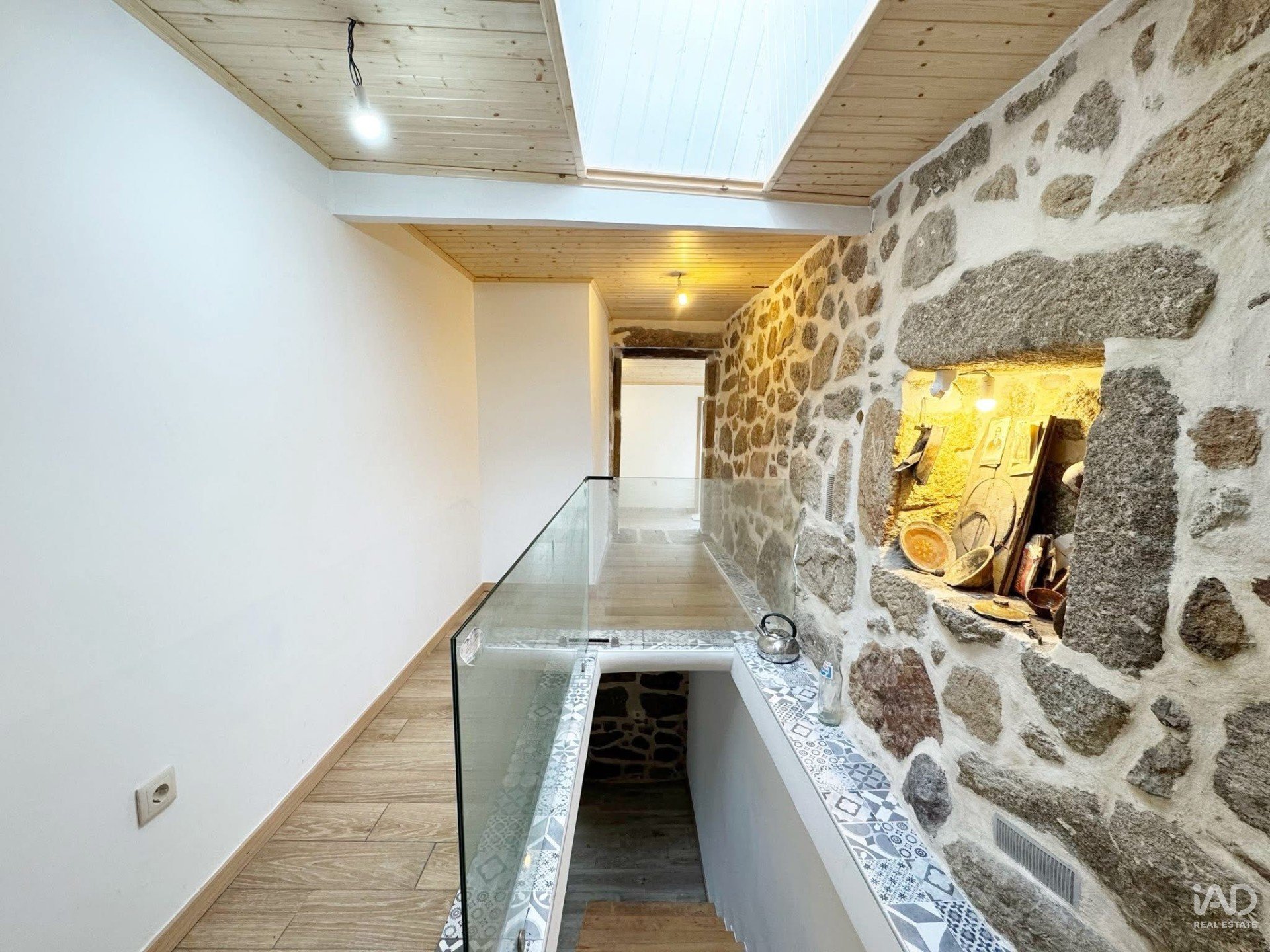 Subindo pelas escadas que também contam com . presença dos belos azulejos terá um hall com luz presencial automática que dá acesso a ambos os quartos e a mais uma pequena sala de estar com varanda e uma casa de banho com duche.