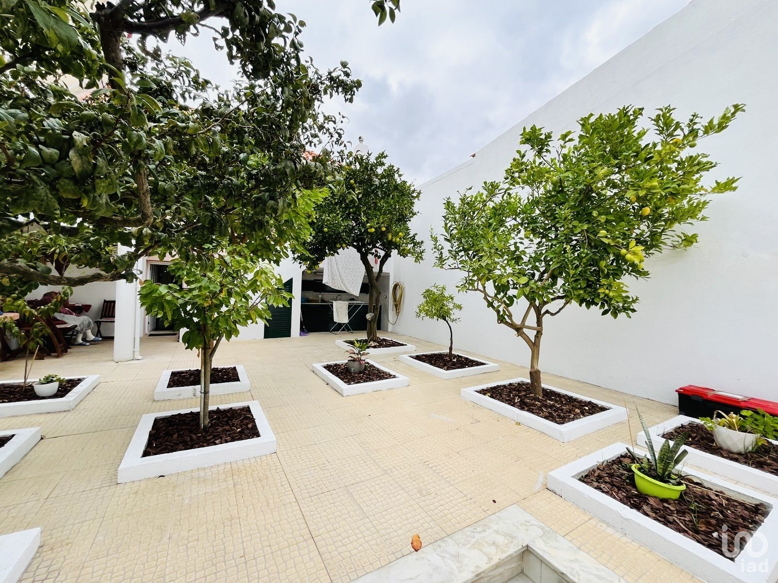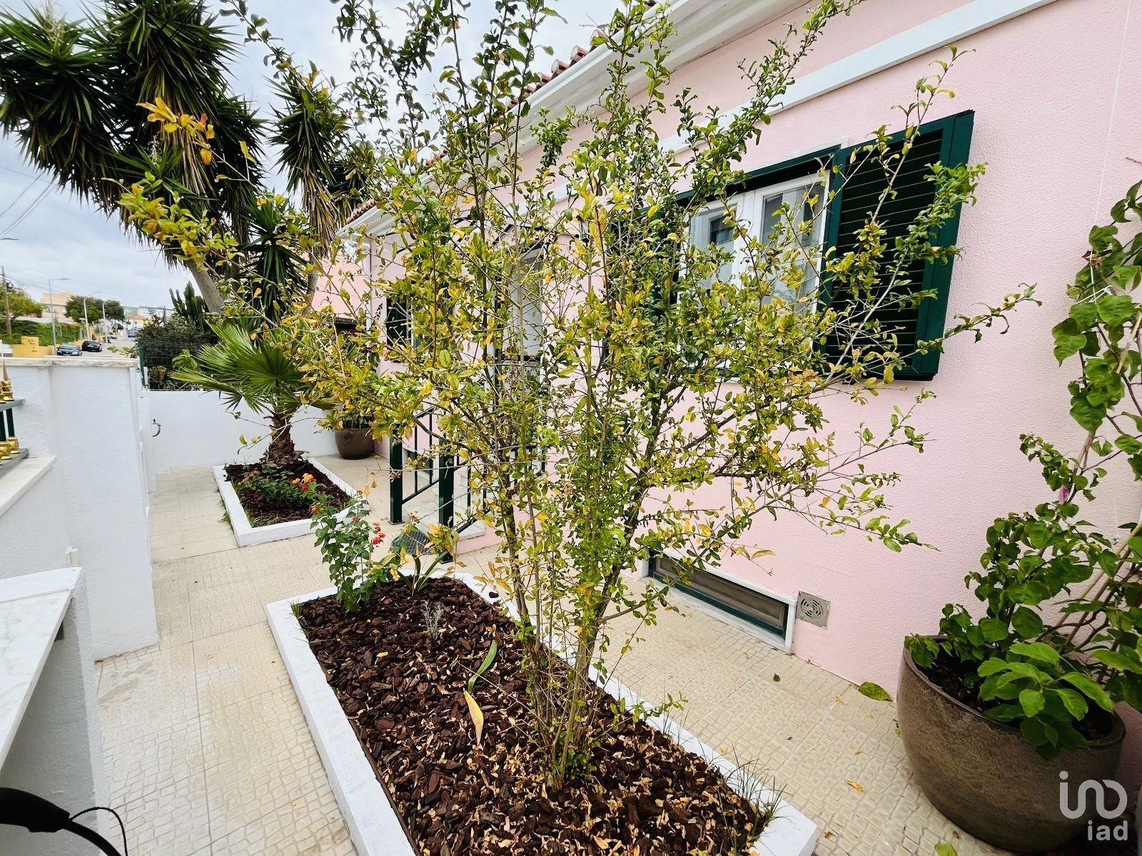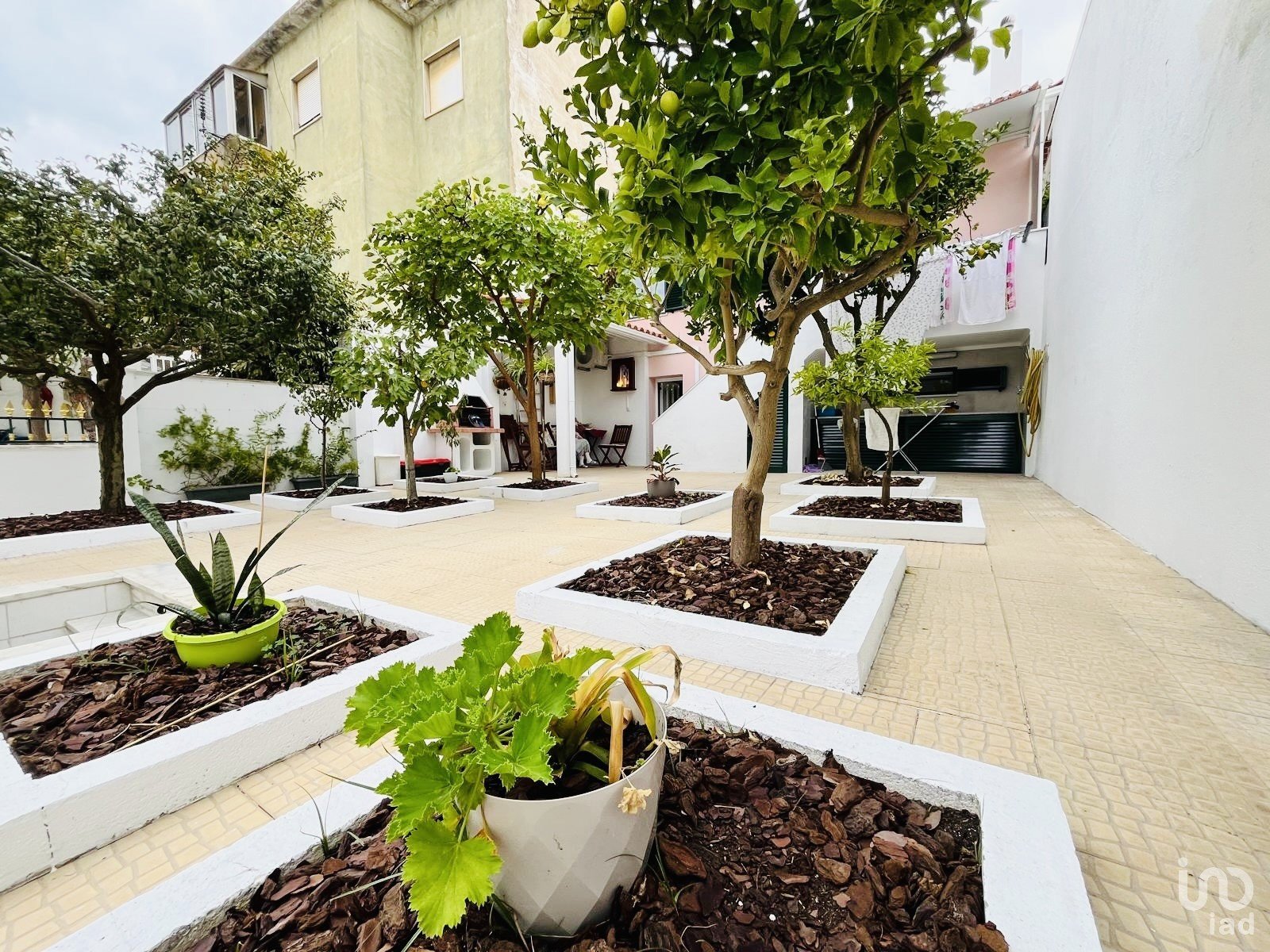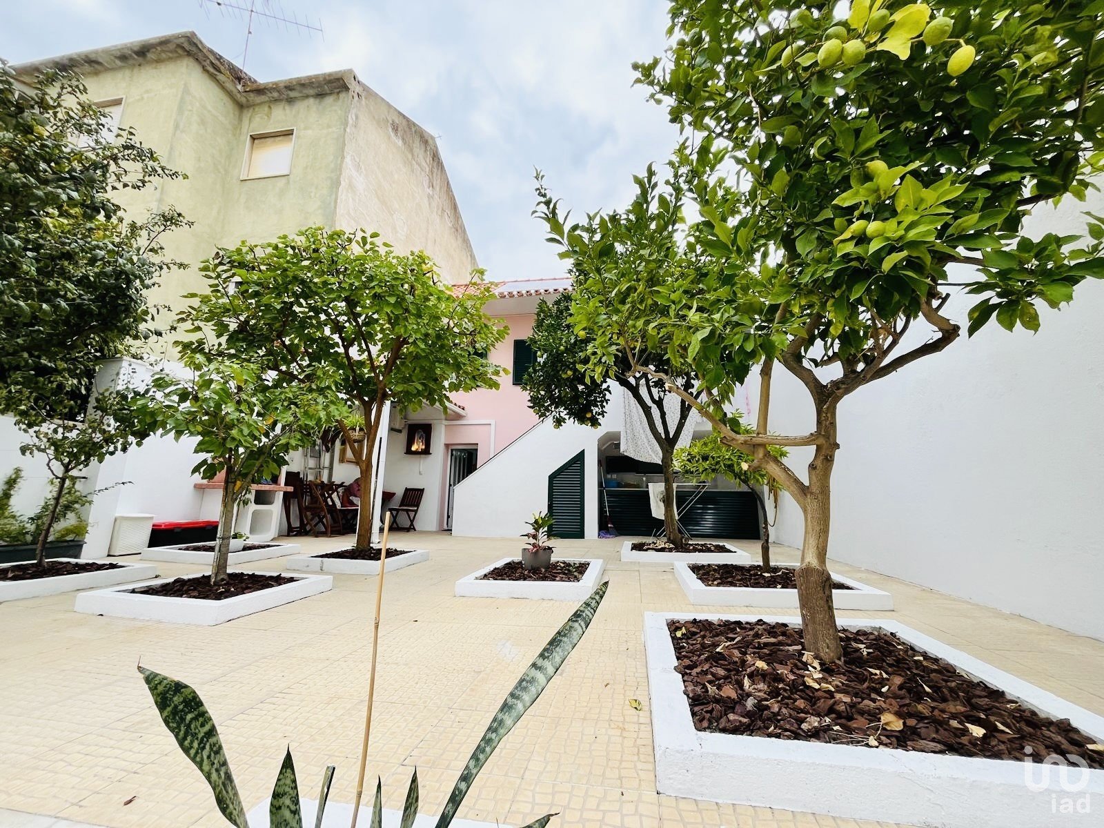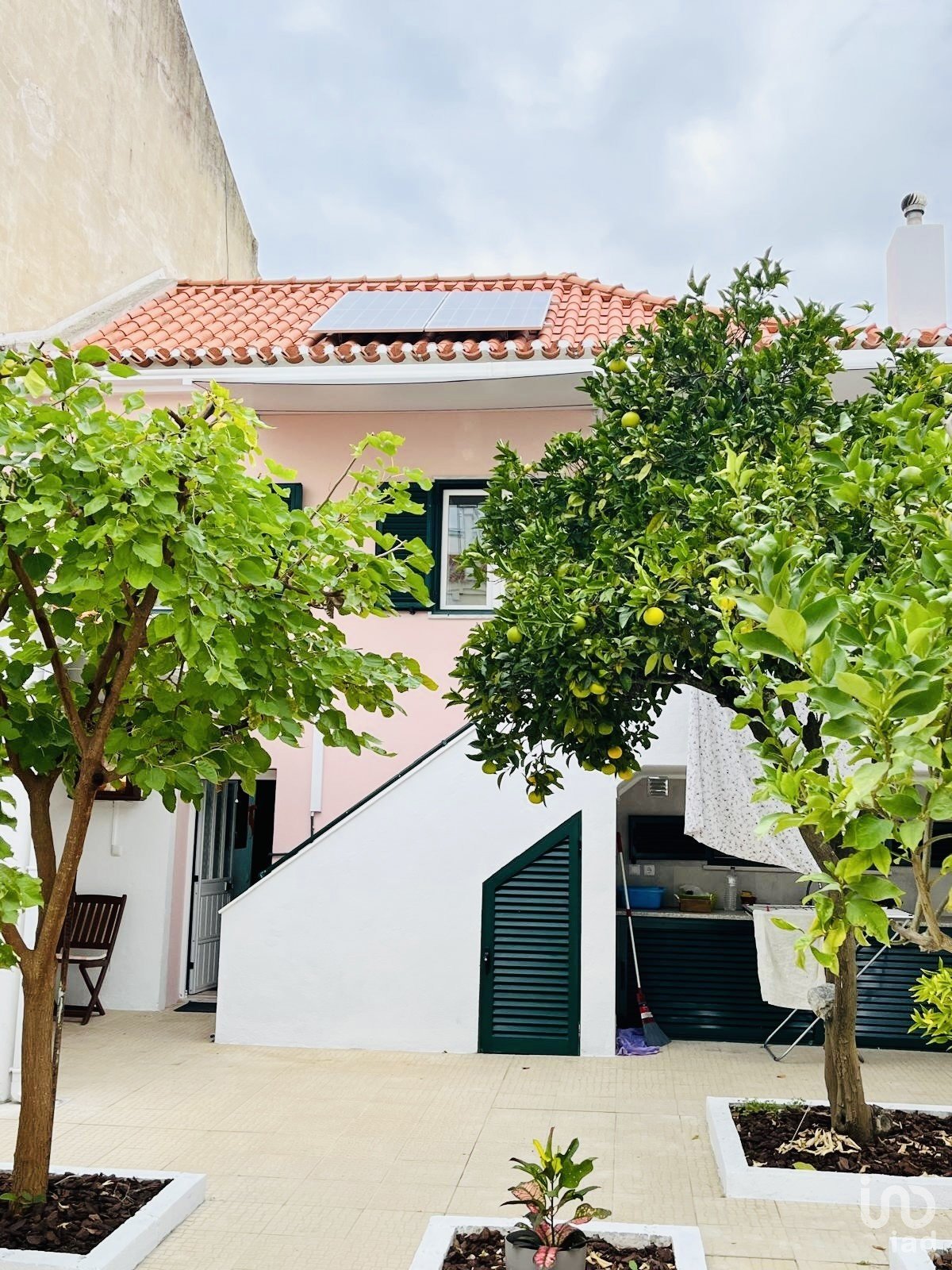 A partir da casa principal, uma escada conduz ao piso inferior, onde se encontra um jardim privado com árvores, um verdadeiro refúgio de paz no centro de Setúbal.