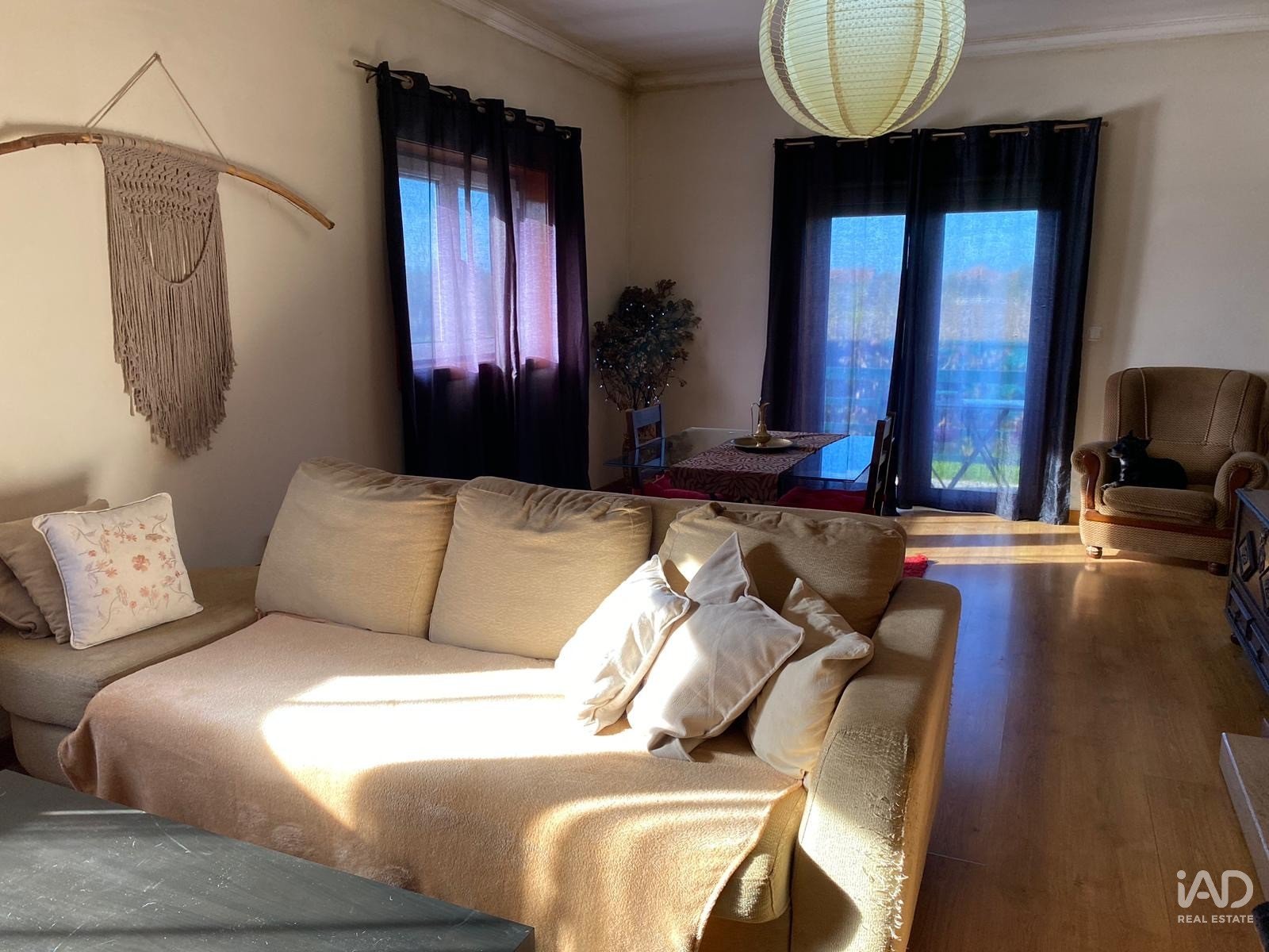 - Uma sala de jantar aberta para uma sala de estar e com acesso a varanda