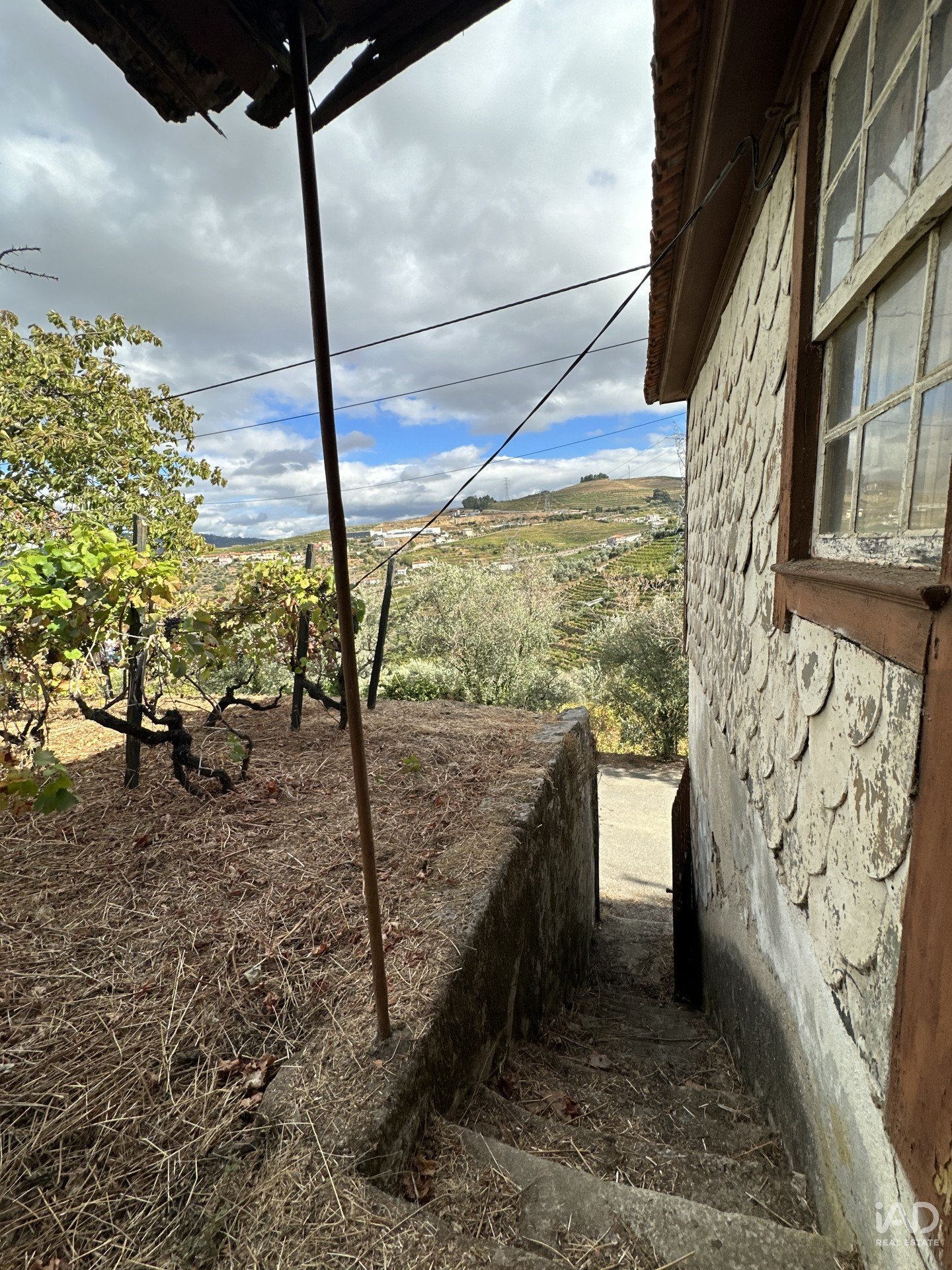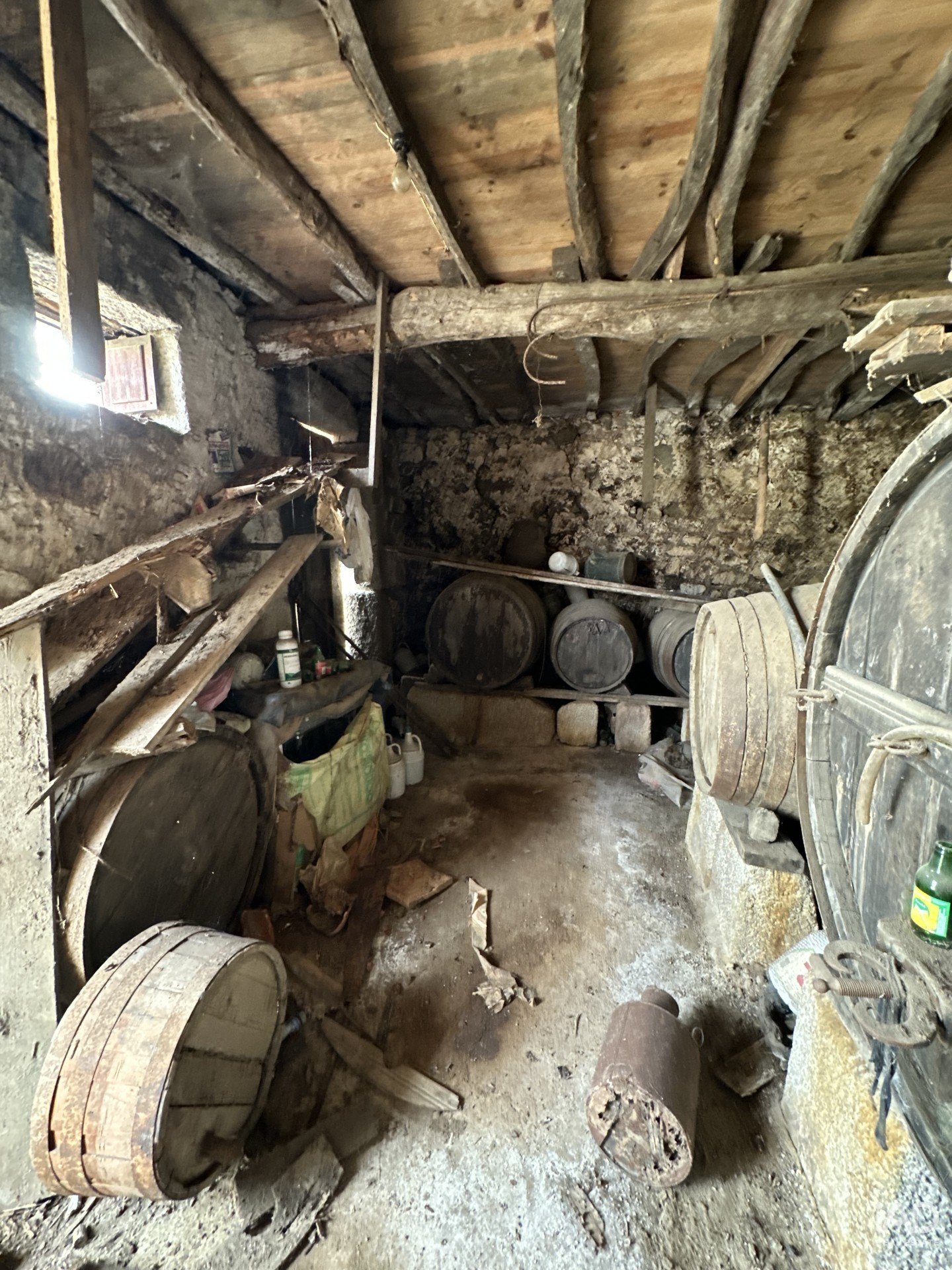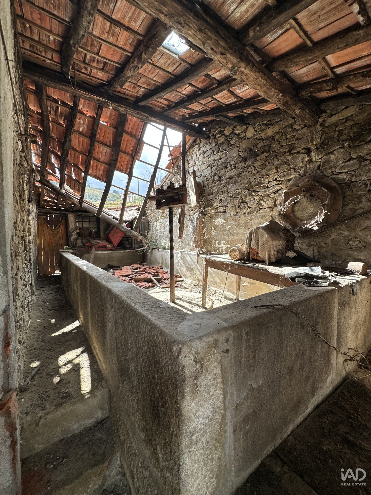 rústica a necessitar de renovação e um antigo lagar em granito no primeiro andar da casa, com sistema de vazamento para o rés-do-chão, onde antigamente se armazenavam as barricas de vinho.
