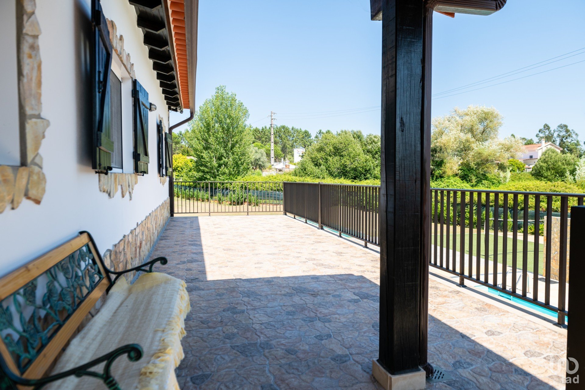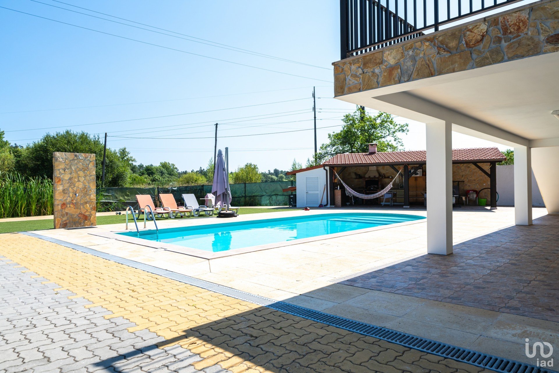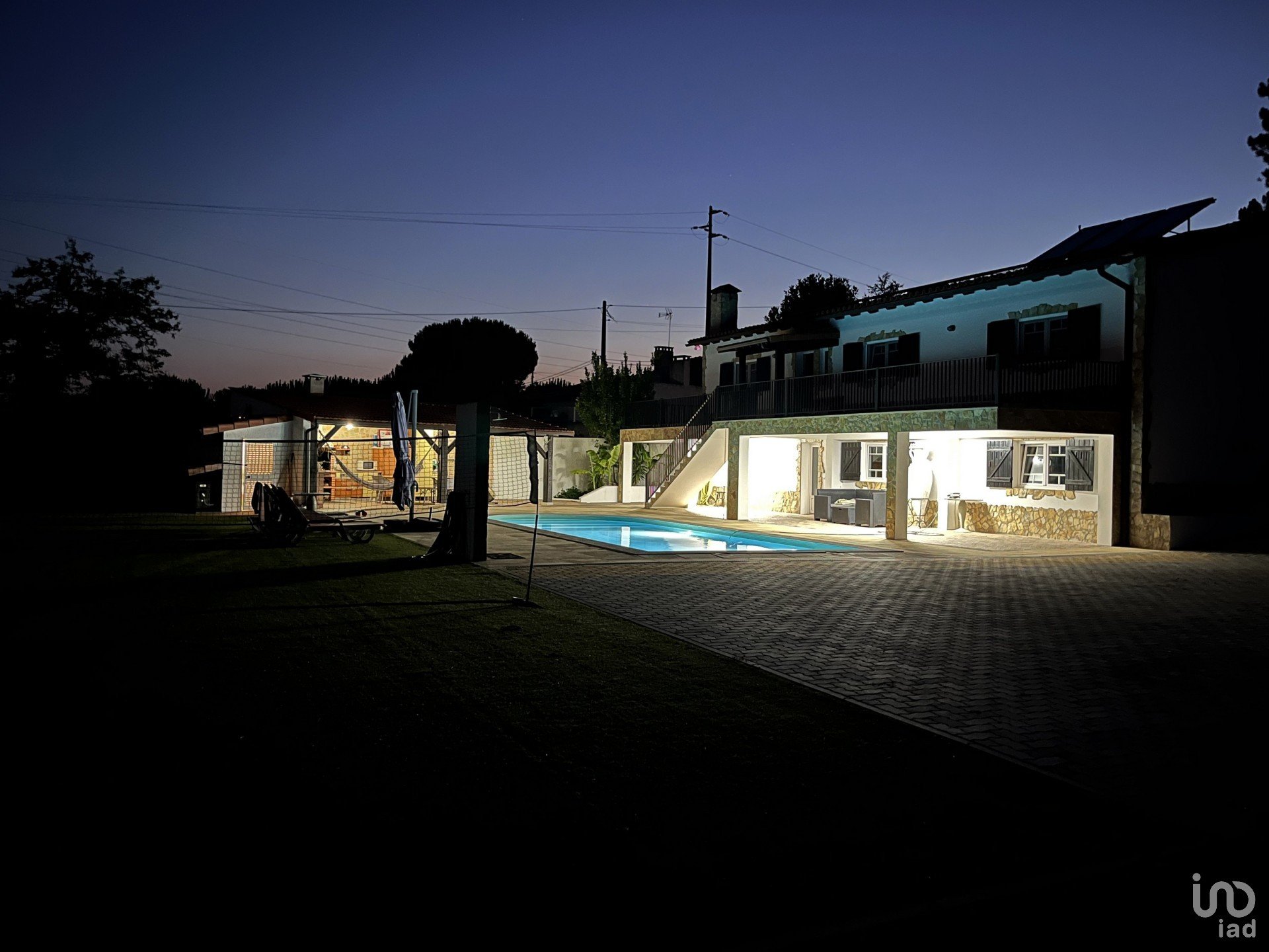 Exterior: Grande terraço a rodear a casa, portão automático de 6m para acesso ao quintal, piscina, etc. Estacionamento para mais de 6 carros. Piscina de 10×5 m com bomba de aquecimento, profundidade de 1,80 – 1 m e duche com água quente ao lado. Área de churrasco de 12×6 m em frente à piscina. Parque infantil com relva artificial de 40m².