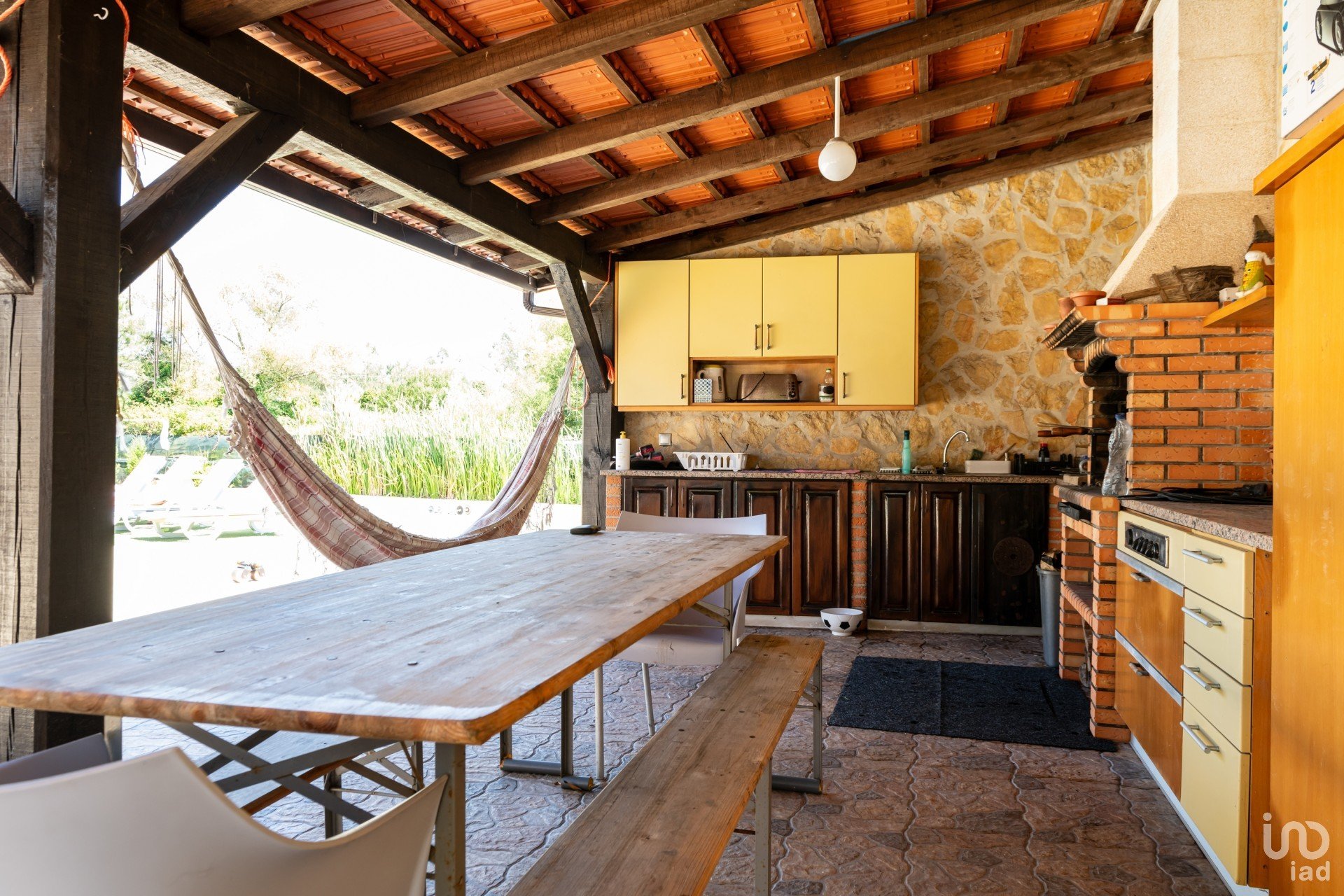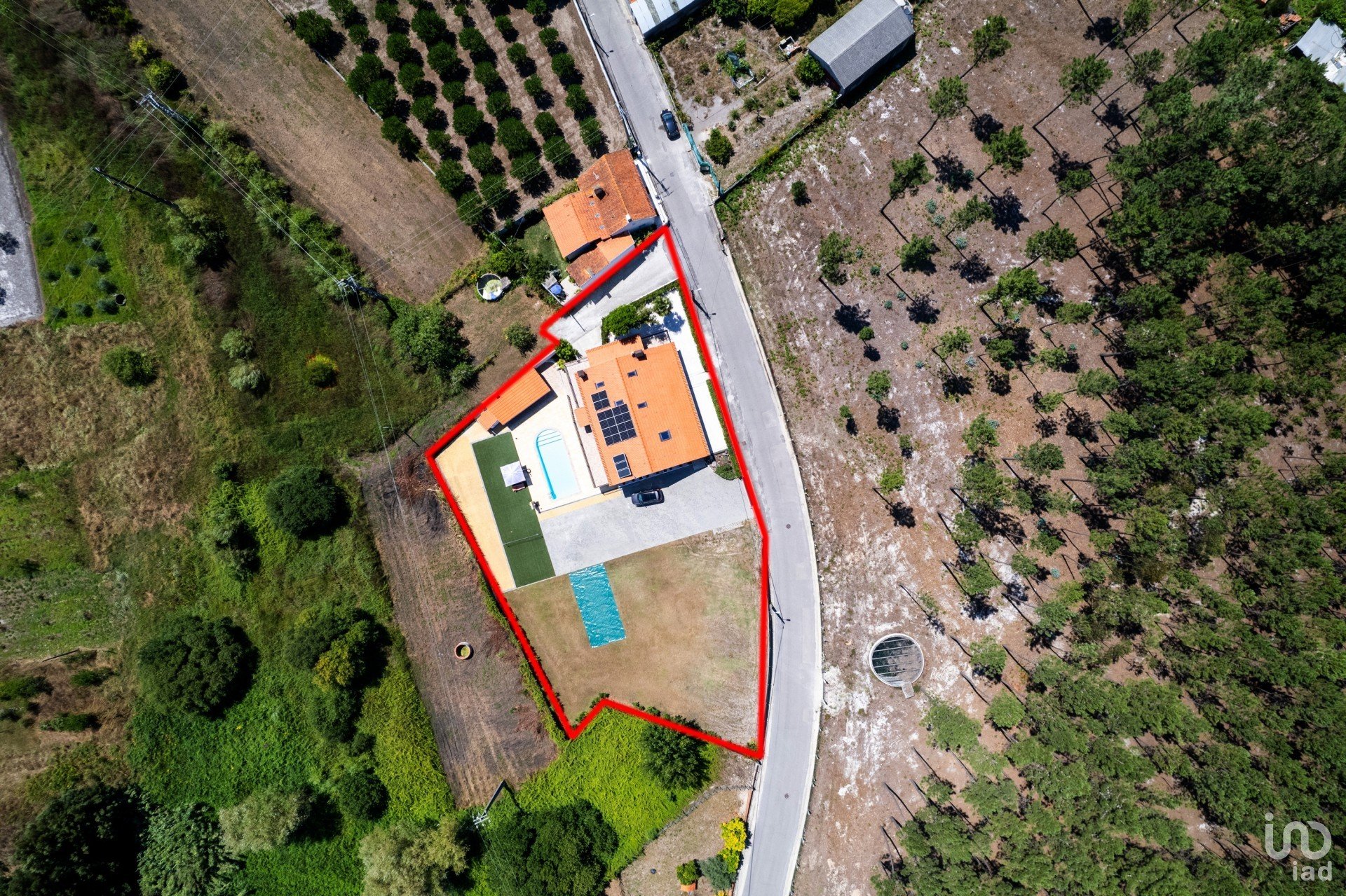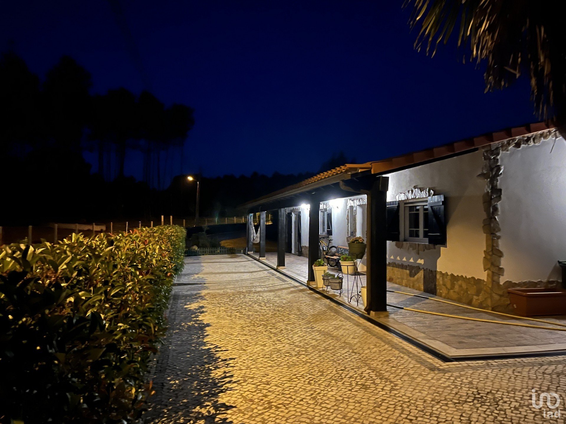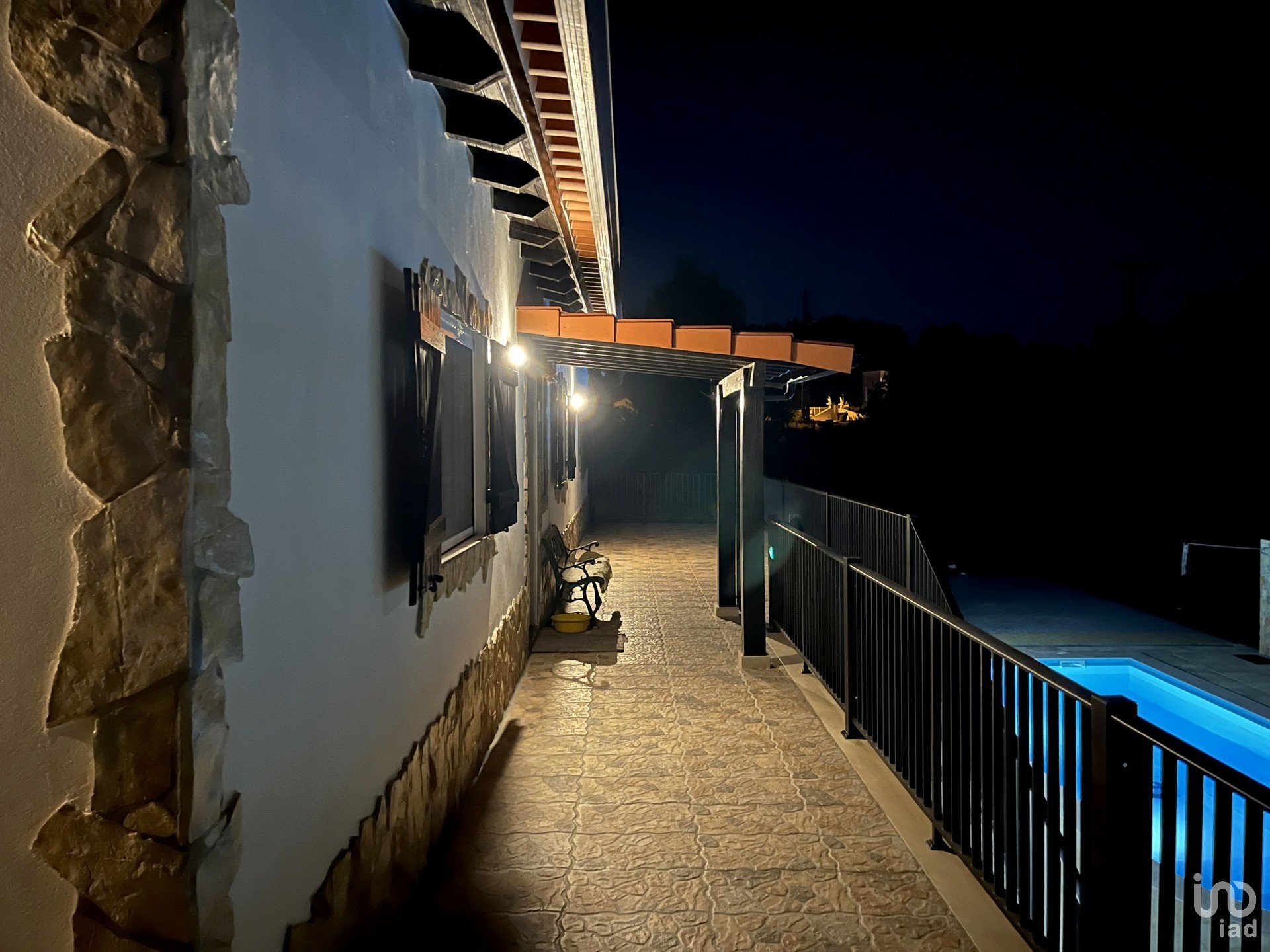 Exterior: Grande terraço a rodear a casa, portão automático de 6m para acesso ao quintal, piscina, etc. Estacionamento para mais de 6 carros. Piscina de 10×5 m com bomba de aquecimento, profundidade de 1,80 – 1 m e duche com água quente ao lado. Área de churrasco de 12×6 m em frente à piscina. Parque infantil com relva artificial de 40m².