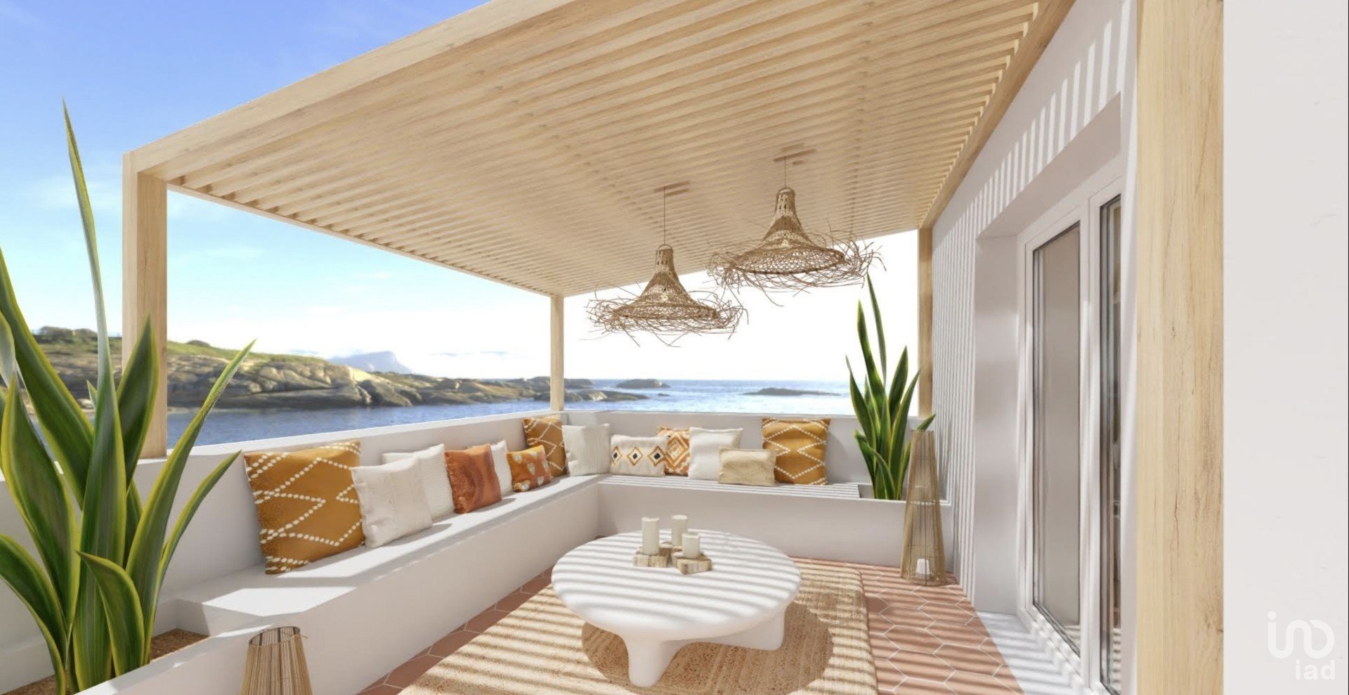 Grande terraço à beira-mar, um espaço ideal para relaxar, organizar churrascos ou simplesmente contemplar o horizonte infinito.