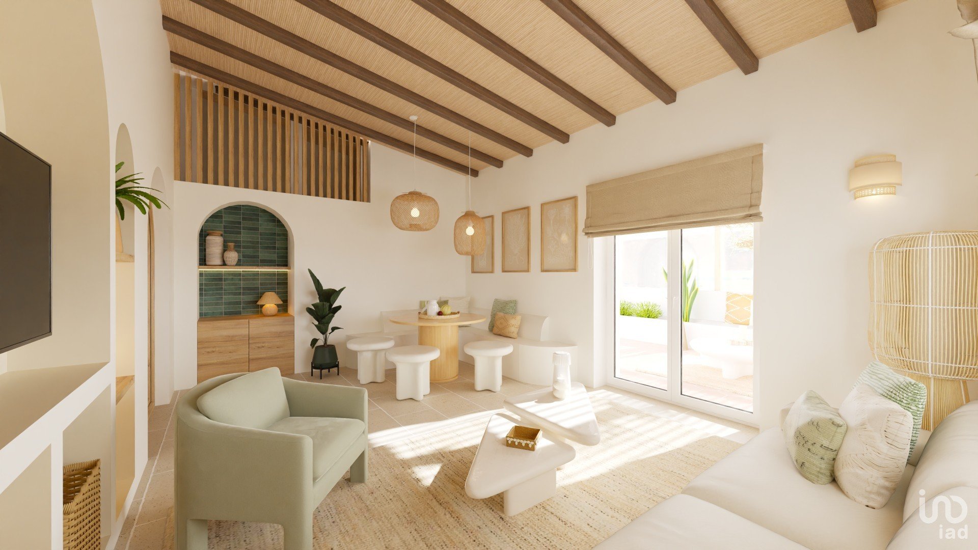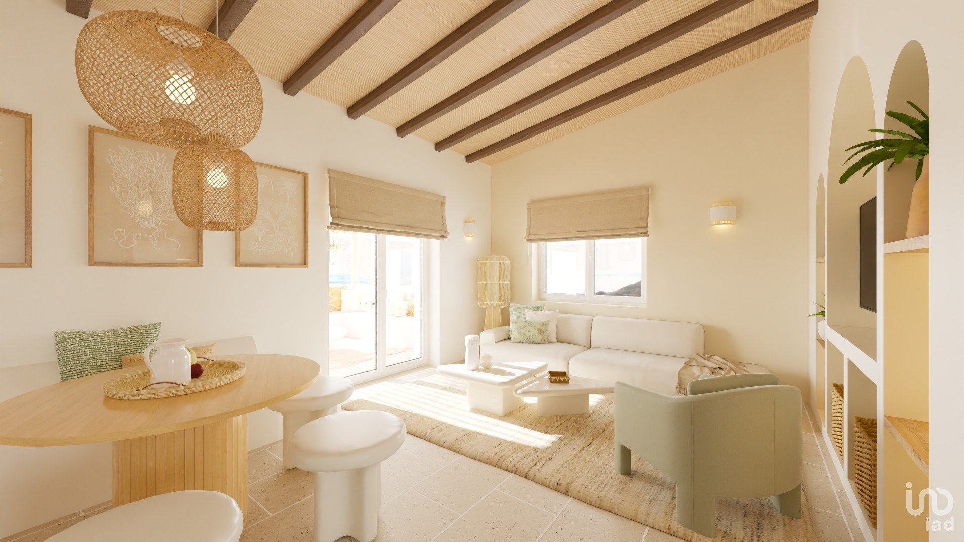 Sala de estar luminosa, um verdadeiro espaço de convívio que se abre para o terraço, criando uma harmonia entre o interior e o exterior. Ideal para momentos de relaxamento ou recepções.