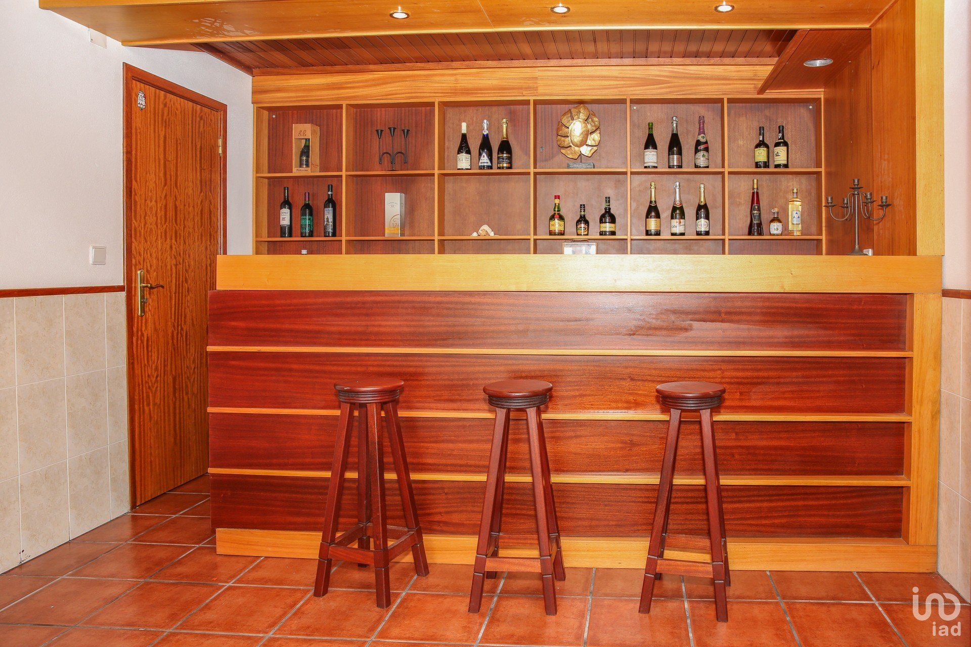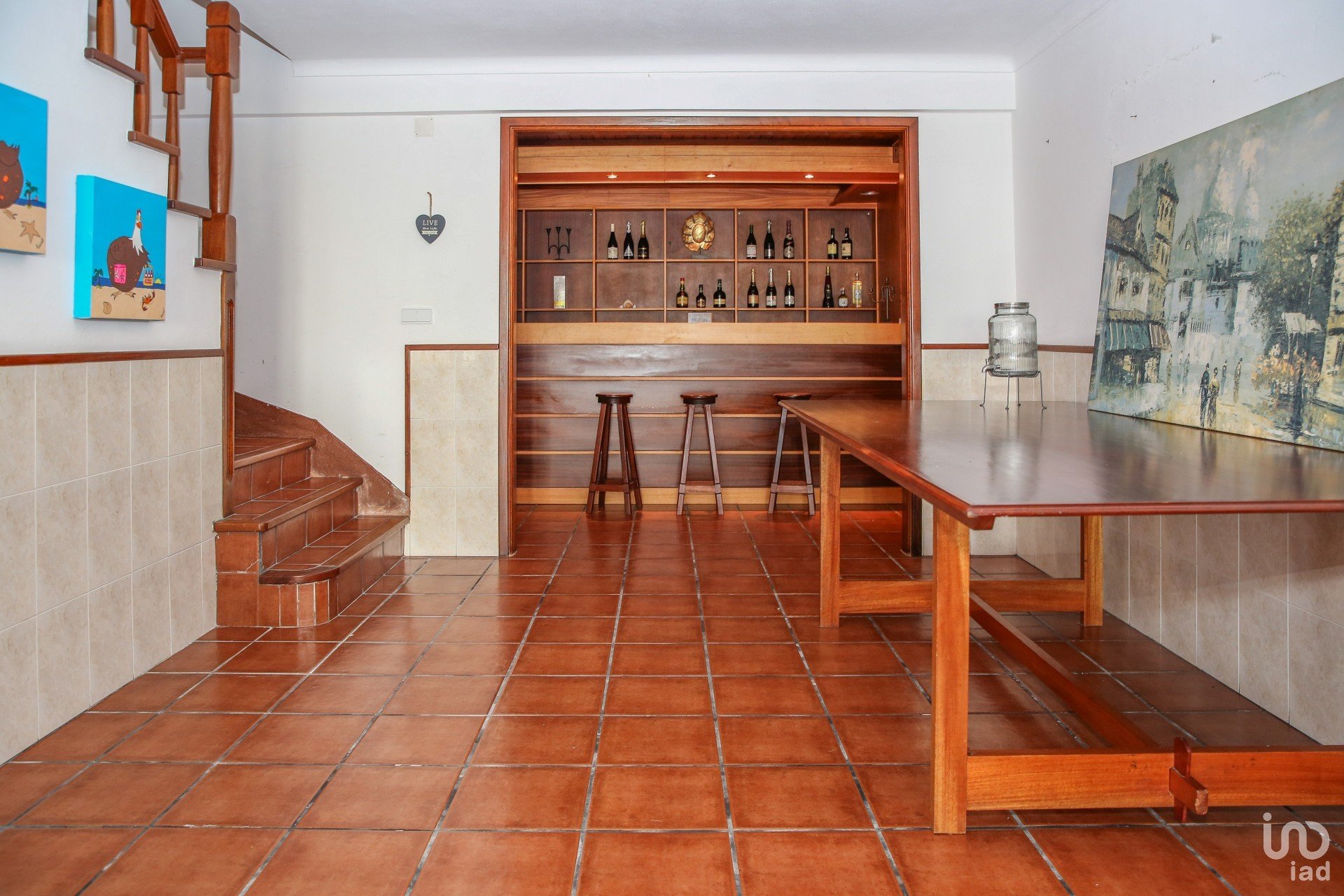 Na cave, encontra-se a garagem, atualmente utilizada como espaço de convívio, que inclui uma segunda sala com lareira, bar, arrumos e mais uma casa de banho.