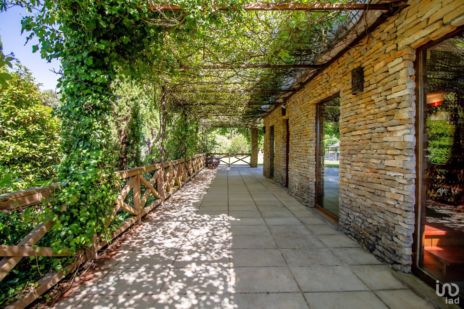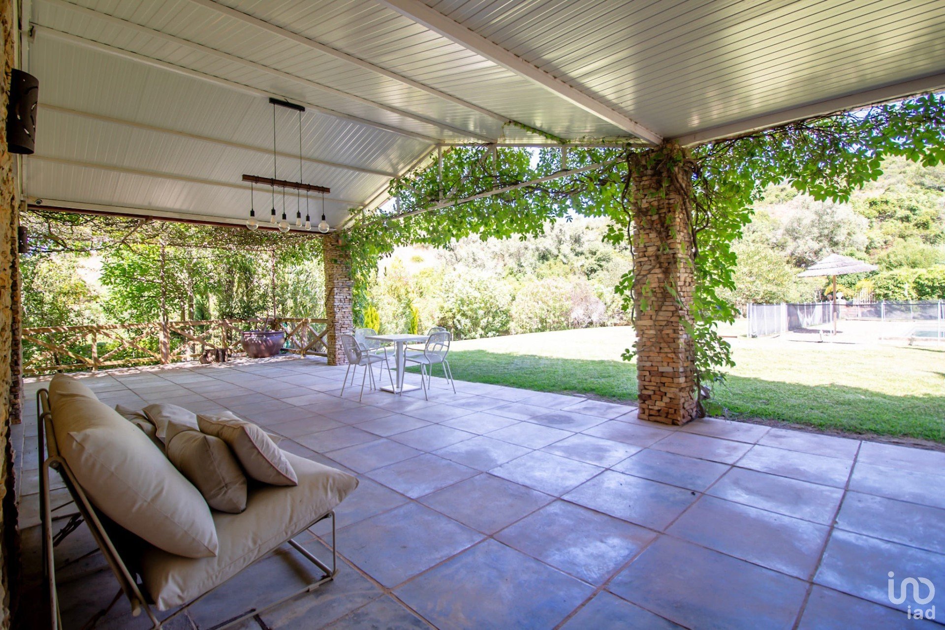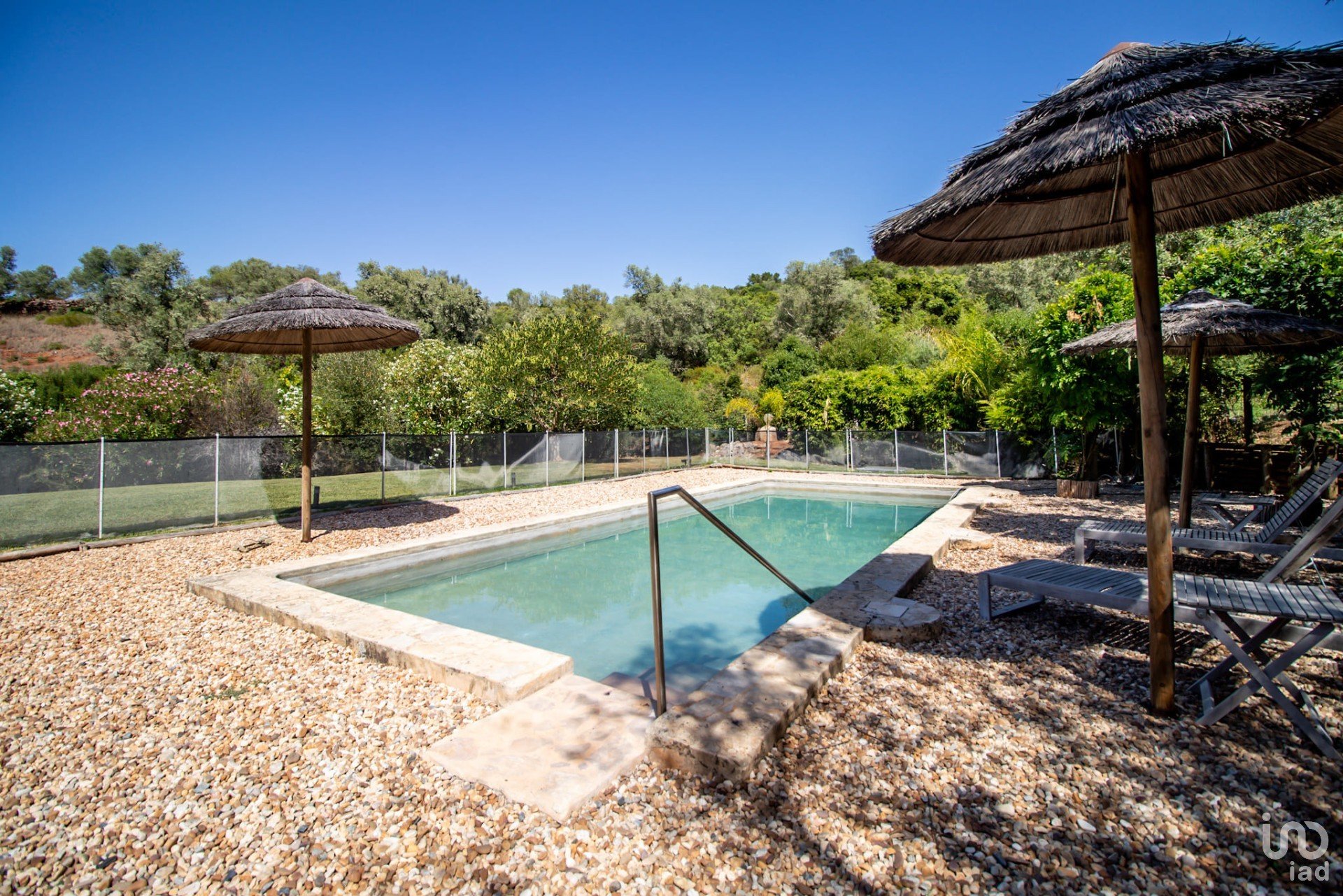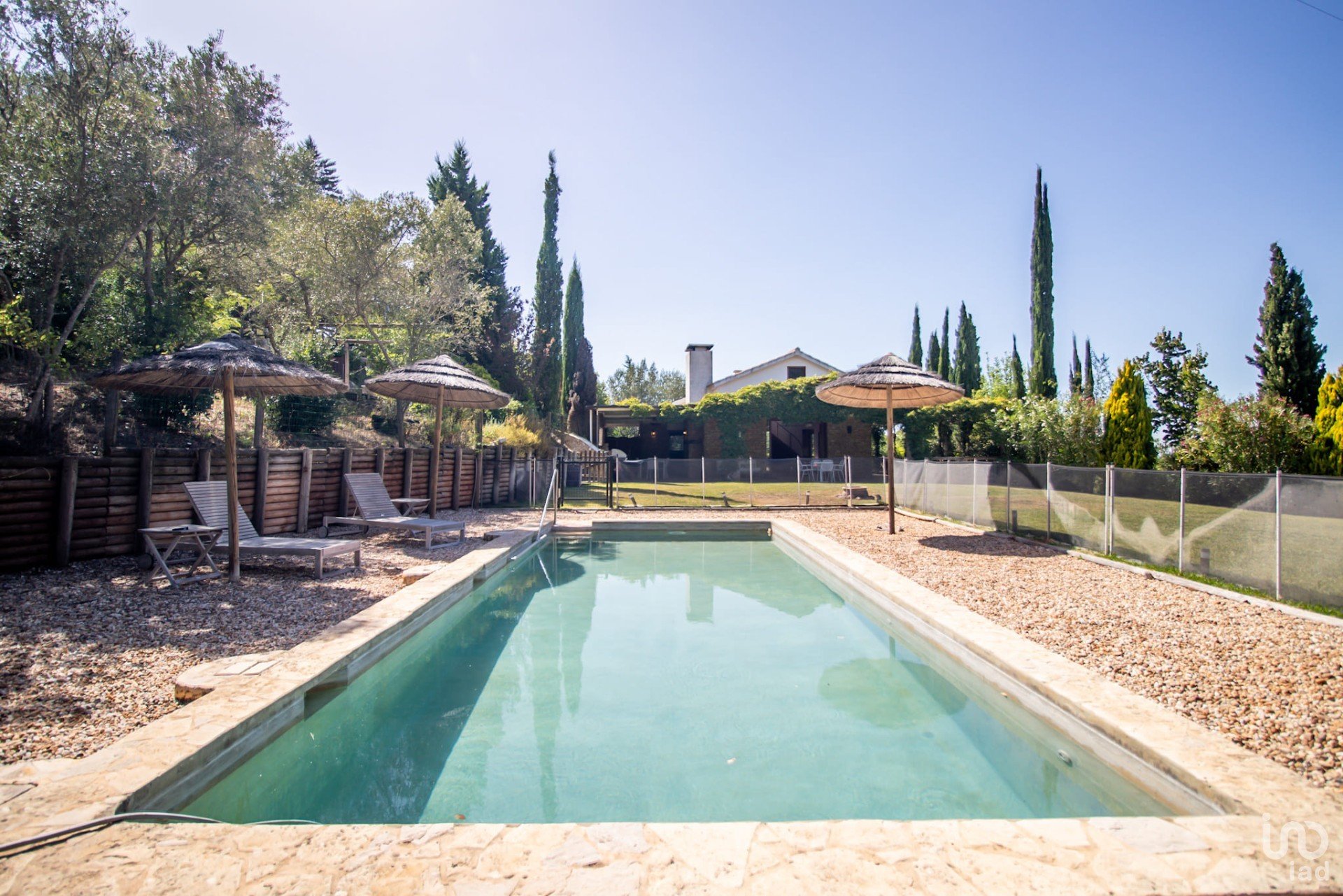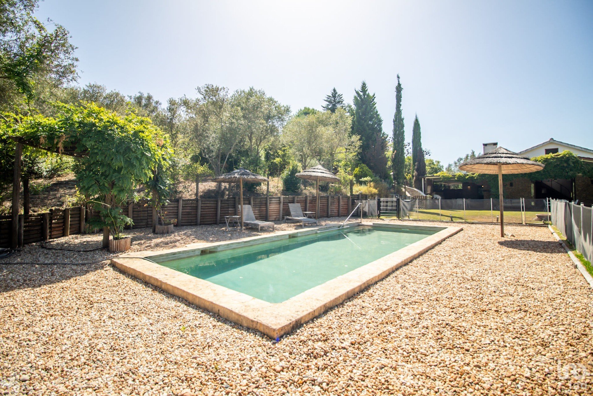 Junto à casa principal, desfrute de momentos de lazer na piscina de 9x3,5m, equipada com uma vedação amovível e rodeada por um extenso relvado verdejante.