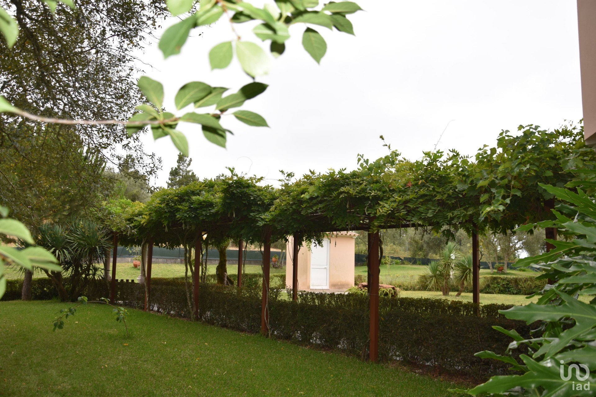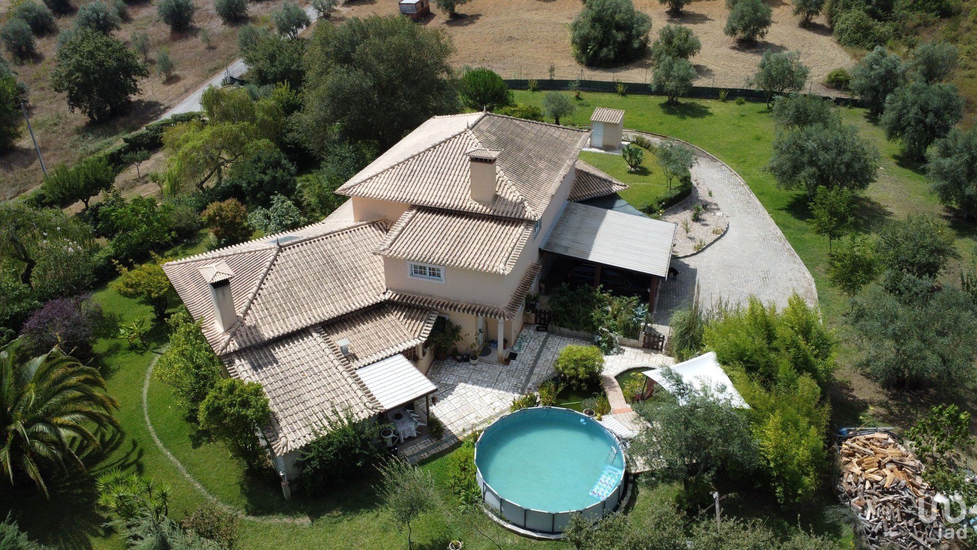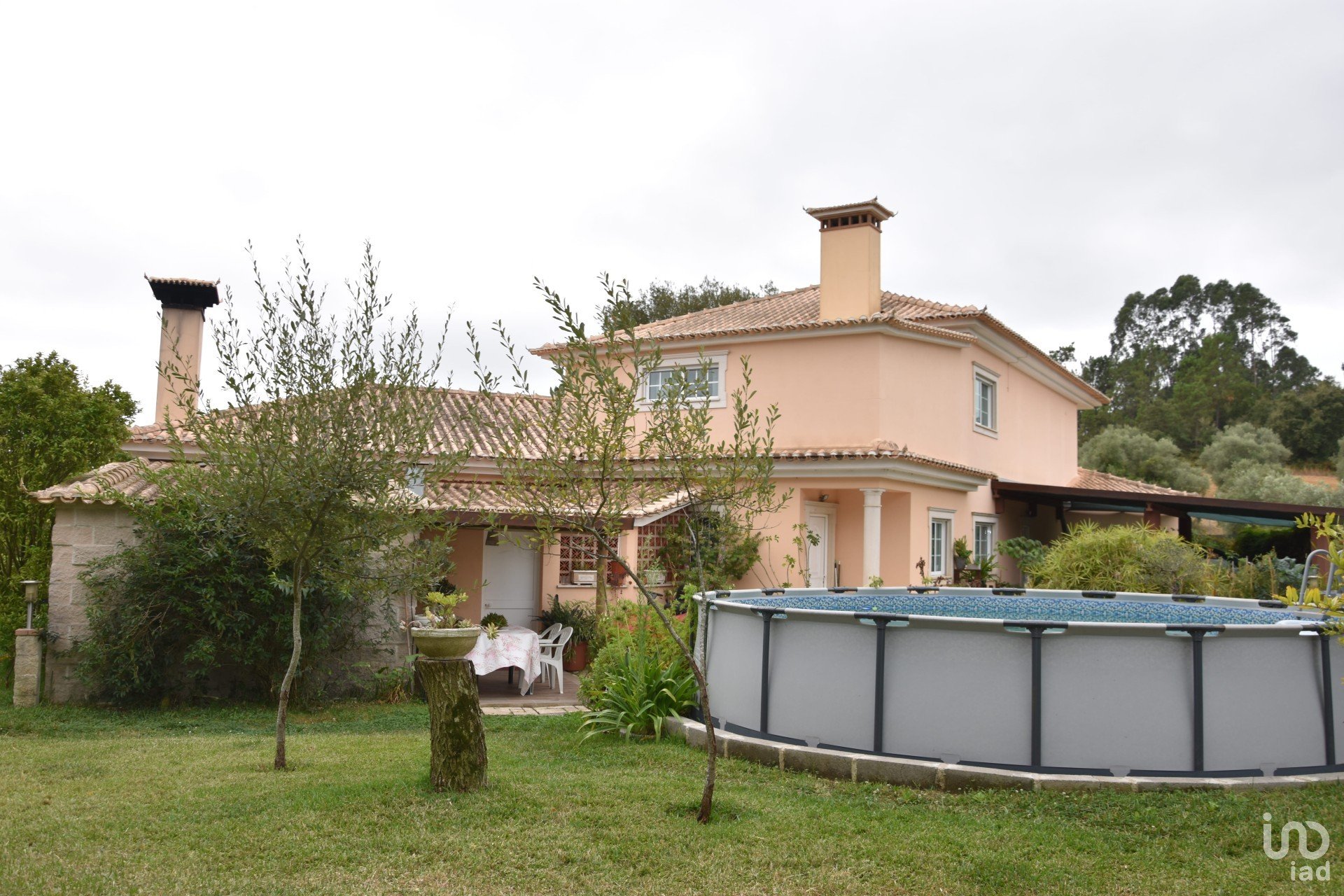 Terreno ajardinado e ornamentado, com rega automática e diversos recantos, espaços de lazer, horta, percurso pedonal, zona com múltiplas árvores de fruto, canil, casinha de madeira, lagos, piscina, deck de apoio e churrasqueira.