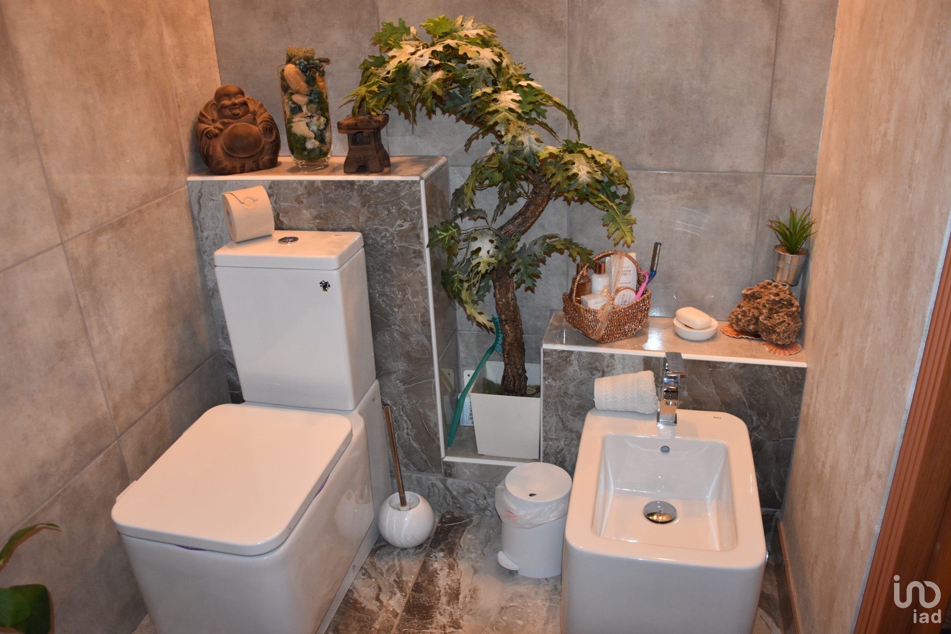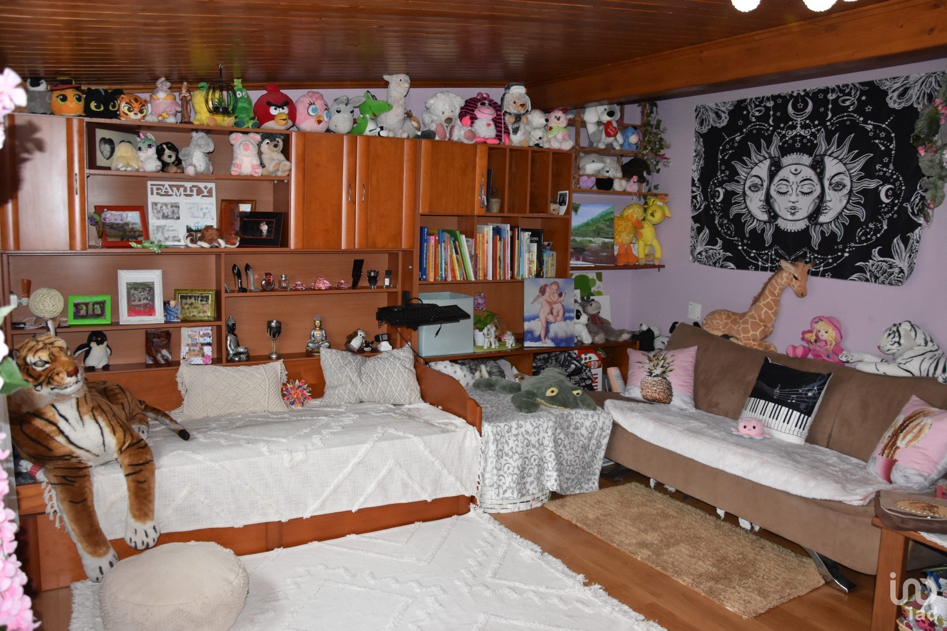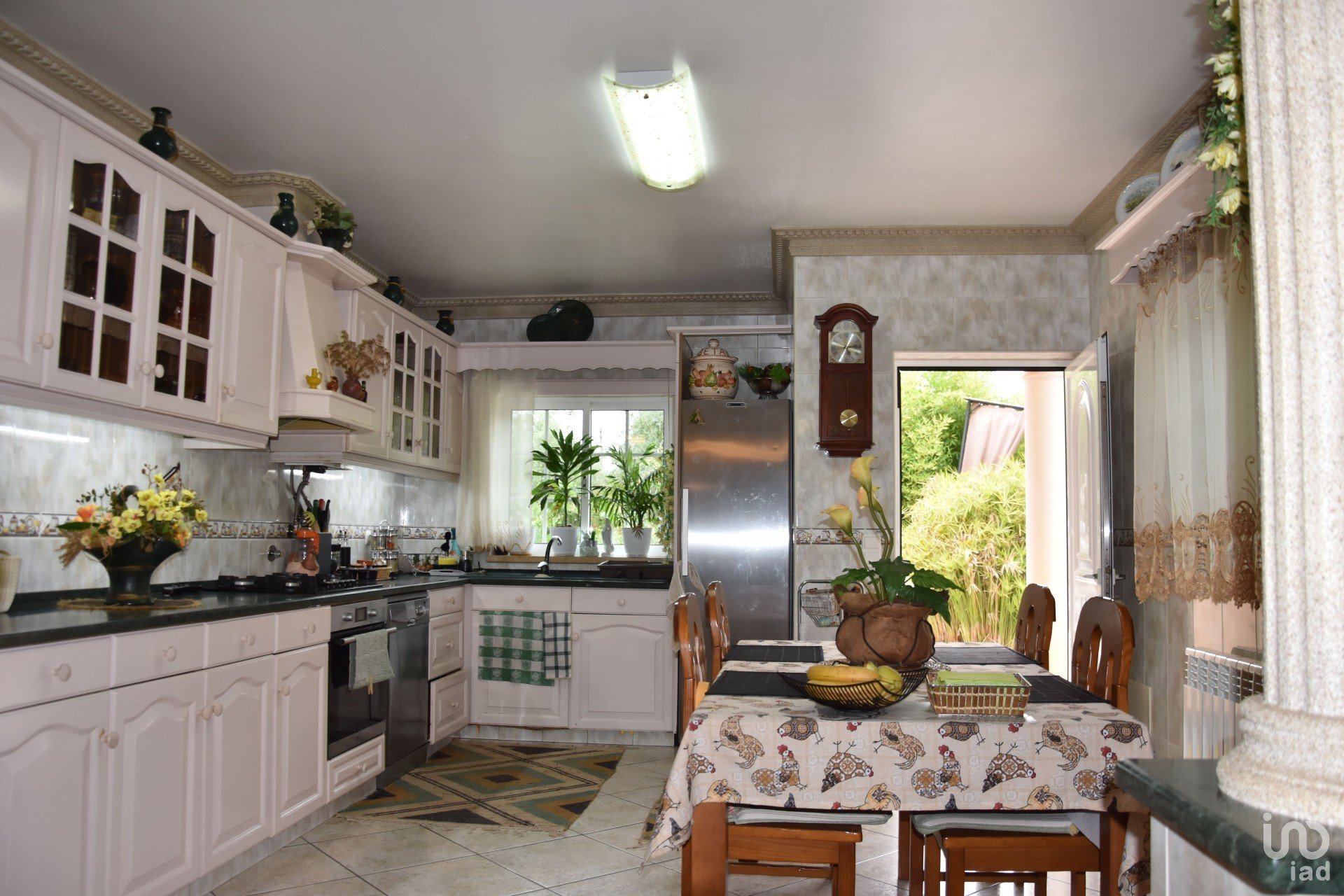Terreno ajardinado e ornamentado, com rega automática e diversos recantos, espaços de lazer, horta, percurso pedonal, zona com múltiplas árvores de fruto, canil, casinha de madeira, lagos, piscina, deck de apoio e churrasqueira.