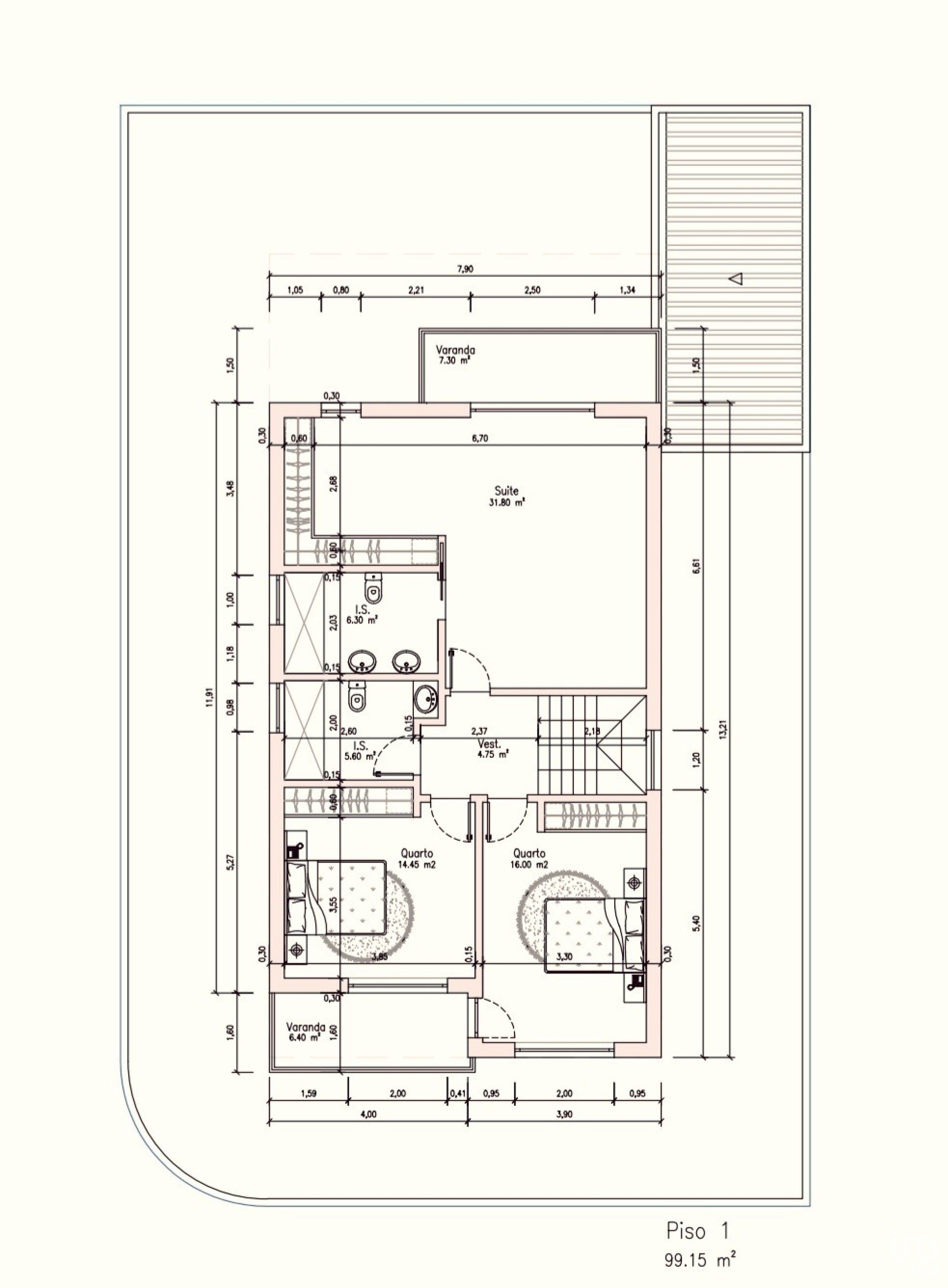 No primeiro piso, encontramos os restantes três quartos, sendo um deles uma espaçosa suite de 31m2 com generosos roupeiros e WC com lavatório duplo. Os outros dois quartos também têm roupeiros embutidos e todos eles são servidos por varandas.