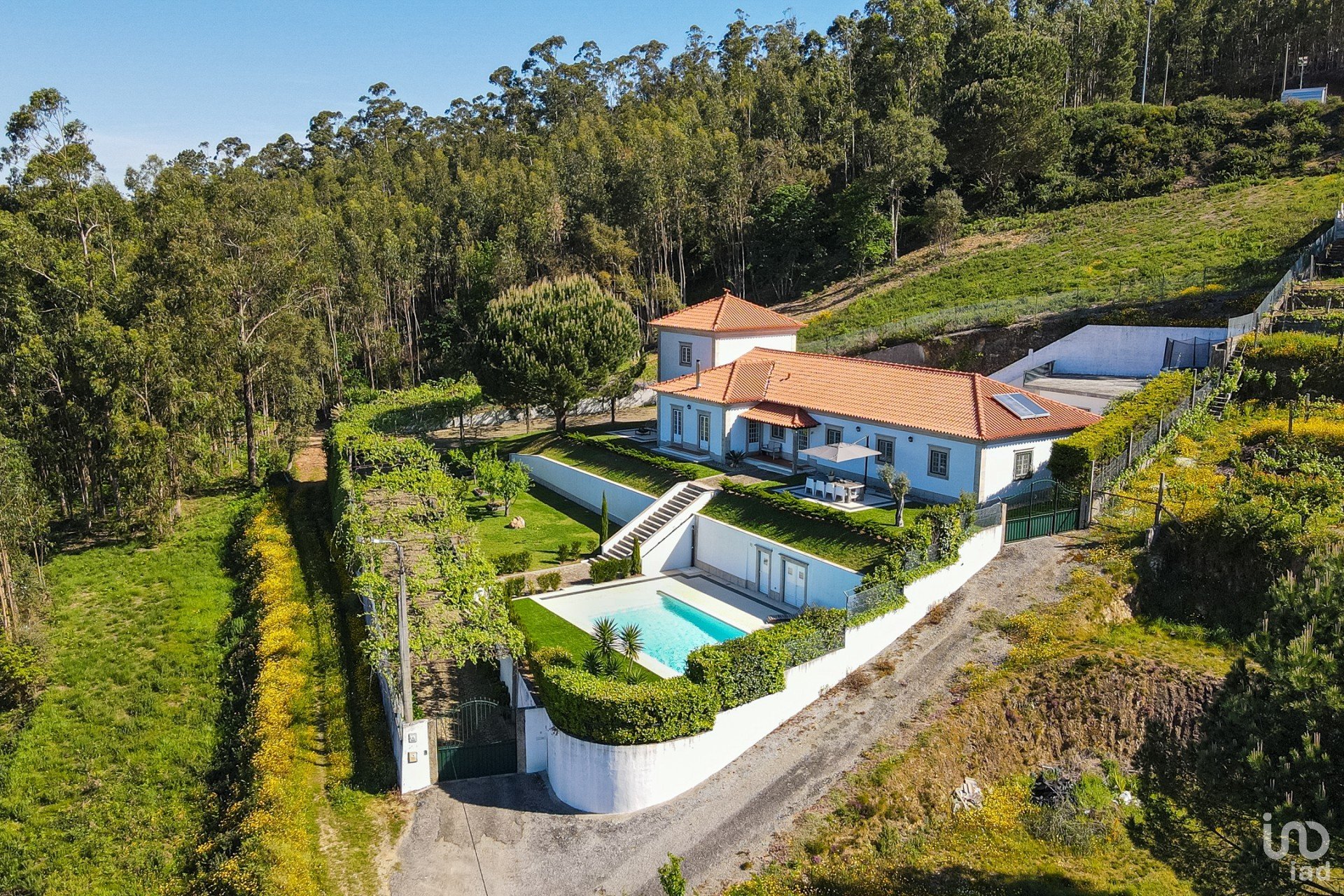 O terreno de 1.913 m² é totalmente vedado e privado, com jardins maduros e vistas panorâmicas sobre a paisagem rural.