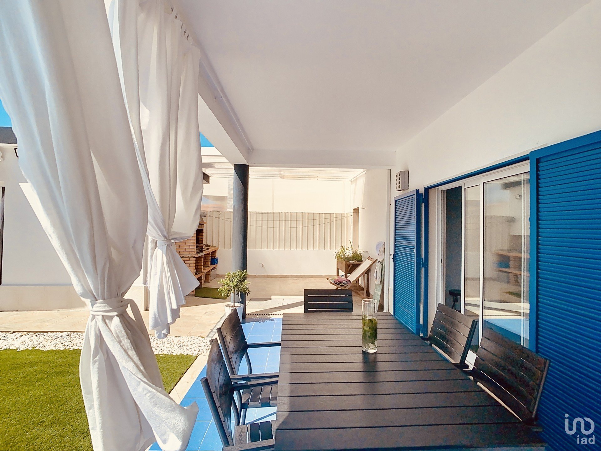 A fusão entre o interior e o exterior é perfeita: as grandes portas envidraçadas permitem uma conexão fluida entre os ambientes, ideal para quem valoriza um estilo de vida indoor/outdoor.