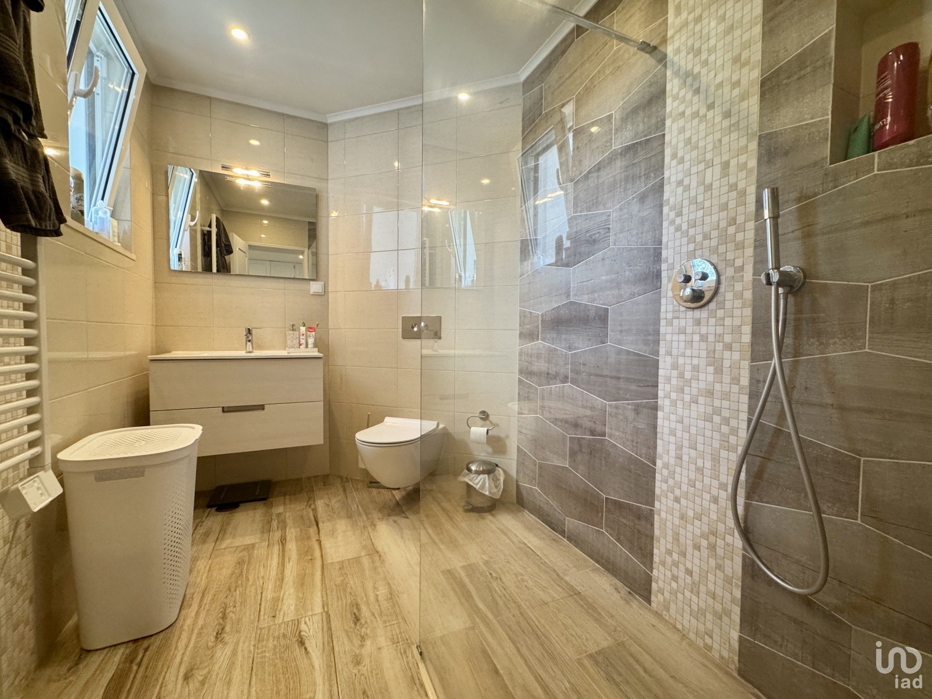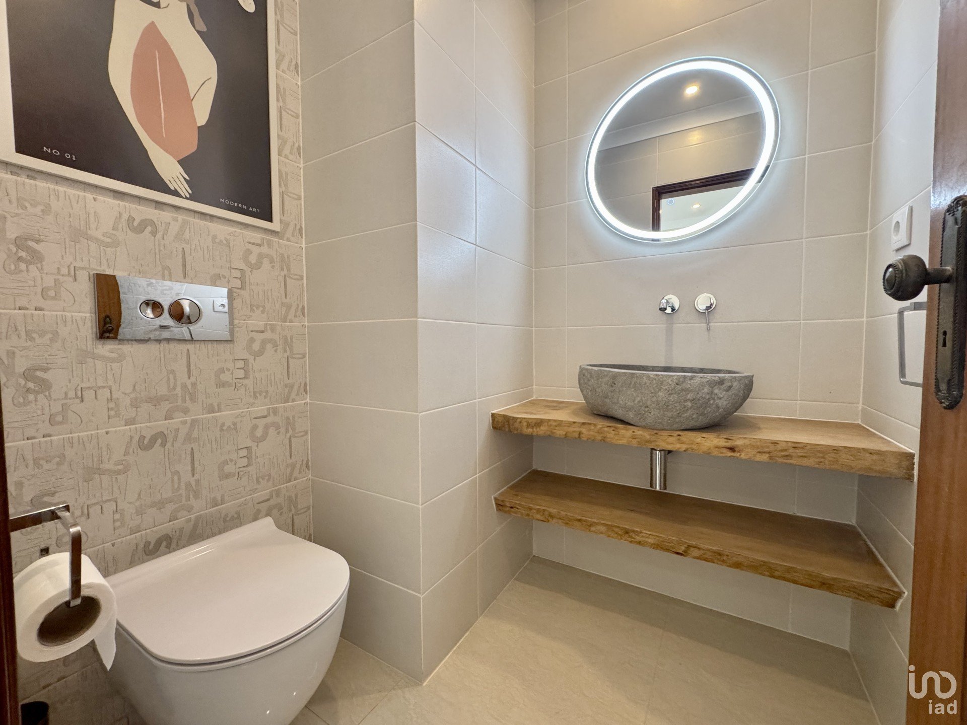 O piso inferior oferece uma garagem ampla e um apartamento independente T1, ideal para receber hóspedes com total privacidade ou para rentabilizar através de arrendamento.