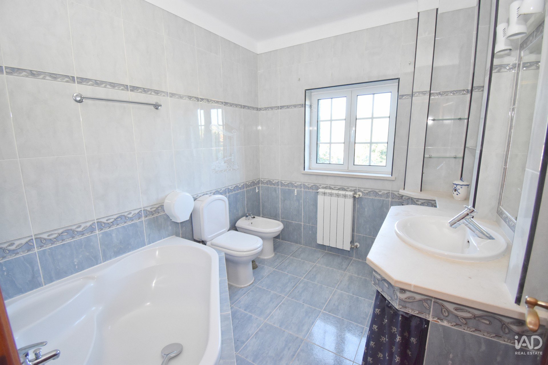 A casa de banho deste piso térreo da casa é completa, tem uma grande banheira e janela para o exterior.