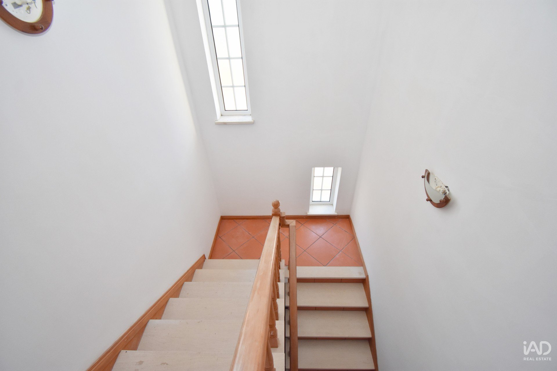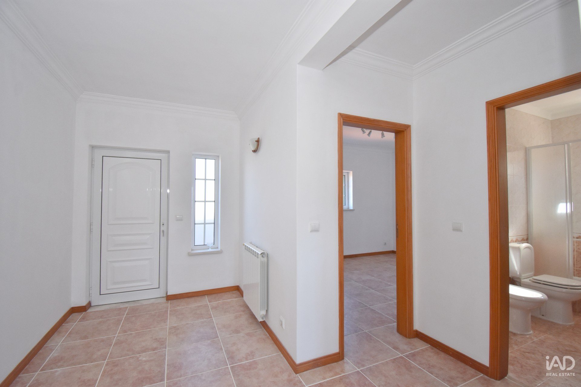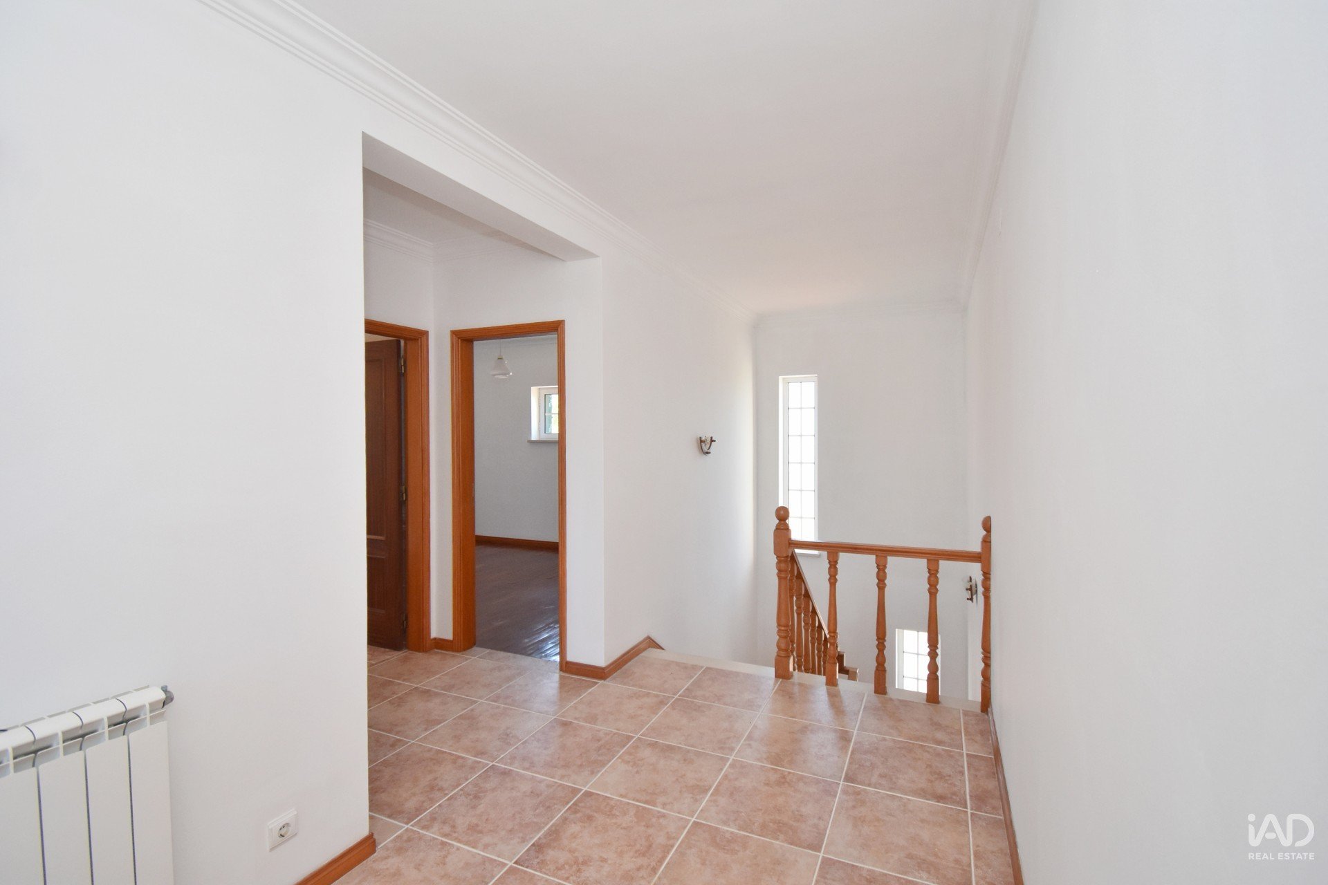 Voltando ao hall, há, a partir daqui, uma escada que leva ao sótão, onde temos um grande hall com varanda para a frente da casa, com vistas para a piscina e serra. Este piso tem casa de banho completa com base de duche e dois quartos.