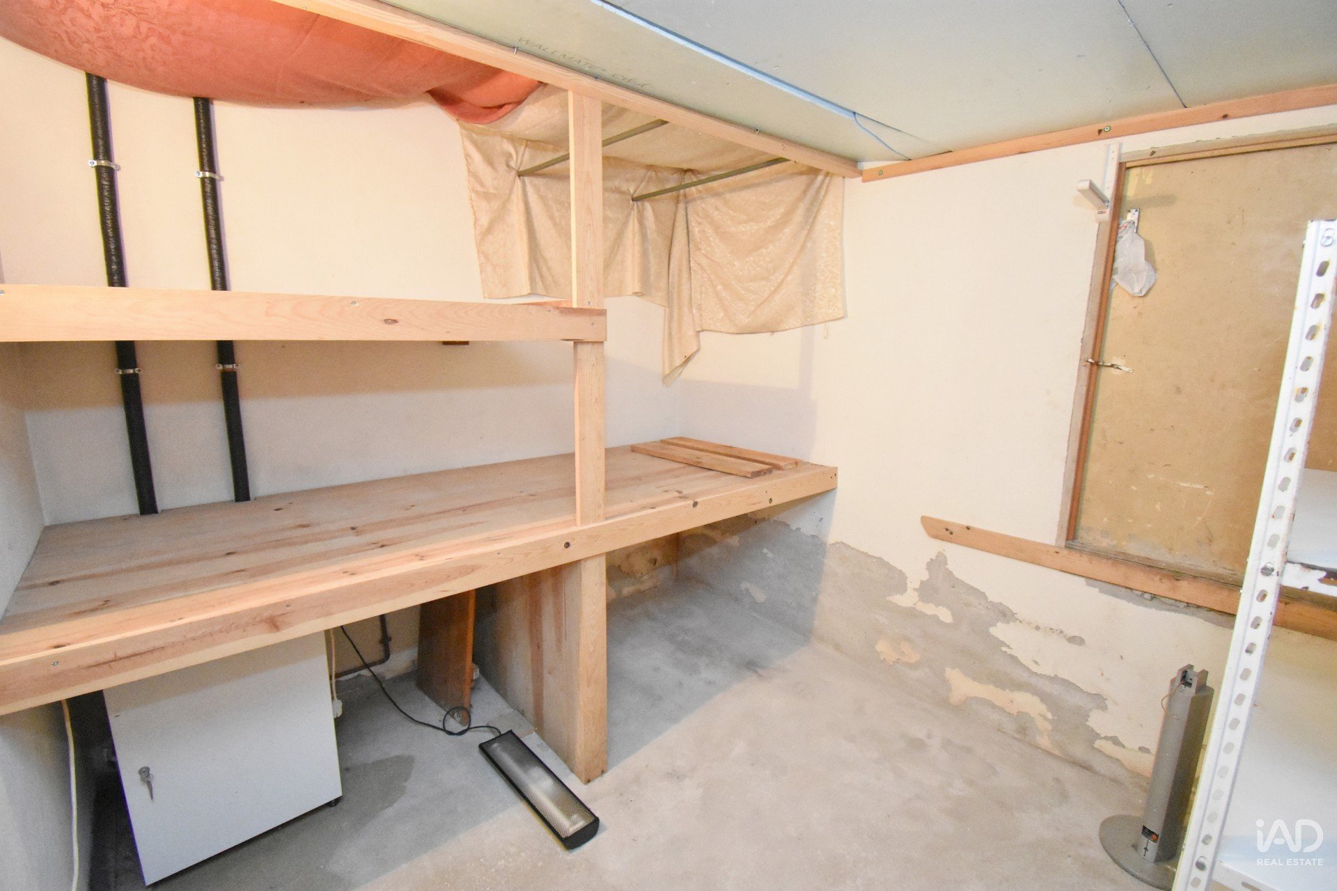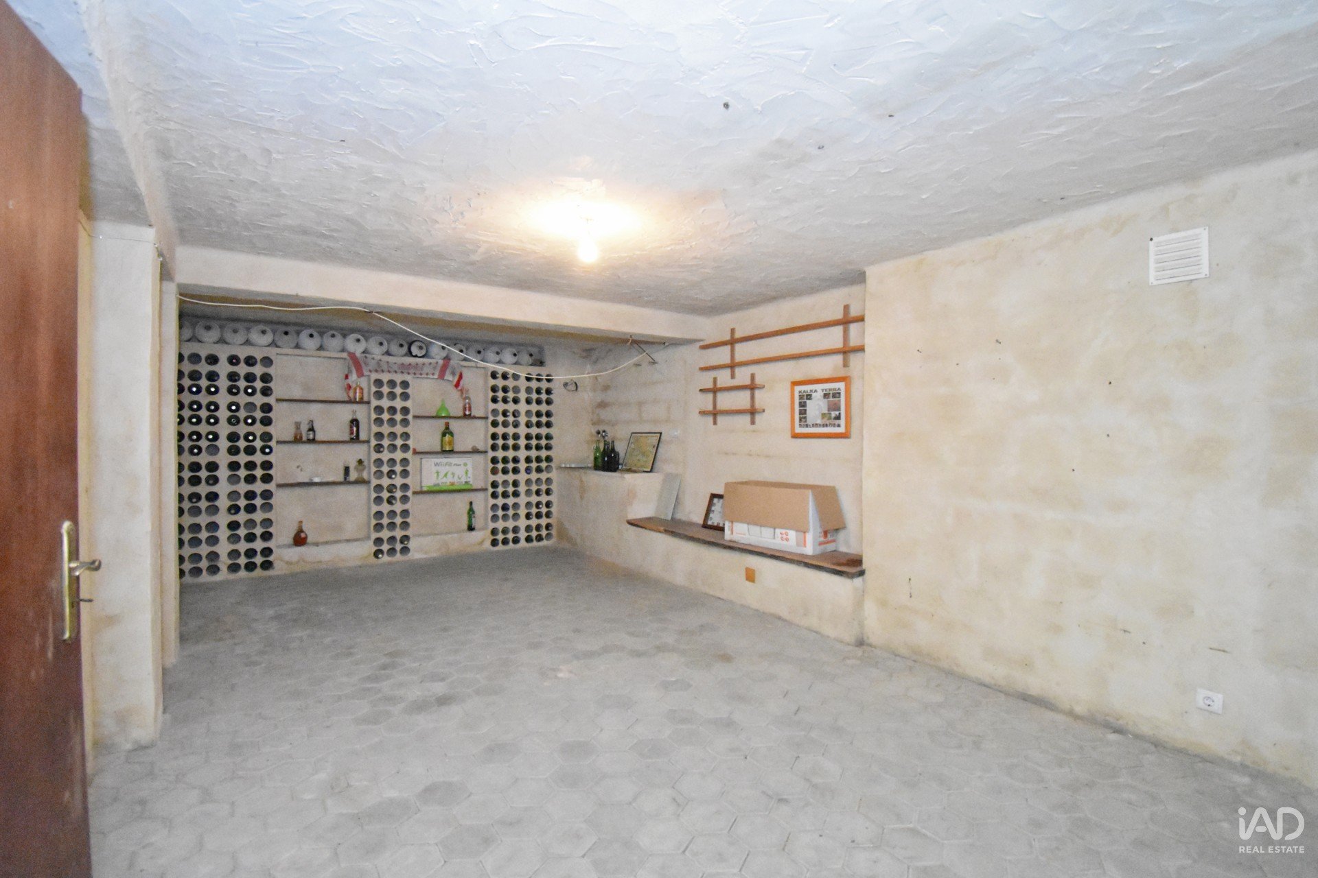 A mesma escada que leva ao sótão, ao nível do piso térreo, desce também para a cave, composta por garagem para dois carros com portão automático, um escritório, espaço para ginásio/adega e uma sala técnica onde poderá ligar outro equipamento de aquecimento central no caso de não pretender o sistema existente a lenha e gasóleo.