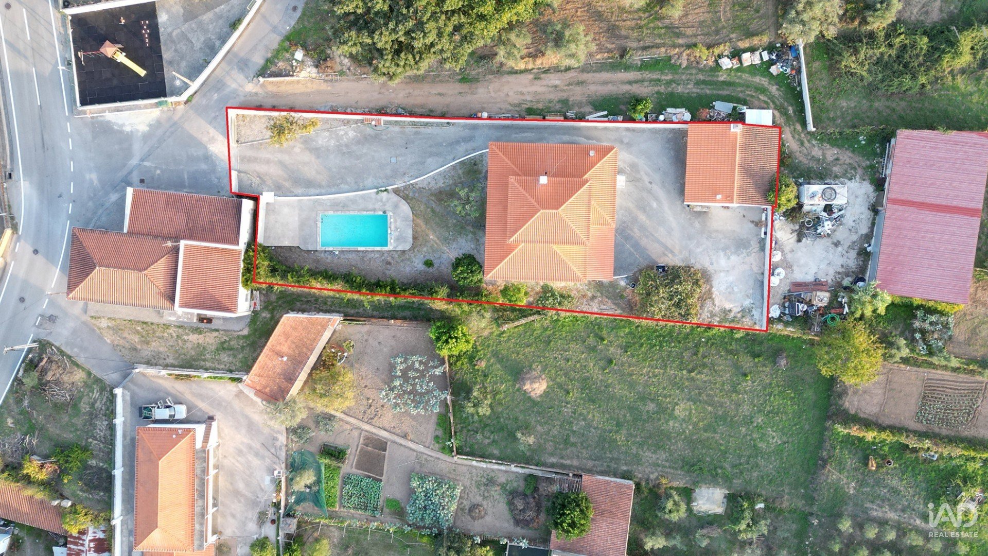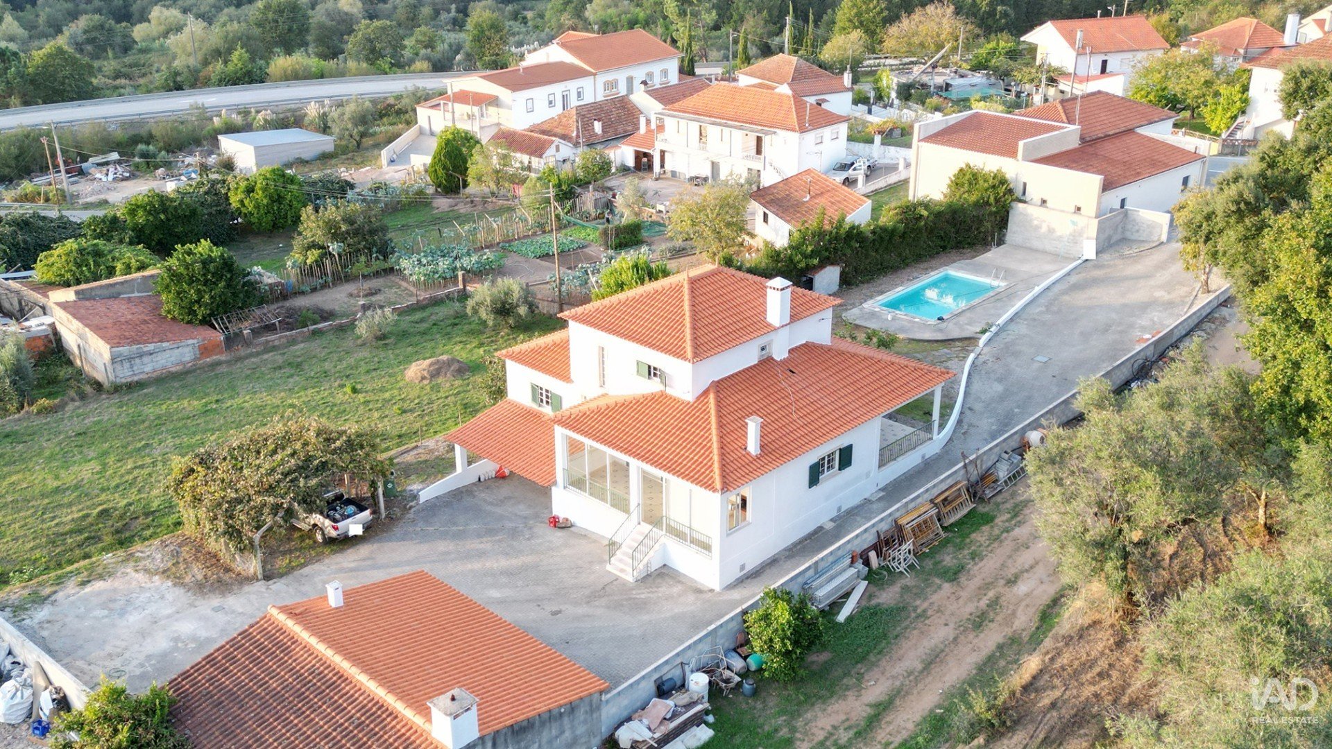 A parte da frente da casa é ajardinada com uma linda piscina, acesso pavimentado de automóvel até à garagem e anexo e furo de água artesiano que favorece água para rega, piscina e qualquer utilização exterior.