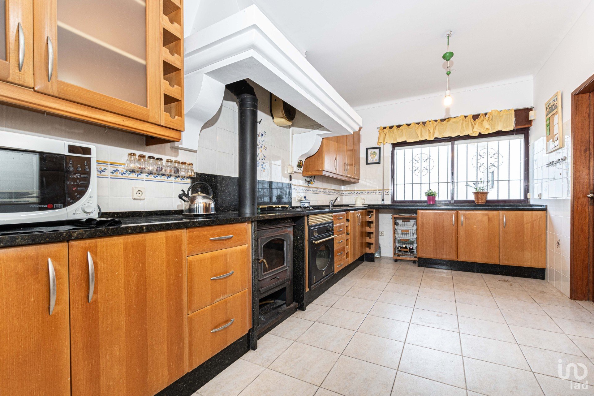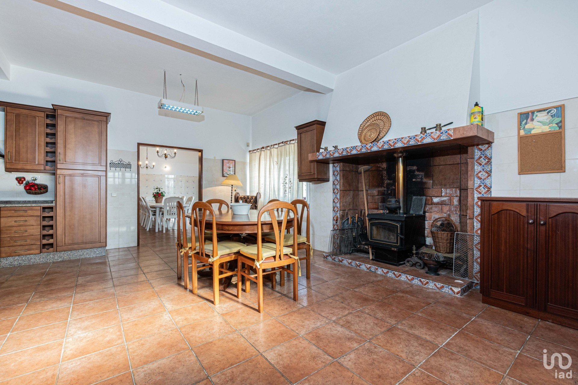 Cozinha funcional com fogão a lenha e despensa