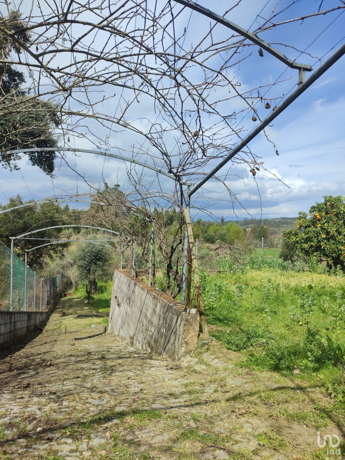 Zona de cultivo para horta biológica composto por diversas árvores de fruto: tangerineiras, figueira, laranjeiras, oliveiras, cerejeiras, damasqueiro, macieiras e kiwis.