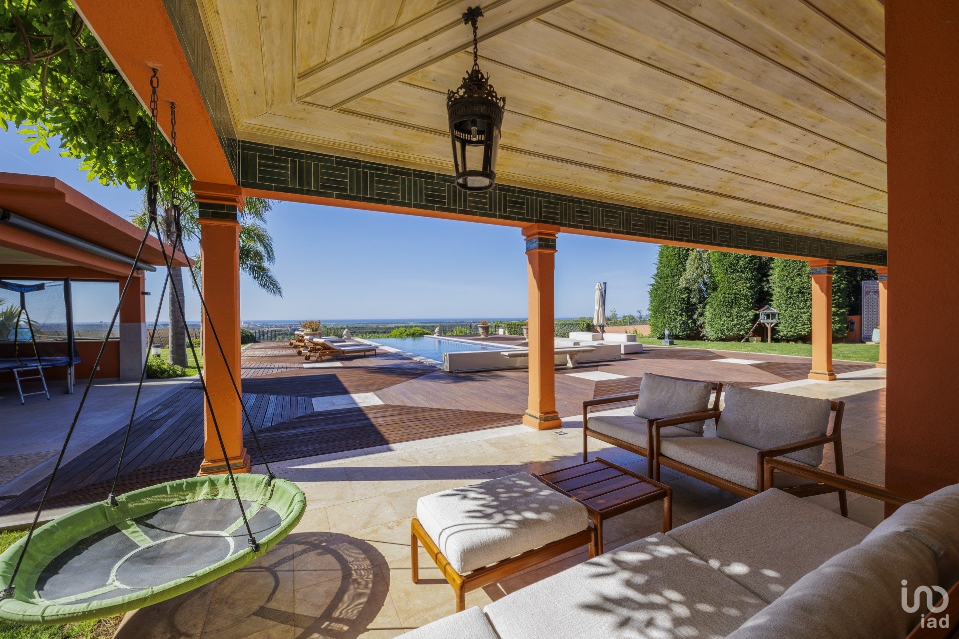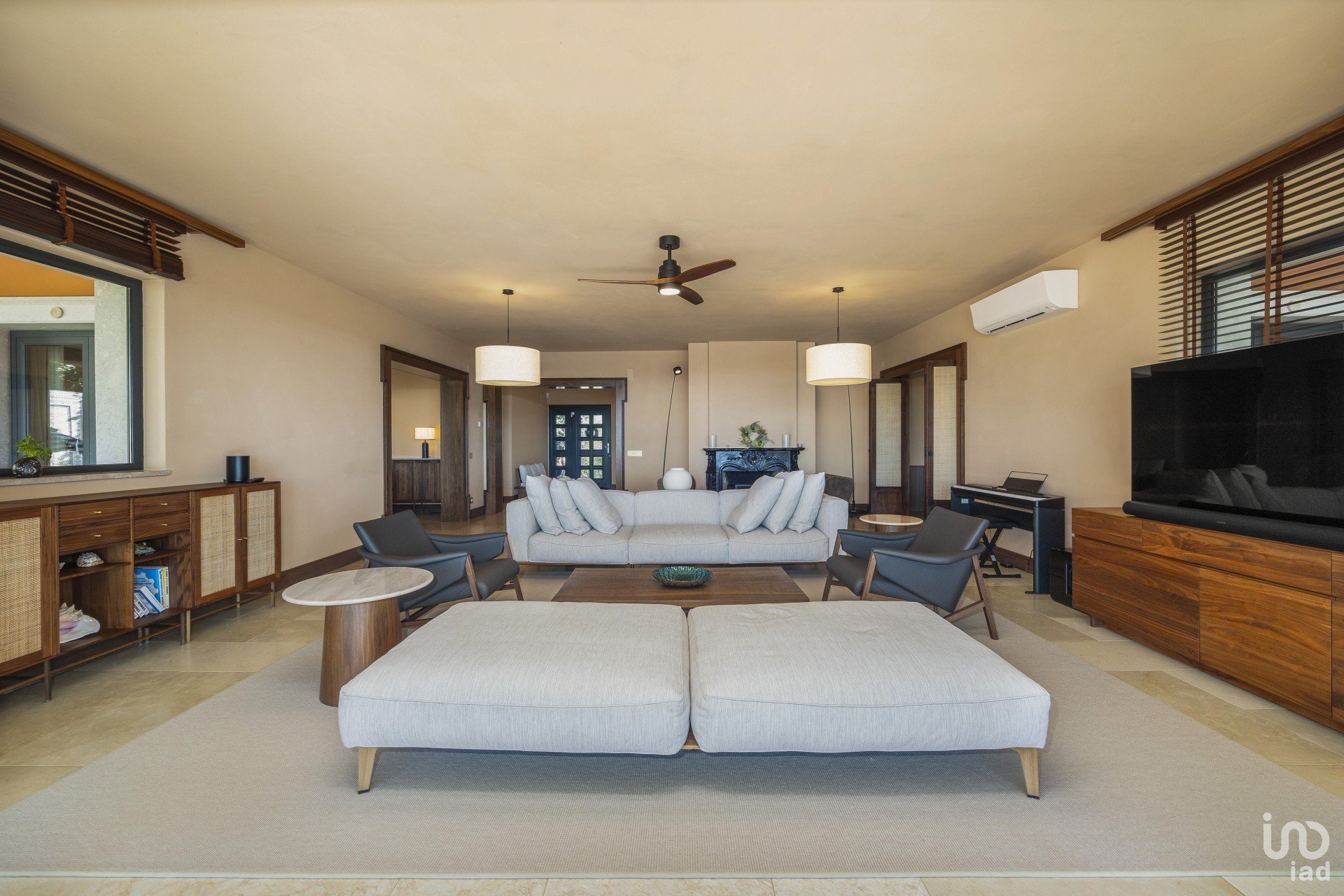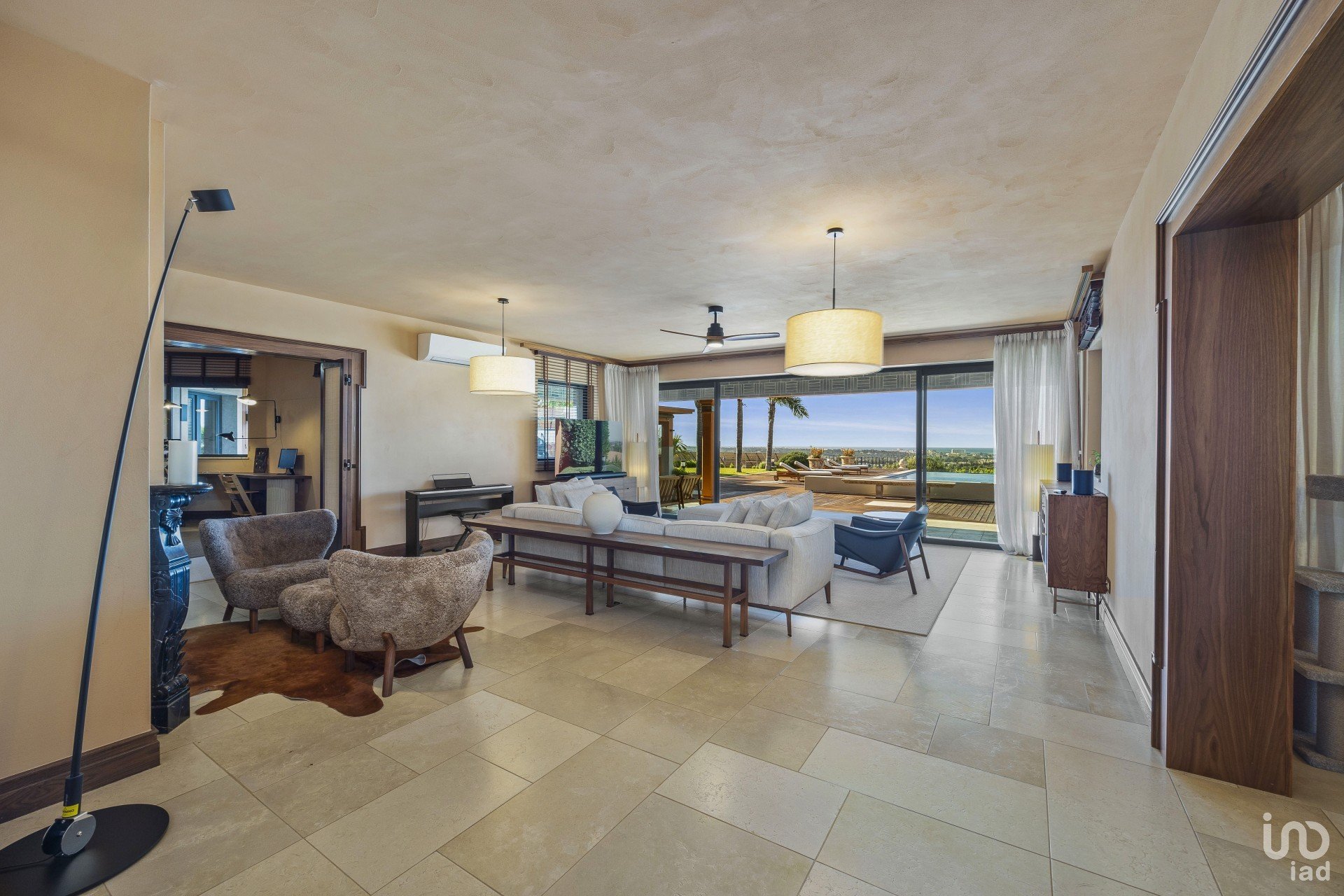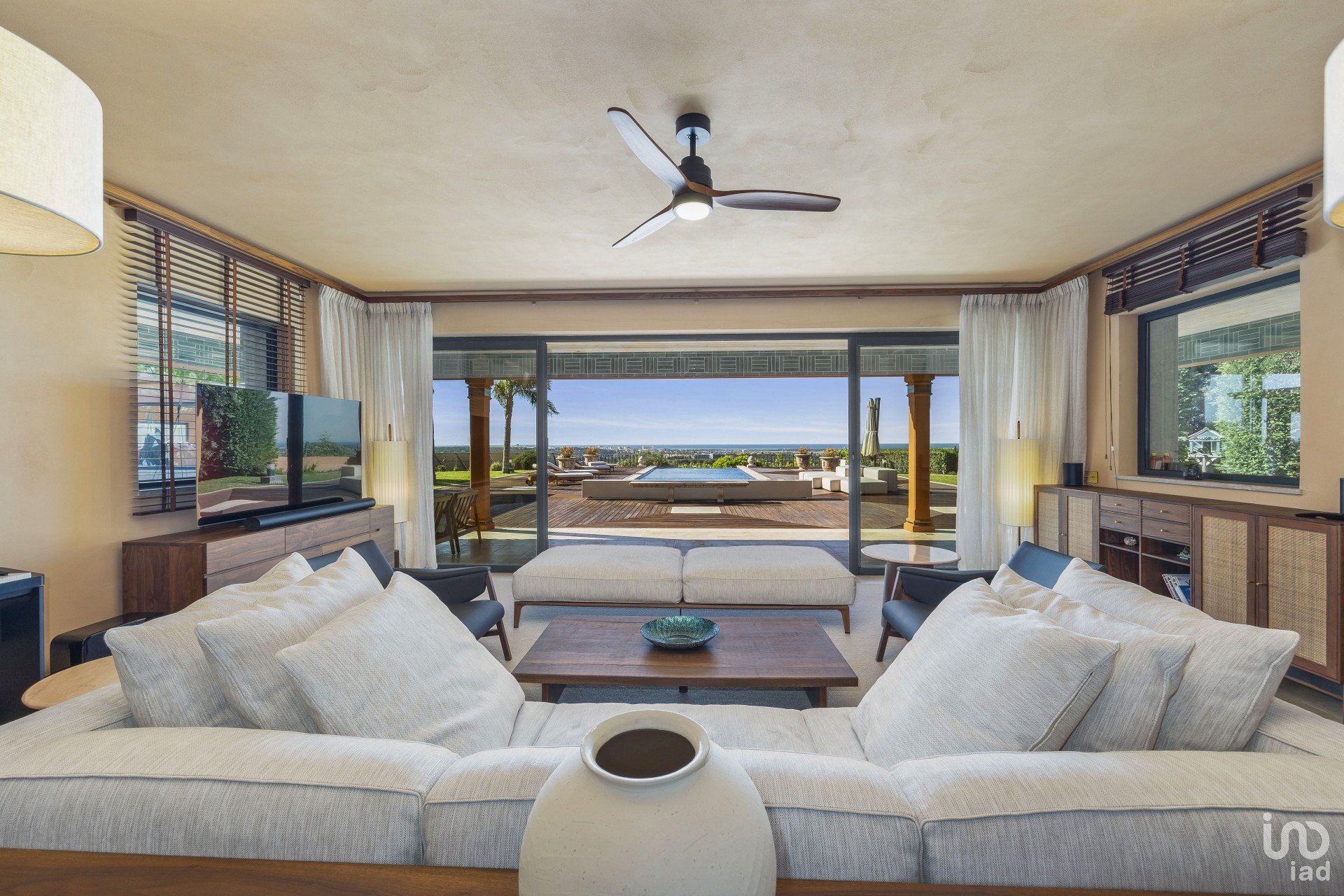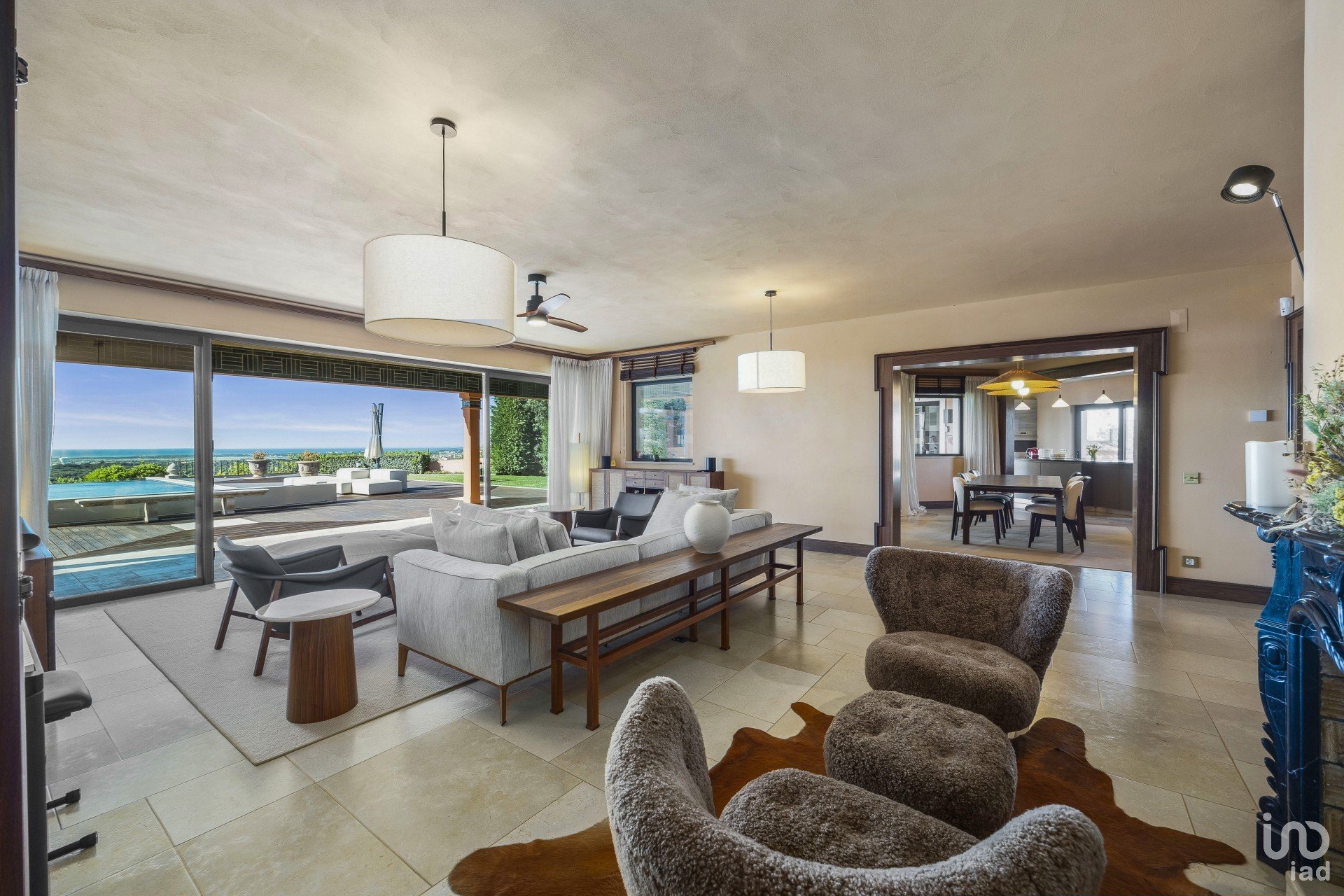 O salão é espaçoso e estando virado a sul, permite muita luz natural. Mesmo sentado no sofá depara-se com as mais maravilhosas vistas para o mar. Existem grandes portas de correr que conduzem do salão para a área de refeições exterior, piscina e jardins deslumbrantes.