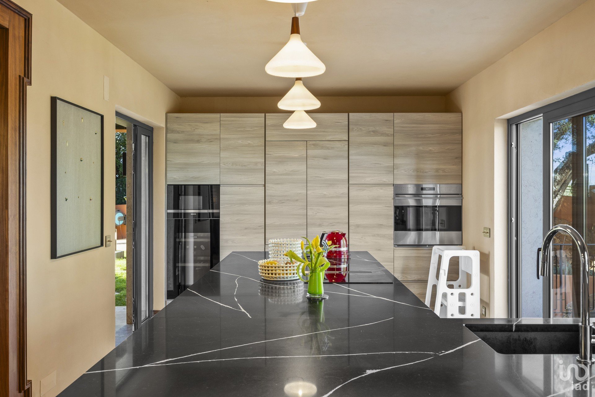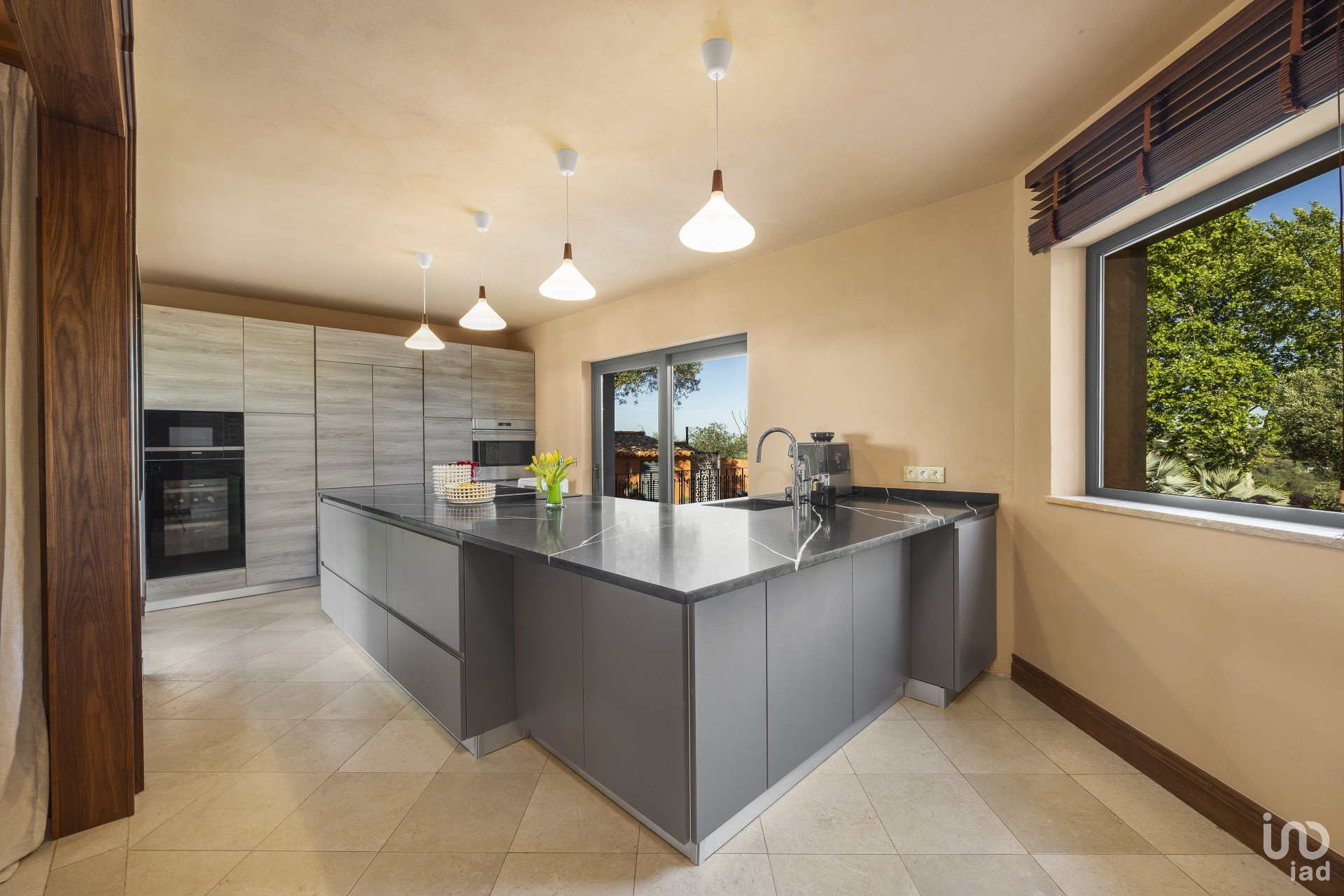 Do corredor pode aceder à cozinha à direita, que é em plano aberto e tem todos os novos electrodomésticos de última geração e 2 portas, uma que leva ao pátio e à área de refeições exterior nas traseiras e a outra à área de refeições da frente . Há também uma área de serviço e armários extra.