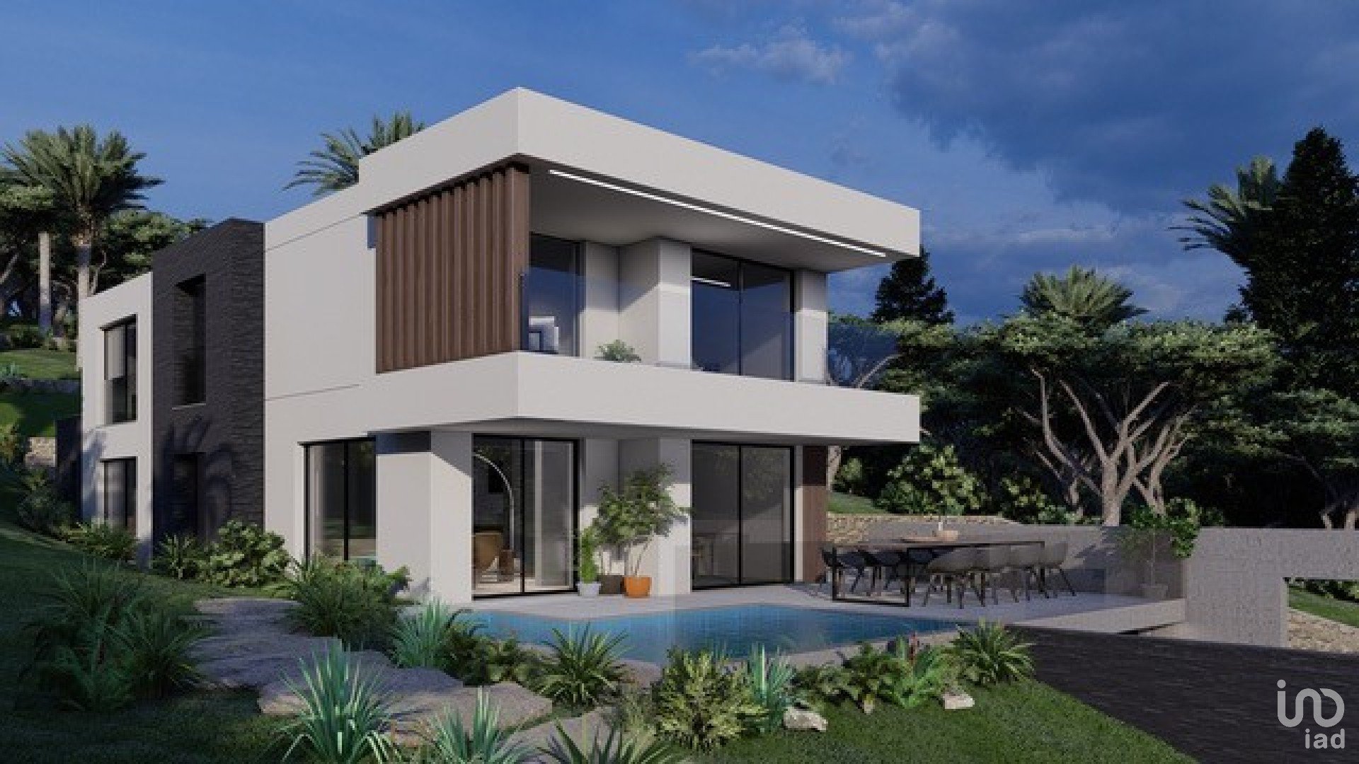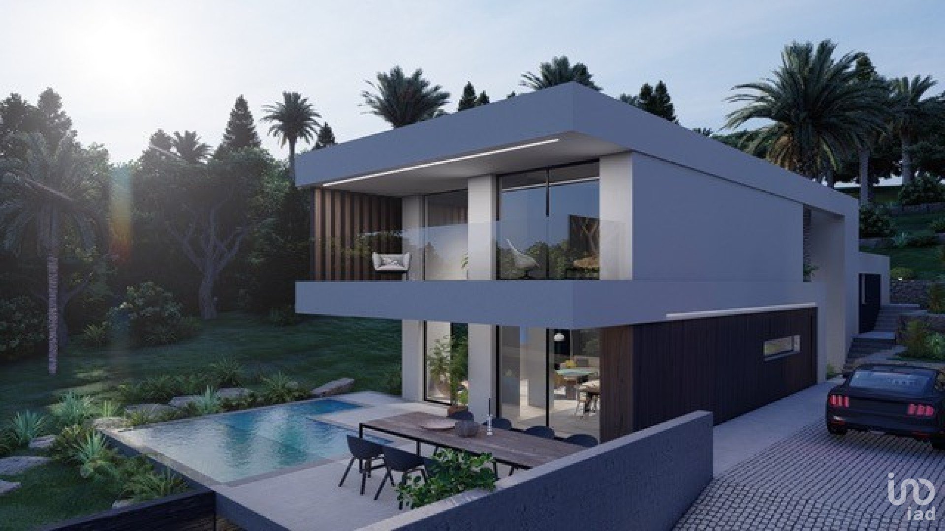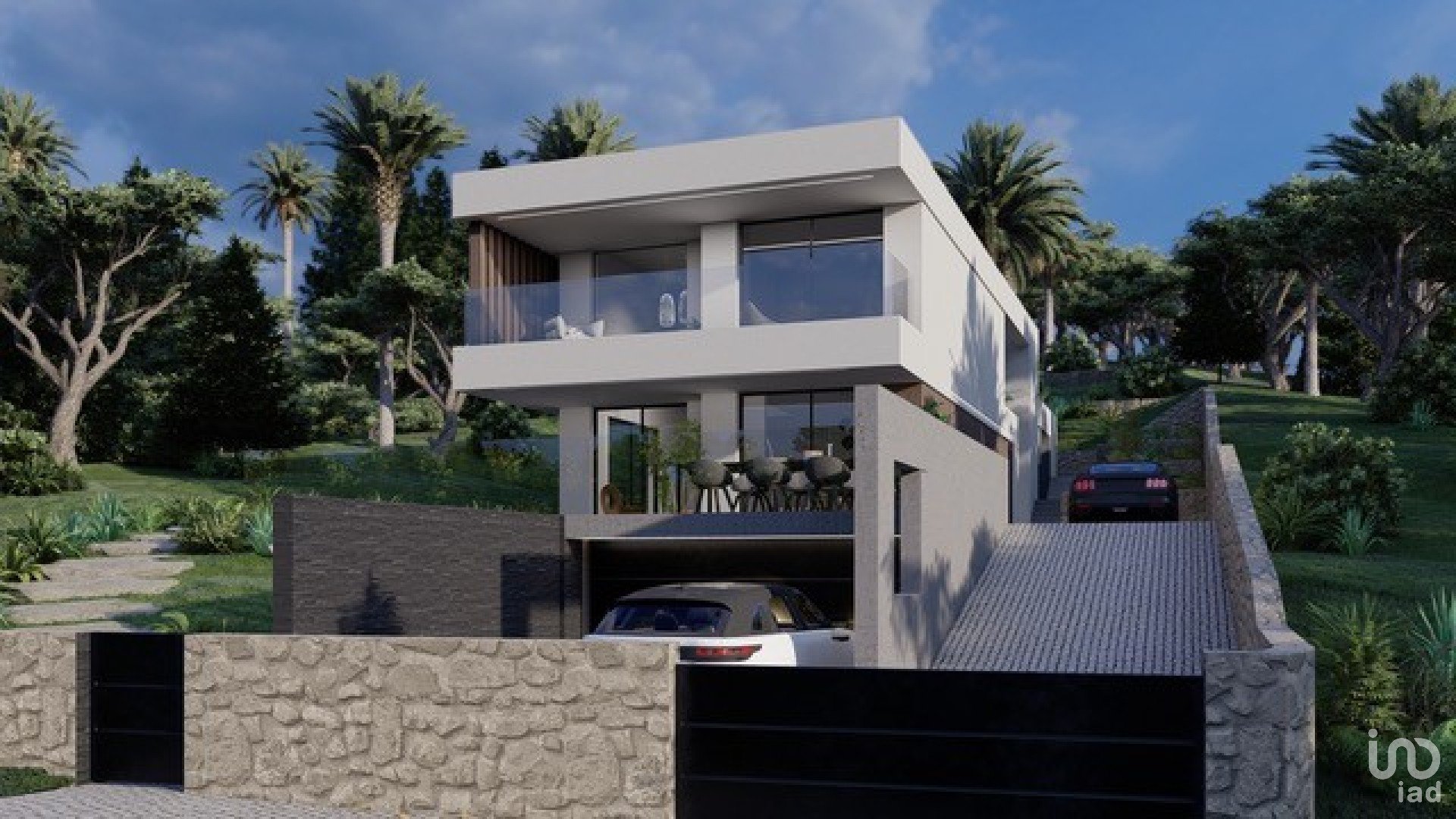 O projeto corresponde a uma moradia moderna, tendo a casa 2 pisos, uma cave e uma ampla zona de piscina e jardim.