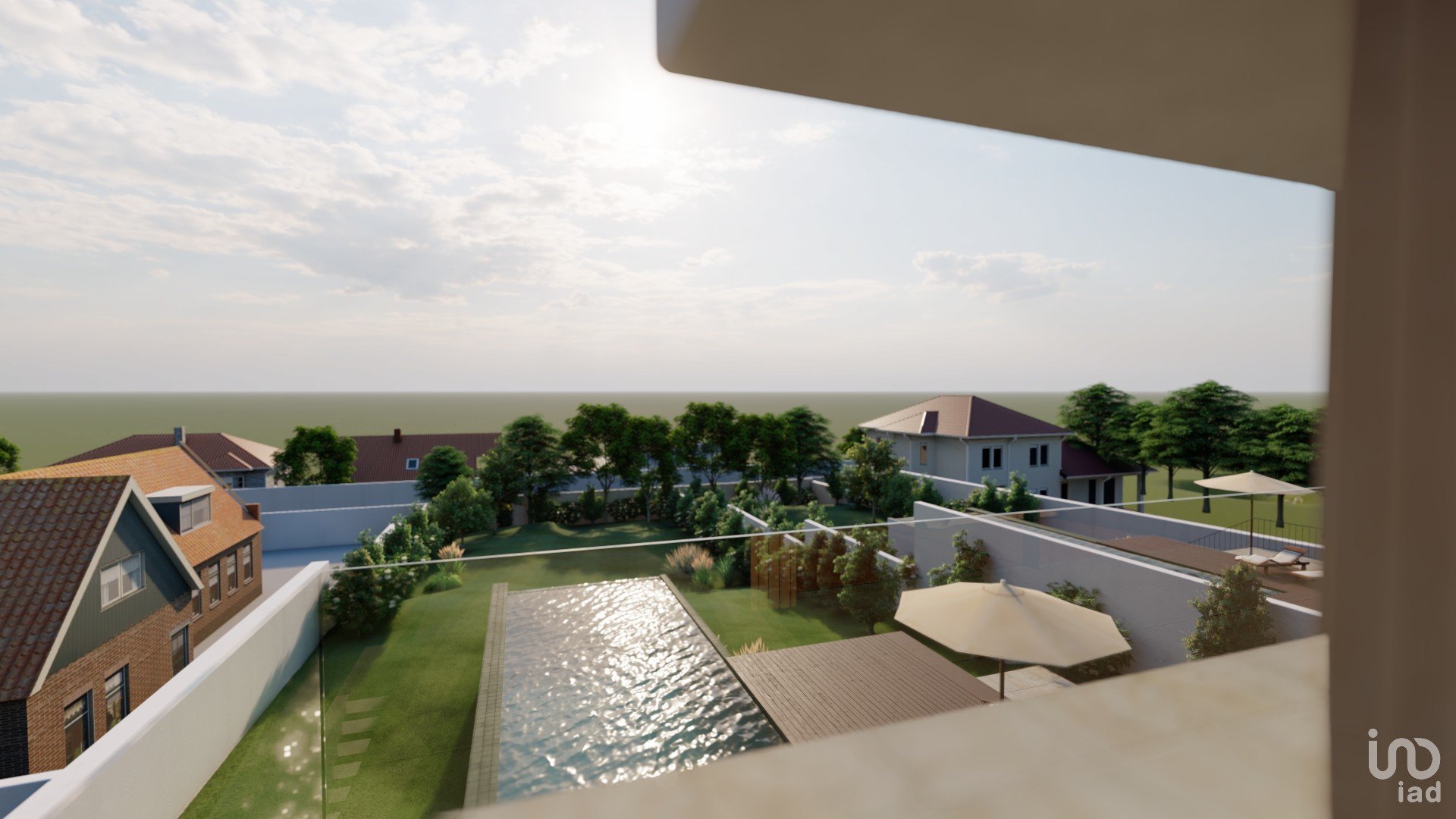 Salão em open space com vista para a piscina_39,40 m2_ que se estende por um magnifico terraço de 67,70 m2