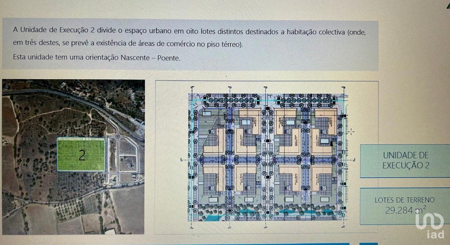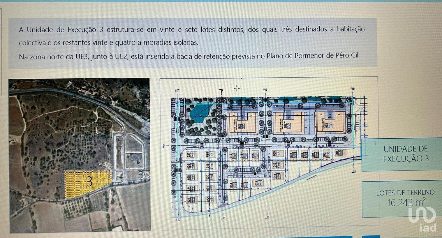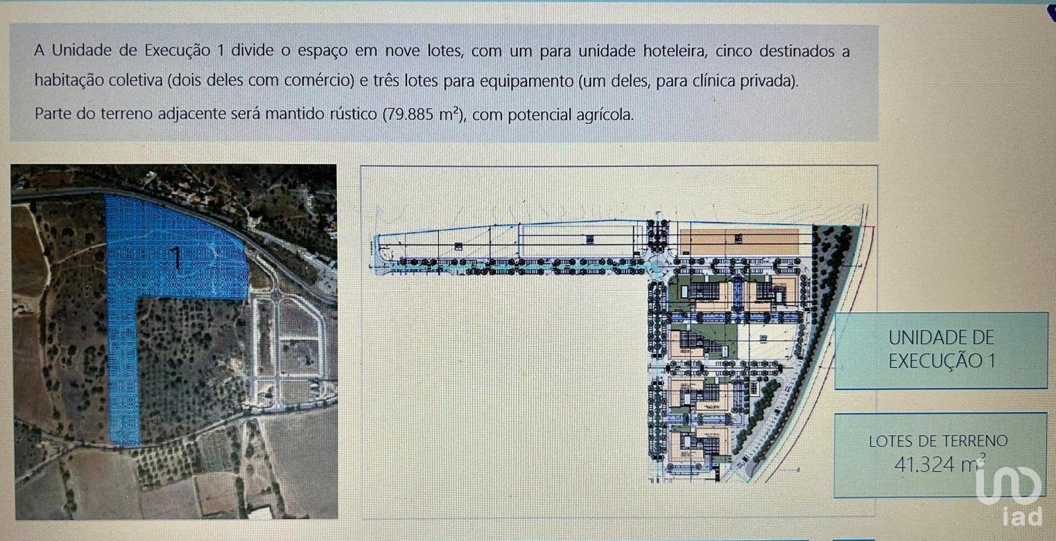 Unidade de Execução 3 (UE3) 27 lotes: 3 para habitação coletiva 24 para moradias isoladas, inclui bacia de retenção prevista no plano Área Rústica 79.885 m² destinados a uso agrícola. Potencial para culturas vinícolas e frutícolas.