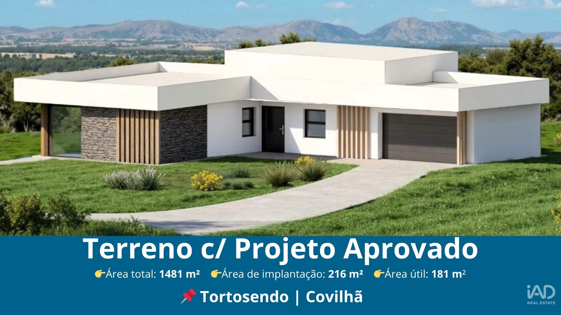 A moradia apresenta uma área de implantação de 216 m² e uma área útil de 181 m², distribuída de forma equilibrada entre as zonas sociais e privadas, garantindo conforto, funcionalidade e total aproveitamento do terreno.