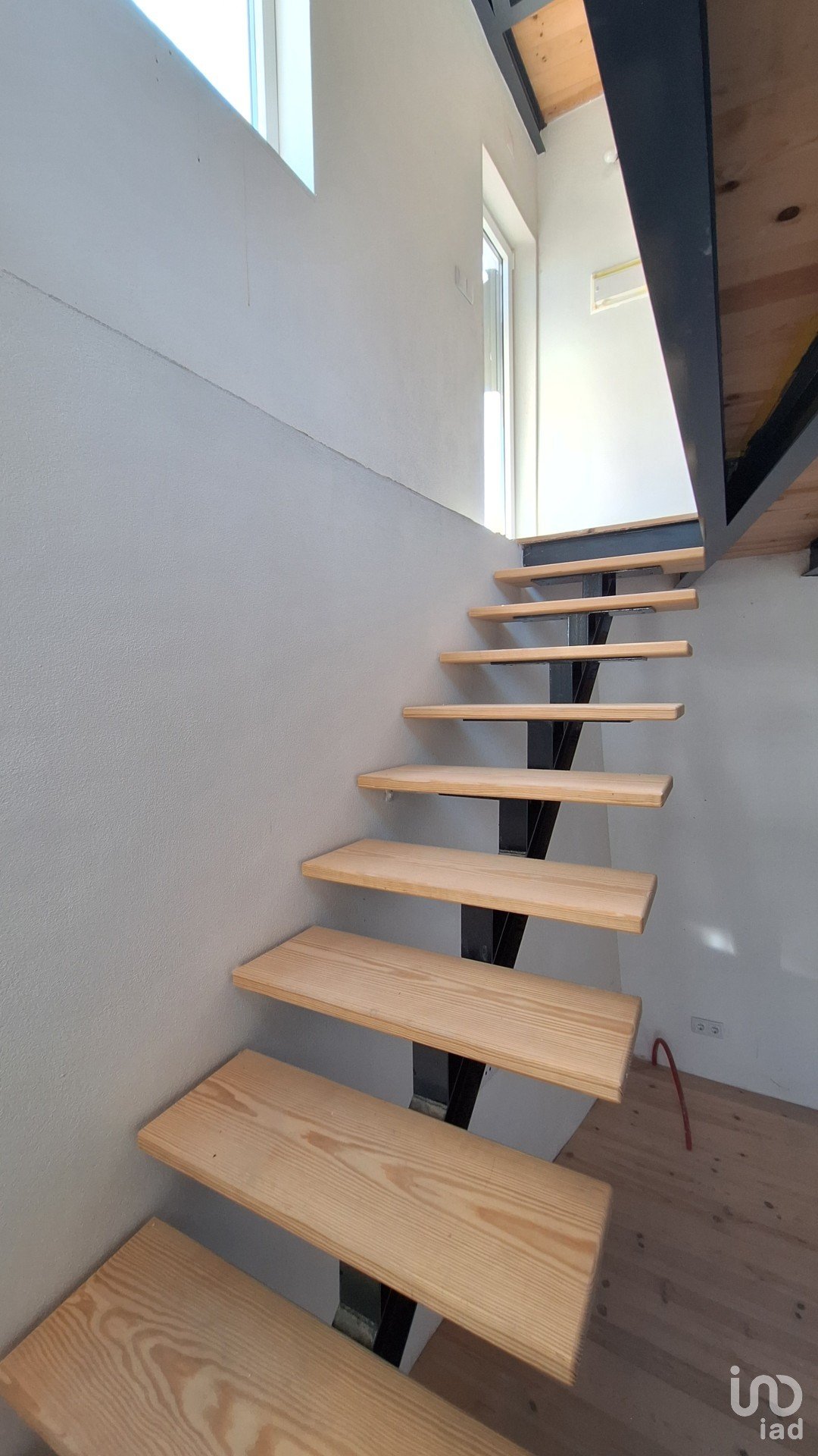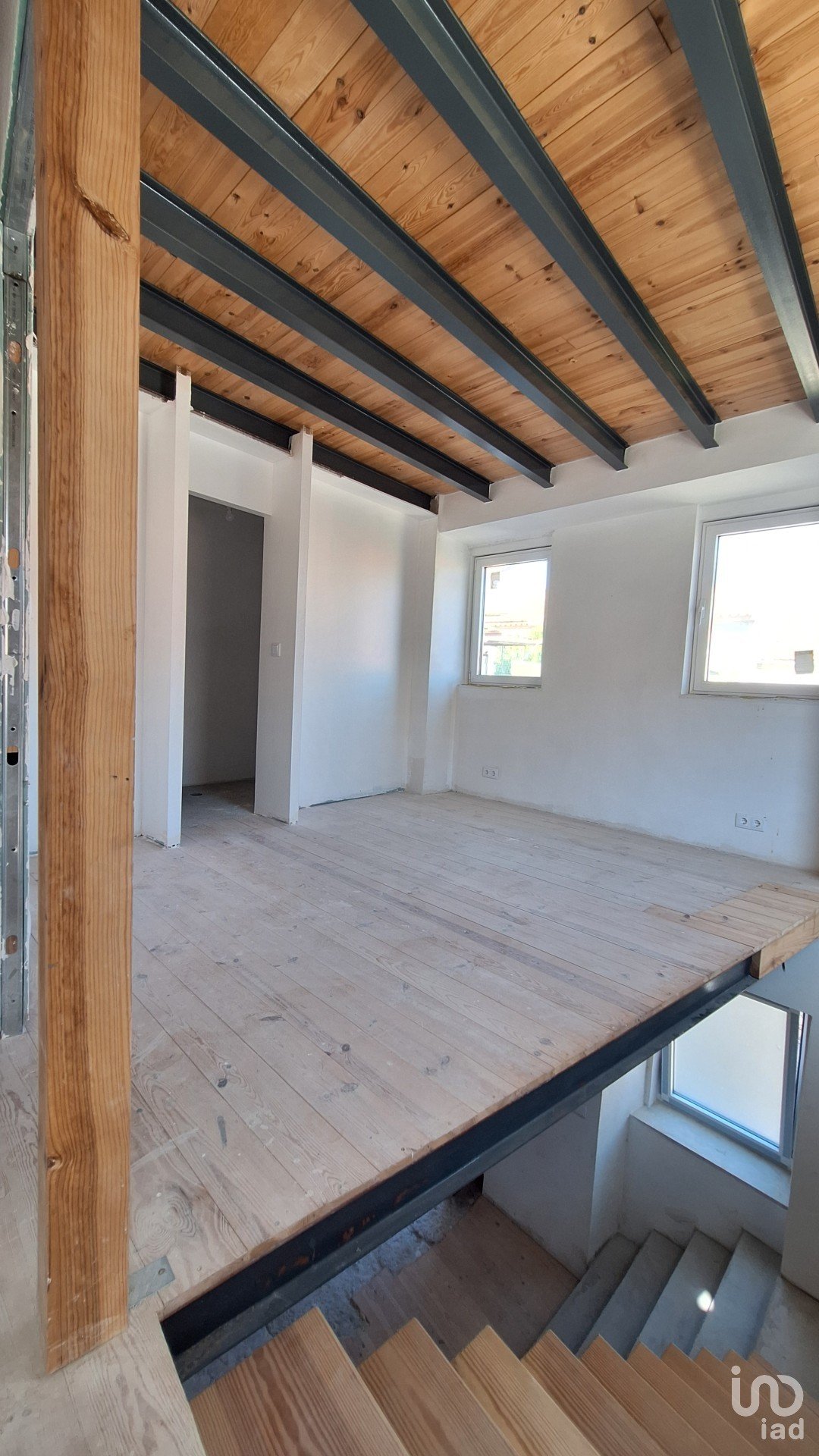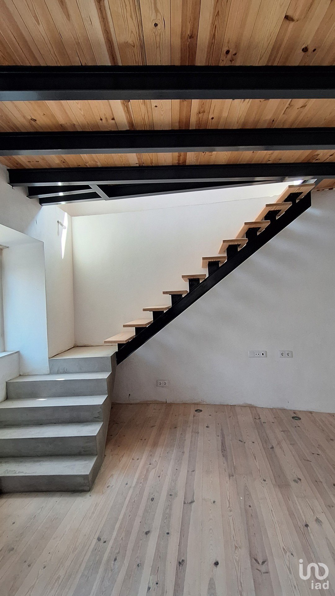 Wooden stairs with iron frames lead to the middle and upper floors, where spacious, versatile spaces can be configured as bedrooms, offices, or living rooms, each with its own bathroom.