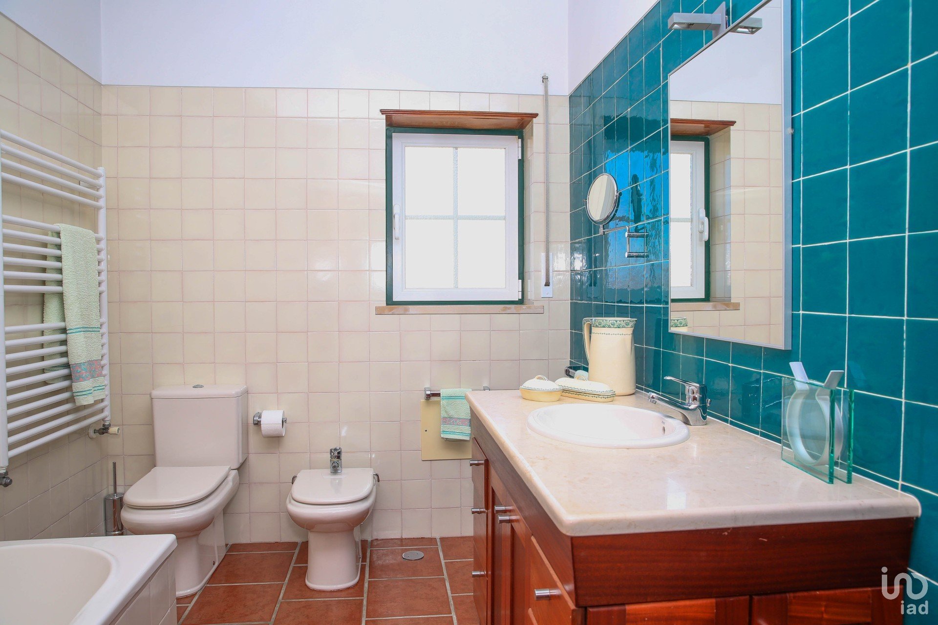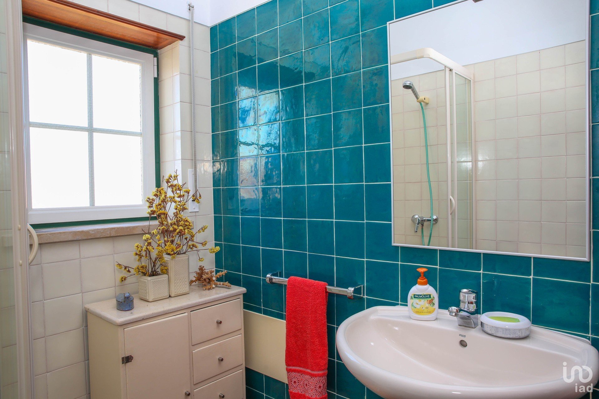 Bathroom with shower and timeless Viúva Lamego tiles.