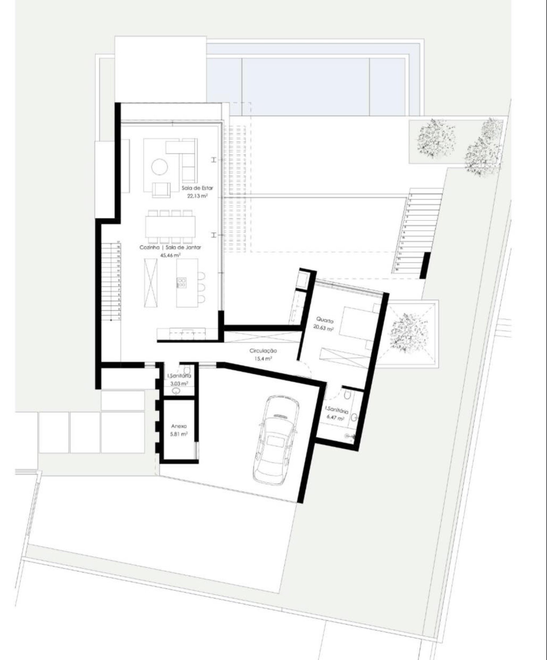 dotado de instalação sanitária. Possui ainda um alpendre para dois automóvel, anexo e espaços