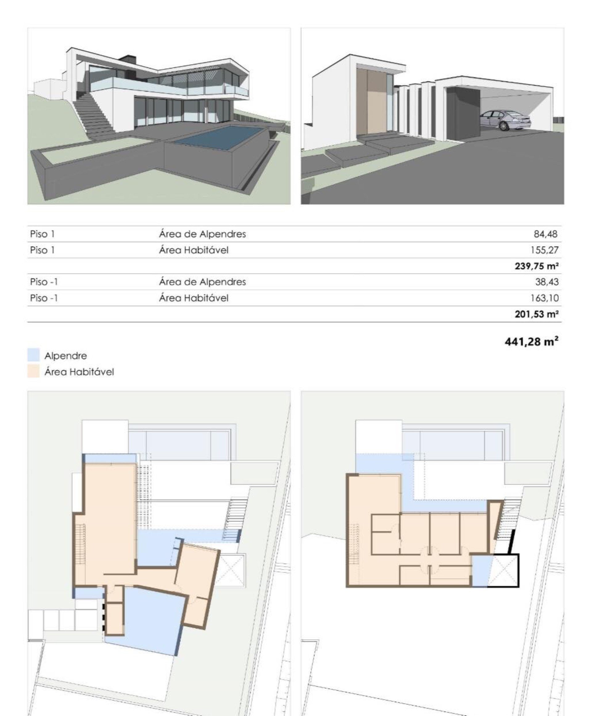 Moradia de dois pisos, de arquitetura contemporânea, de tipologia T4 com abrigo automóvel.