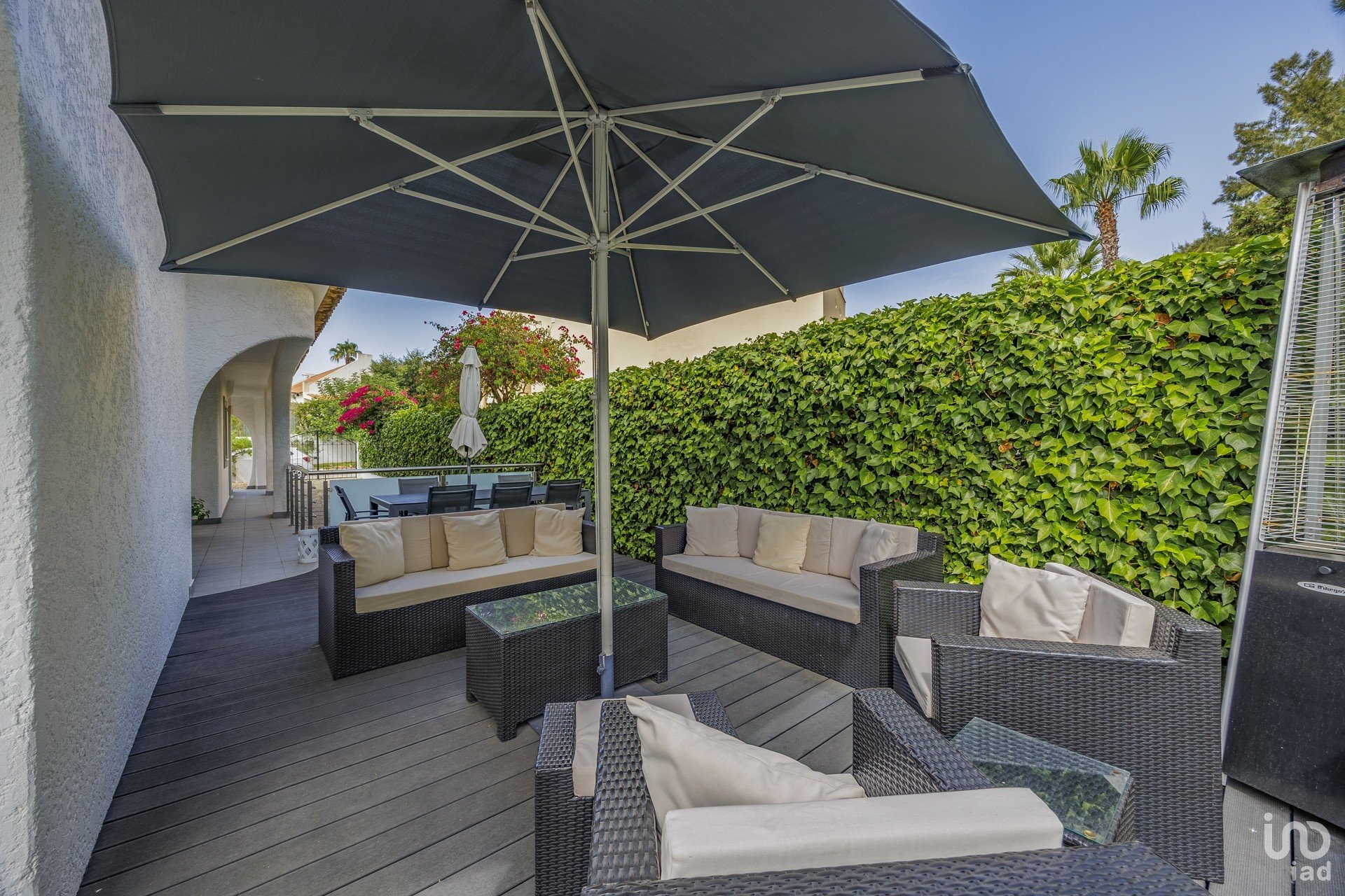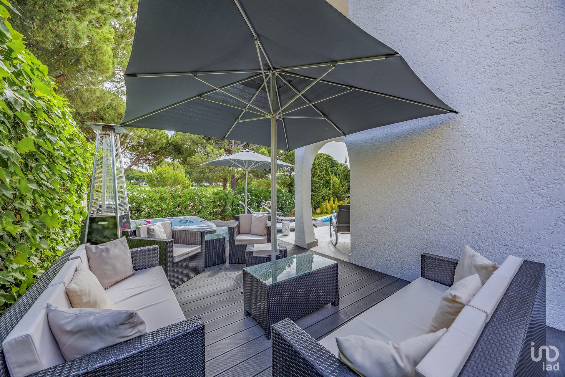 area with rattan furniture and a hot tub for relaxing.