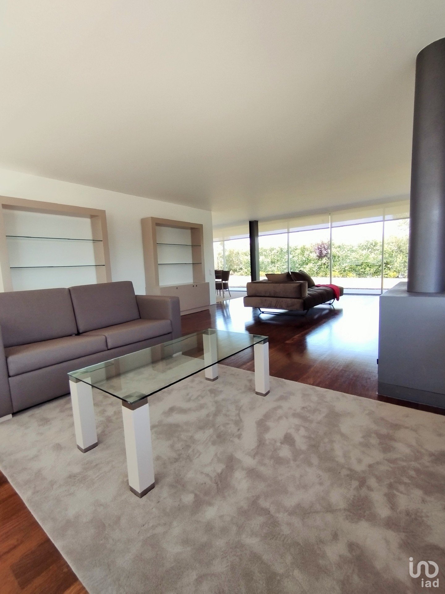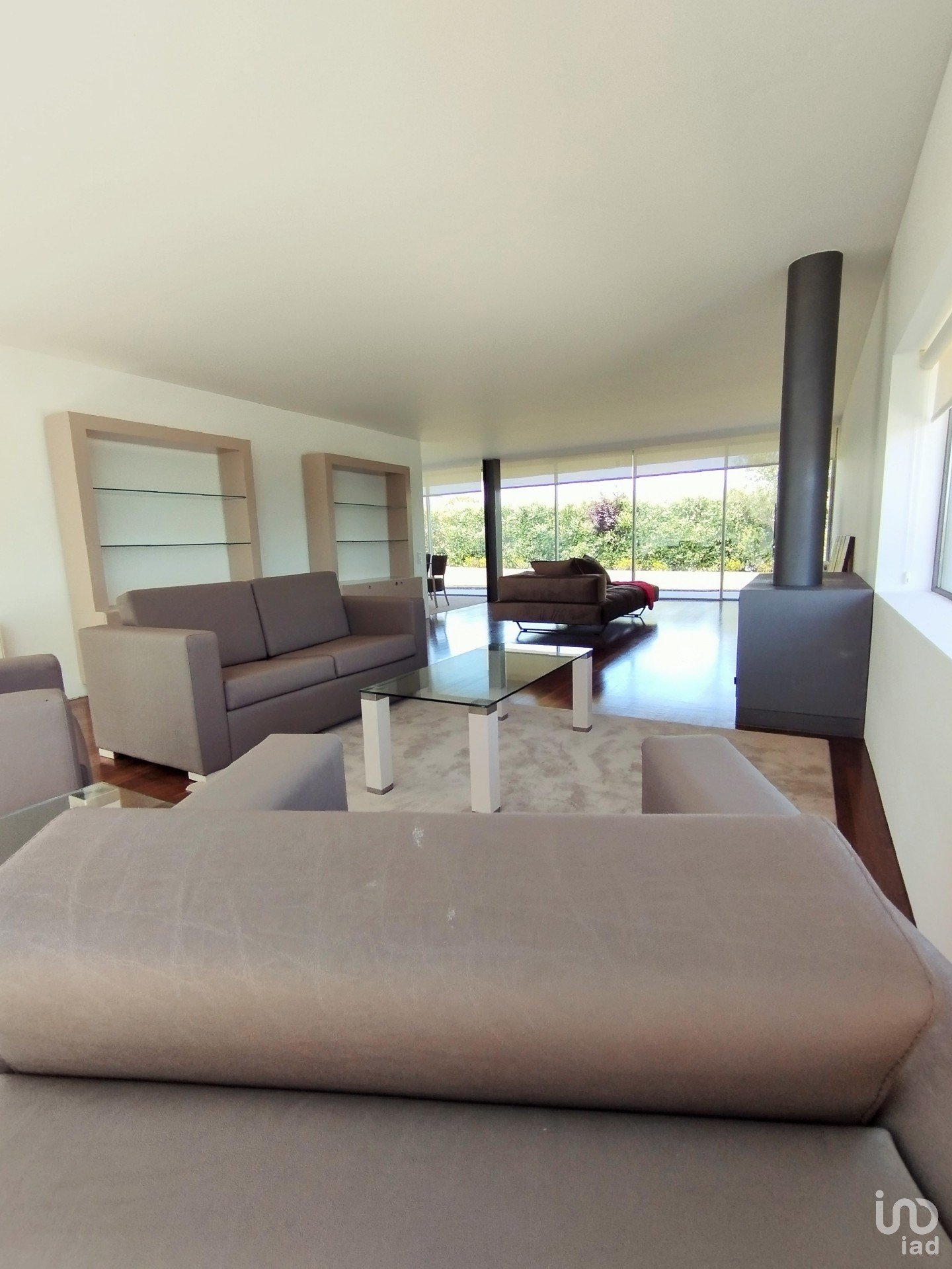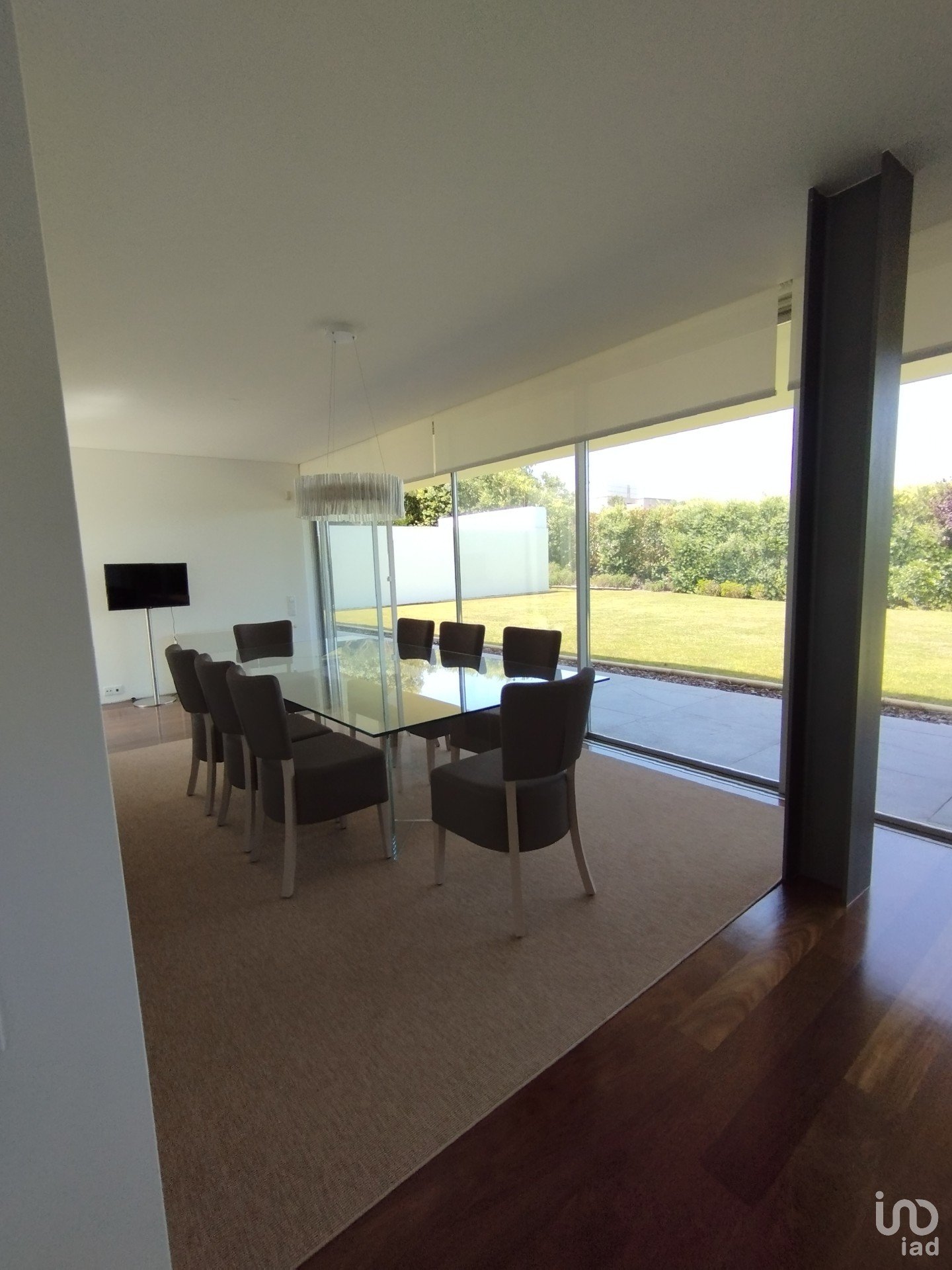 Living room with 50m2, very bright and with fireplace. Dining room facing the garden. Living room and dining room communicate with the exterior space of the house through large glass doors which open completely.