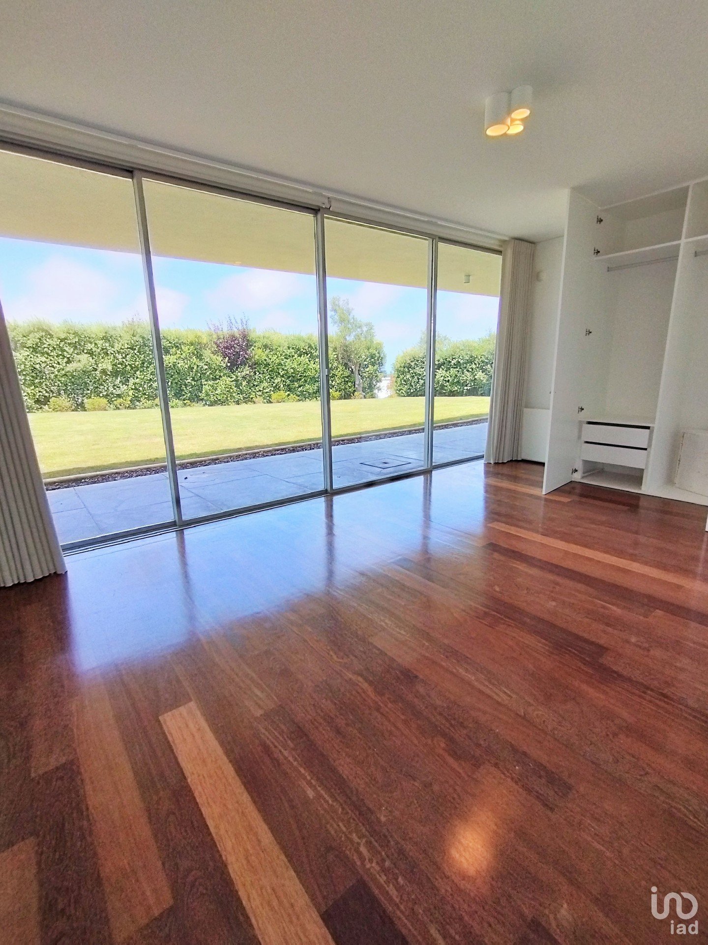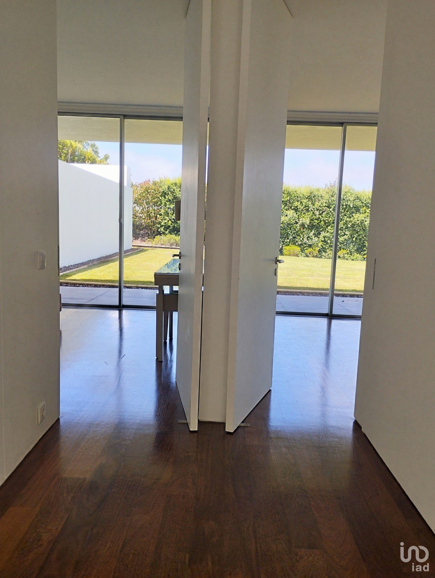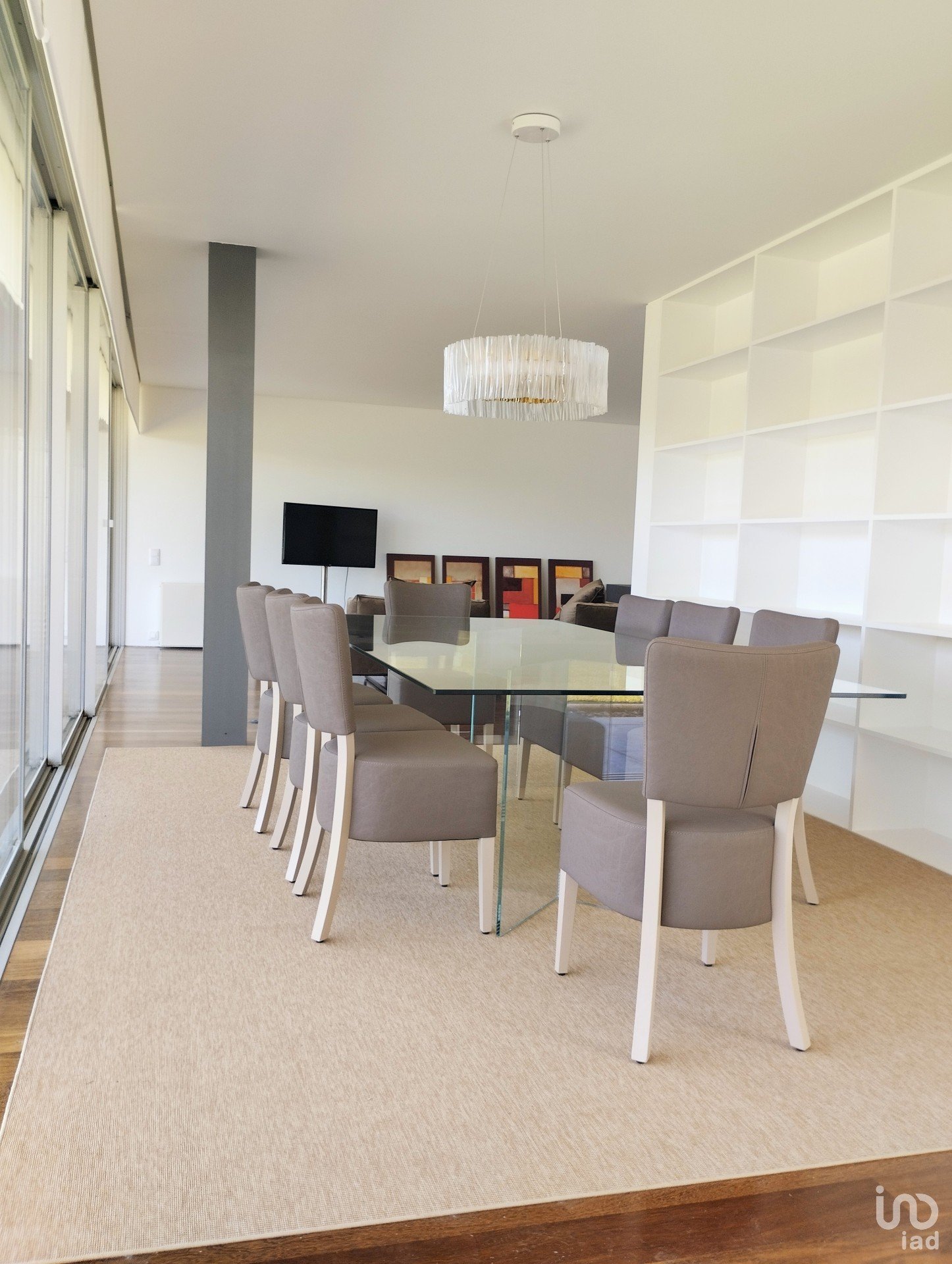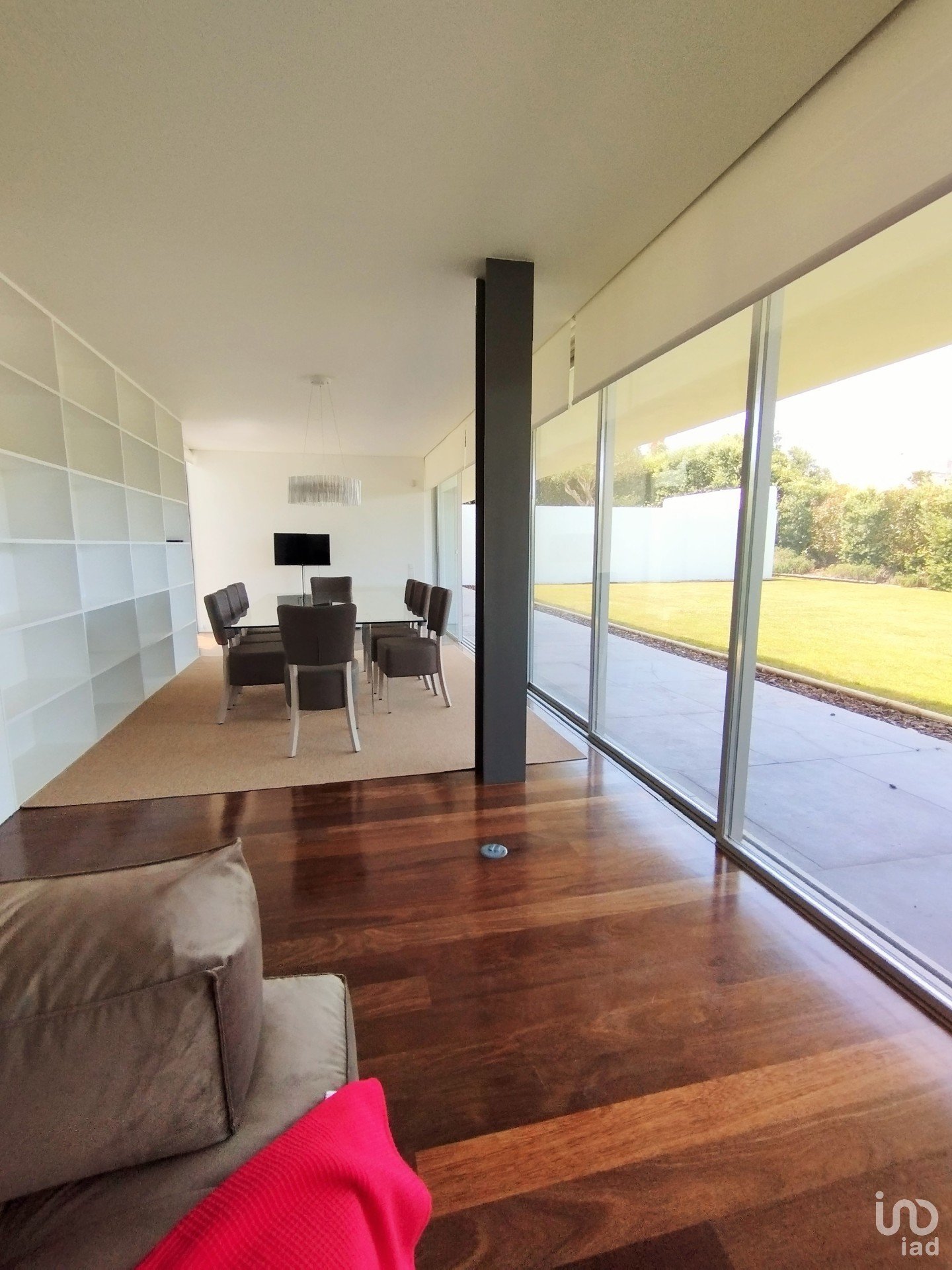 Living room with 50m2, very bright and with fireplace. Dining room facing the garden. Living room and dining room communicate with the exterior space of the house through large glass doors which open completely.