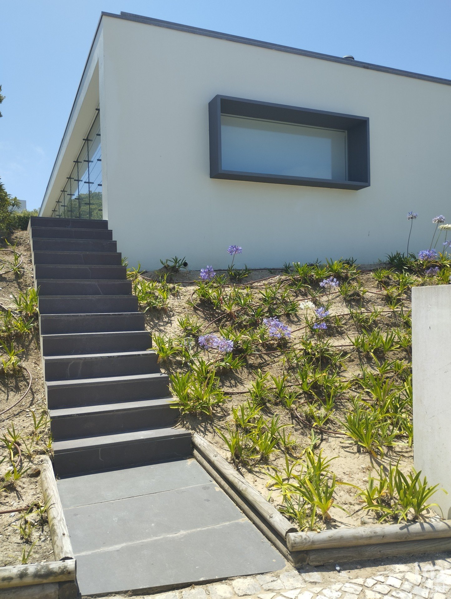 Outside, in the highest part of the garden, we find the swimming pool which maintains the same concept of straight and simple lines similar to the architecture of the house.