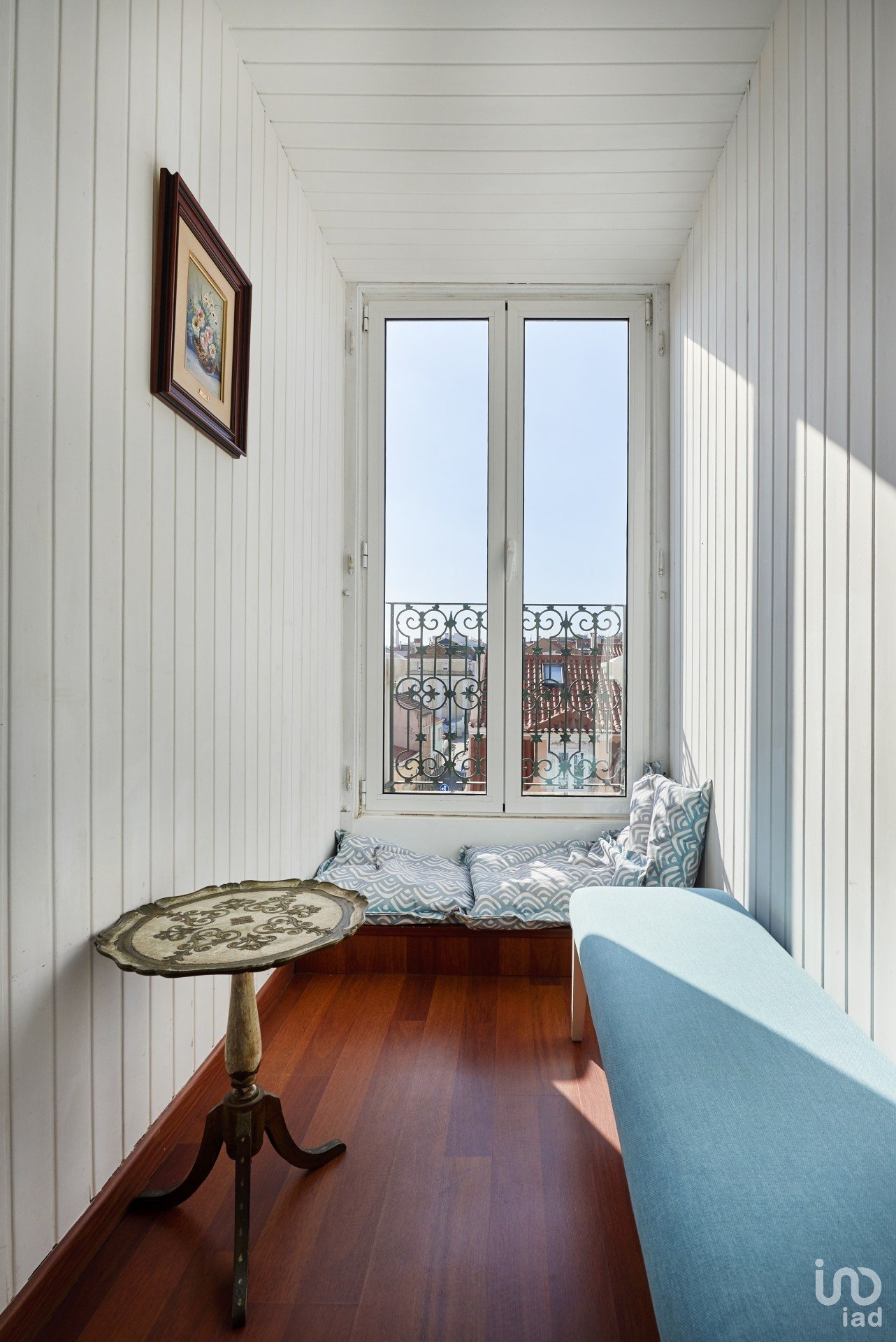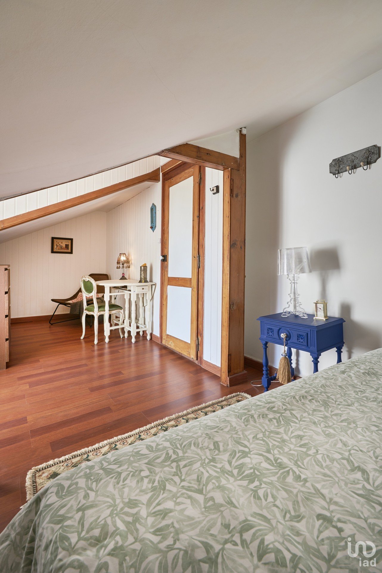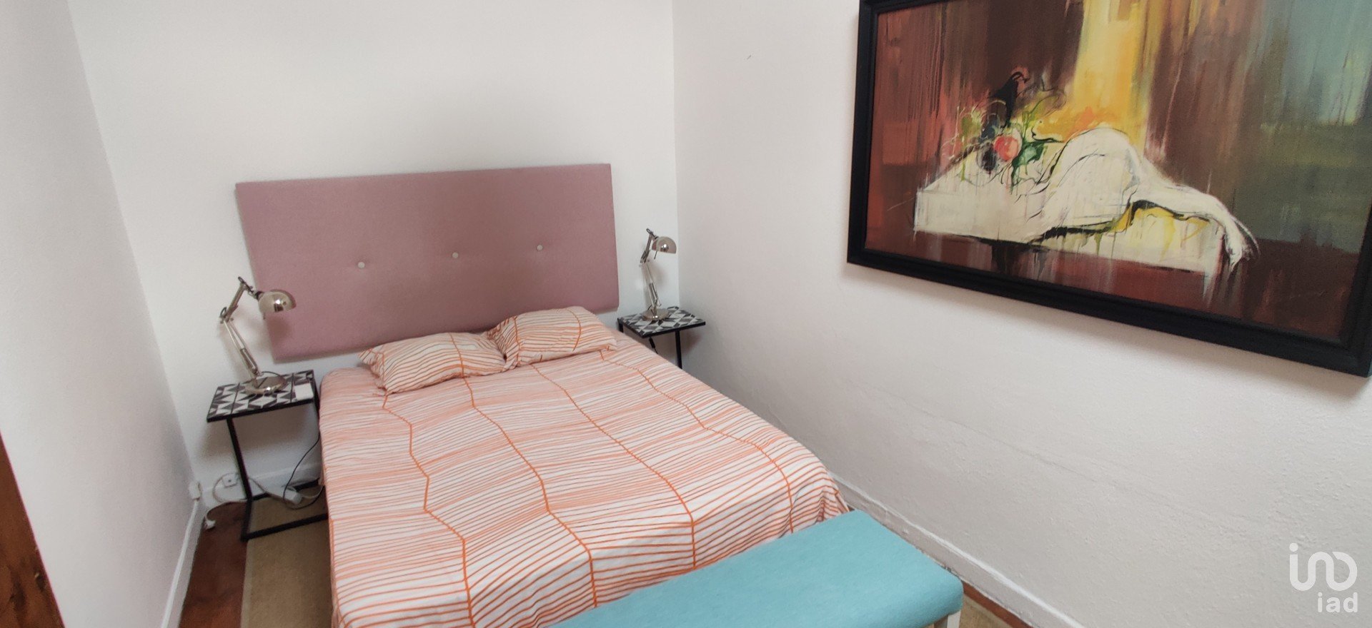 A porta do apartamento abre para um corredor que dá acesso a todas as divisões da casa. Numa das extremidades há um quarto com uma ampla cama de solteiro, mas com espaço para mais uma se for necessário. Há uma janela ampla e uma varanda estreita com vista para a rua abaixo.