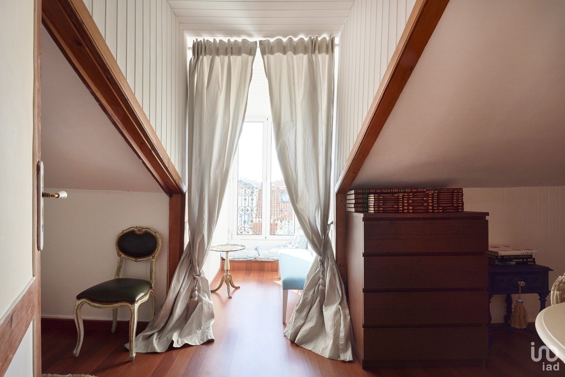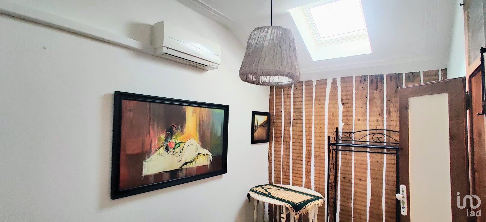 O outro quarto tem ar-condicionado, cama de casal, mesinhas de cabeceira com candeeiros, mesa para trabalhar e cabide. É iluminado por uma janela velux grande.