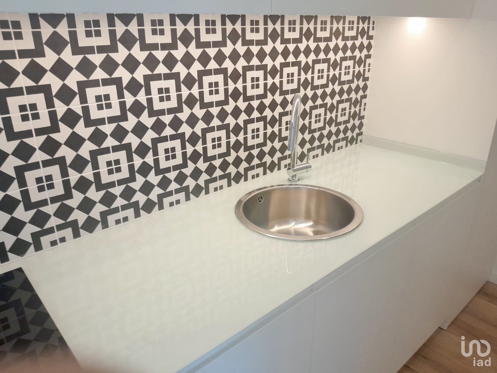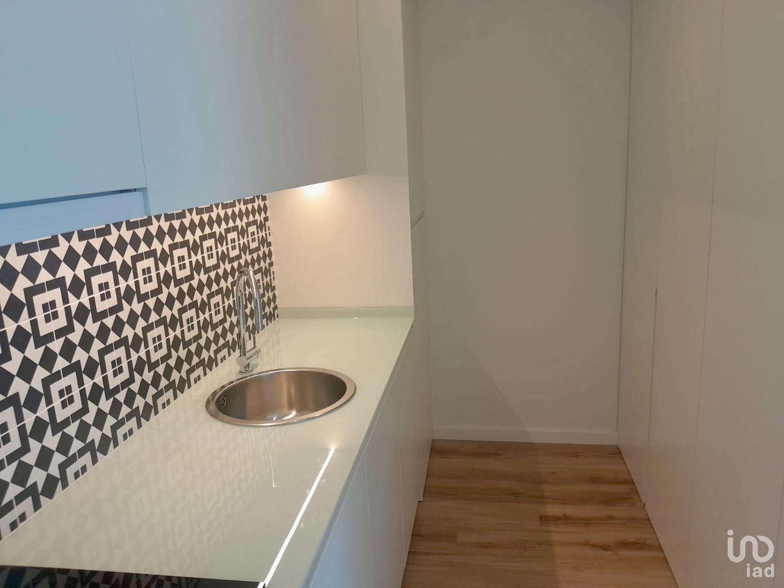 Cozinha equipada com exaustor, placa vitrocerâmica e iluminação em fita LED por baixo dos móveis superiores