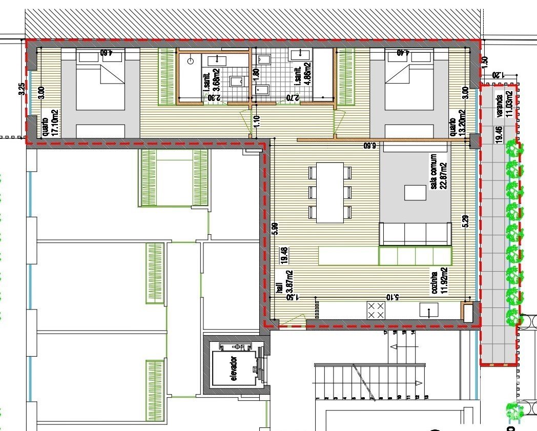 - 1 casa de banho de apoio ao quarto e area social (4,86 m2); 1 casa de banho da suite (3,68 m2)